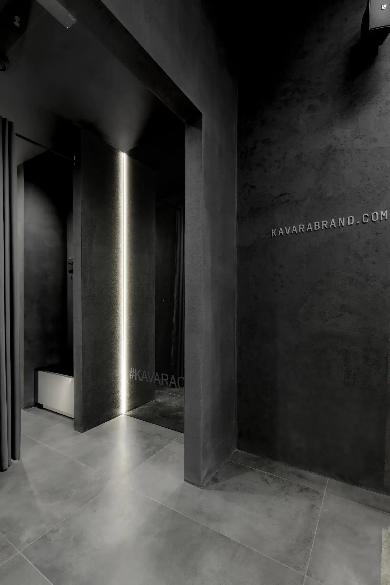 Молодые основатели бренда спортивной одежды KAVARA обратились к команде студии «Точка дизайна» с запросом на создание эффектного шоурума. Это был их первый магазин, поэтому к разработке интерьера все стороны подошли с большим энтузиазмом. В основу визуальной концепции легли подобранные заказчиками референсы, а еще брендбук и философия компании. В диалоге с клиентами зародилась идея о брутальной и обволакивающей атмосфере торгового зала. Полный отказ от ярких красок помог подчеркнуть индивидуальность продукта – пространство может показаться нарочито холодным, но синтез черно-серого монохрома и материалов подчеркивает строгость мужского характера. Современный стиль и смелая цветовая палитра без единого теплого оттенка отразили красоту самосозерцания и самосовершенствования, заложенную в «сердце» ДНК бренда.