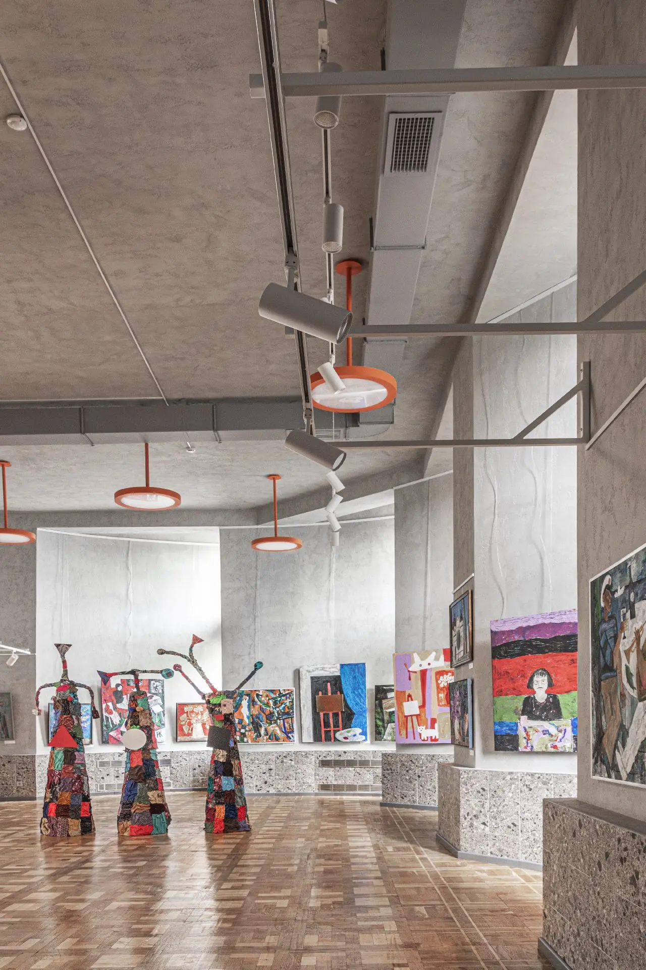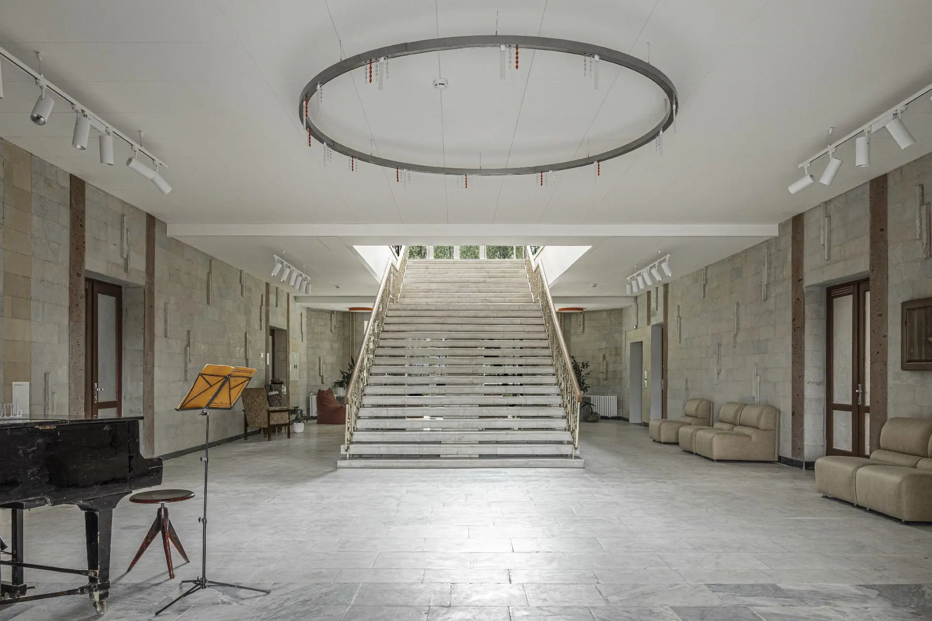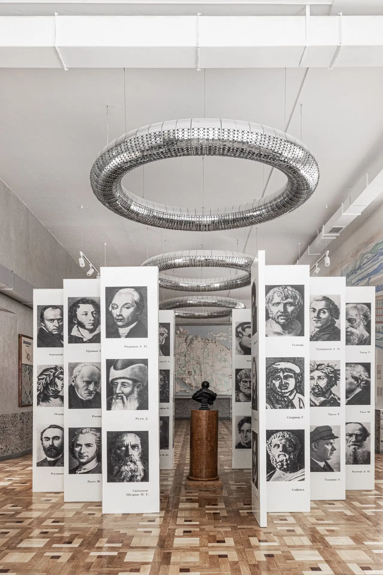 Холодная палитра цветов, использованных на фасадах, легла в основу интерьерных решений. Мурманская область, к которой относятся Апатиты, расположена в северном регионе и соседствует со Скандинавскими странами. Активный культурный обмен с Данией, Финляндией и Швецией повлиял на визуальные предпочтения горожан. Привычные сочетания серого, белого и красного интуитивно понятны местным жителям, поэтому их решили сохранить и дополнить фактурными деталями. Мебель в проекте довольно нейтральная: стулья из светлого дерева, отреставрированные кресла и перетянутые диваны не изменяют прежнее настроение интерьера, а просто делают его более современным. Бархатистые ткани обивок сбалансировали строгие отделочные материалы — природный мрамор, характерный для советских учреждений ракушечник и декоративную штукатурку под бетон на стенах одного из залов. Анастасия Юхневич и другие дизайнеры старались во всем сохранить и достоверно повторить оригинальную отделку: даже поврежденный временем кусок мрамора был заботливо заменен подобранным в тон материалом. Ощущением уюта и тепла интерьер наполнили яркие акценты — в том числе, оранжевые светильники, отсылающие к образу солнца. Его силуэт часто дублируется в круглых коврах, а оттенок — в текстиле и декоре. Симметрии и дополнительного объема в помещение привнесли зеркальные потолки и гипсовая лепнина. Специальная система освещения с разными сценариями была разработана командой студии вместе с петербургскими светодизайнерами MDM Light. В дизайн-проект были интегрированы лаконичные лампы и абажуры, которые облегчили торжественность найденных на Авито люстр под хрусталь. Так, обычная городская библиотека в Апатитах превратилась в культурный центр, миссия которого — сделать литературу и искусство более доступными для жителей города. Благодаря обновлению пространства они больше вовлекаются в современный контекст и обретают место для общения и досуга. Здесь проводятся кружки, концерты, встречи по интересам и детские развивающие мероприятия. В работе над проектом участвовали десятки неравнодушных людей — дизайнеры и архитекторы, представители администрации, губернатор области и телеведущий Андрей Малахов. По инициативе последнего к оформлению пространства присоединился художник Валерий Чтак: из-под его руки вышли аккуратные росписи на стенах галереи. Фрески, пострадавшие из-за потопа в ходе ремонта, восстанавливали при помощи выпускников Суриковского училища. Им удалось передать авторскую стилистику изображений и дух разных временных периодов, от образов Кирилла и Мефодия до Владимира Маяковского.