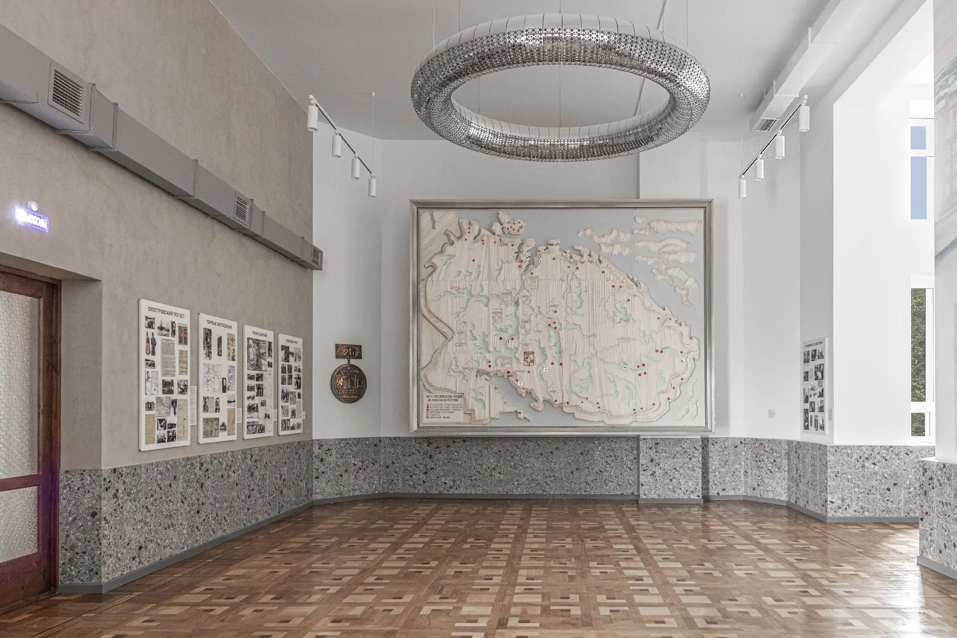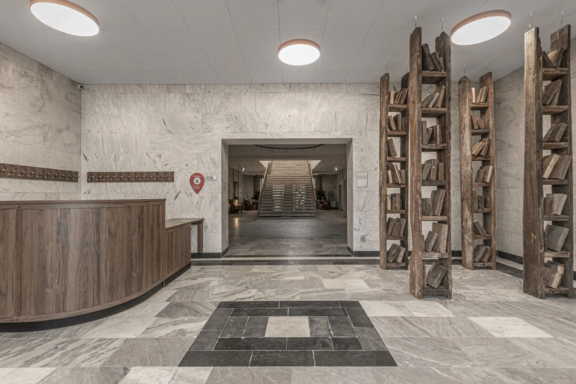 Модернистская архитектура здания и богатая история локации вдохновили дизайнеров на сохранение советского наследия. Они сфокусировались на бережном восстановлении исходных архитектурных особенностей и материалов — песчаника, мрамора, паркета и «парящей» лестницы. При создании визуальной концепции проекта команда студии «Точка дизайна» вдохновлялась эстетикой советской эпохи. Например, необычными фасадами: из-за назначения здания в выполненных в форме флагштоков изгибах люди стали узнавать страницы открытой книги. Архитекторы дополнили их контурной подсветкой, благодаря которой мягкие линии смотрятся особенно интересно в течение полярной ночи. Работа над интерьером началась с обновления инженерных коммуникаций и вентиляции. Первоначальная планировка объекта была удачной, поэтому основные функциональные блоки остались на прежних местах. Изменения коснулись только хозяйственных помещений, которые соседствовали с лифтовой зоной: их пришлось уменьшить, чтобы сделать пространство более инклюзивным. Высокие окна наполнили залы естественным светом, а воссозданное историческое остекление придало сложную игру бликов и отсветов на полу и стенах.