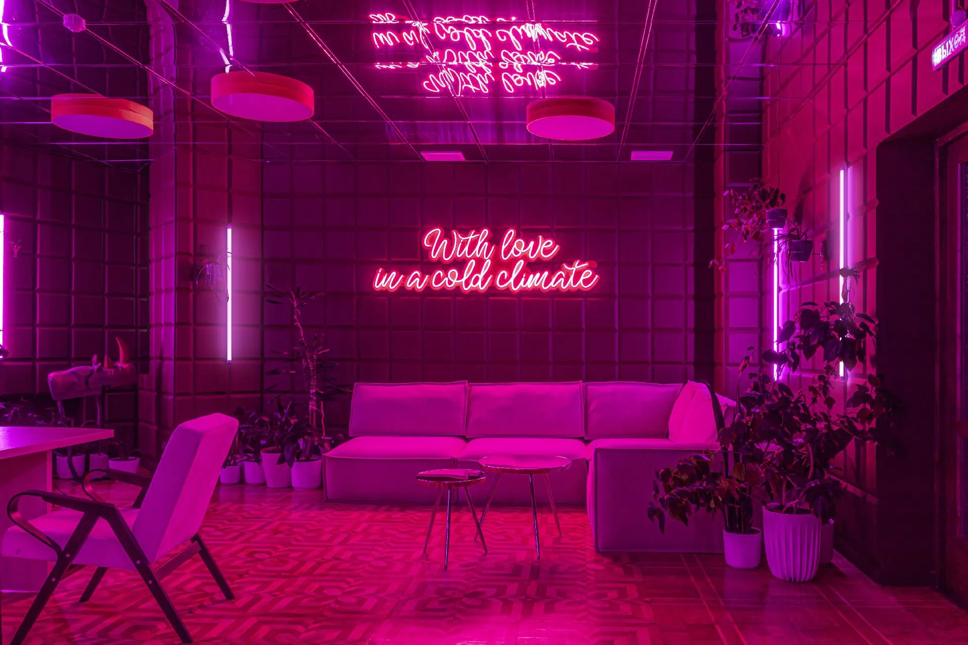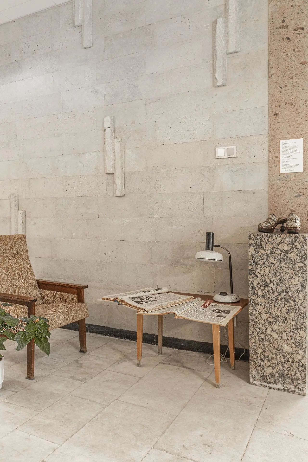 Площадь верхнего этажа была разделена между краеведческим музеем, современным выставочным пространством и концертным залом с роялем. Три года назад в этом самом месте проходила выставка работ из коллекции Андрея Малахова «В холодном климате, с любовью», сразу после которой библиотеку закрыли на реконструкцию. То есть еще до преображения здания оно уже начало работать по-новому: события стали более масштабными, возрос интерес жителей к библиотеке. Более того, именно организованная московскими дизайнерами и куратором Кристиной Дрягиной выставка помогла привлечь внимание общественности к реконструкции здания и добиться увеличения бюджета. Всего за несколько недель команда студии «Точка дизайна» подготовила сильный дизайн-проект, который кратно превосходил предыдущий план реновации и был быстро согласован — так началась работа над проектом. Перед долгожданным открытием здесь появились постоянные и временные экспозиции, положившие начало насыщенной культурной программе. Ее художественный совет также разрабатывал вместе с Андреем Малаховым, который активно участвует в развитии своего родного города. В пространстве уже выставлялись картины Энди Уорхола и японского художника Такаши Мураками. Обновленный центр продолжит вовлекать жителей Апатитов в культурные процессы и ближе знакомить их с современным искусством. Особое внимание в проекте уделено небольшой комнате, которая изначально была оформлена дермантиновыми панелями. Во времена выставки «В холодном климате, с любовью» там сделали инсталляцию: расставили живые цветы и встроили УФ-лампы, напоминающие о местной традиции использования искусственного освещения для домашних растений. Тогда это пространство стало визитной карточкой библиотеки, а неоновая надпись с названием выставки натолкнула основателя студии «Точка дизайна» Степана Бугаева на идею о сочетании акцентного розового цвета с коричневой отделкой стен. В результате дермантин сменился гипсовыми панелями из-за требований пожарной безопасности, но расслабленная атмосфера и тактильные материалы были сохранены. Мягкие диваны с пастельно-розовой обивкой здесь соседствуют с большим столом и креслами в том же оттенке: оформление выглядит настолько неформальным и стильным, что даже глава городской администрации проводит там планерки и онлайн-встречи.