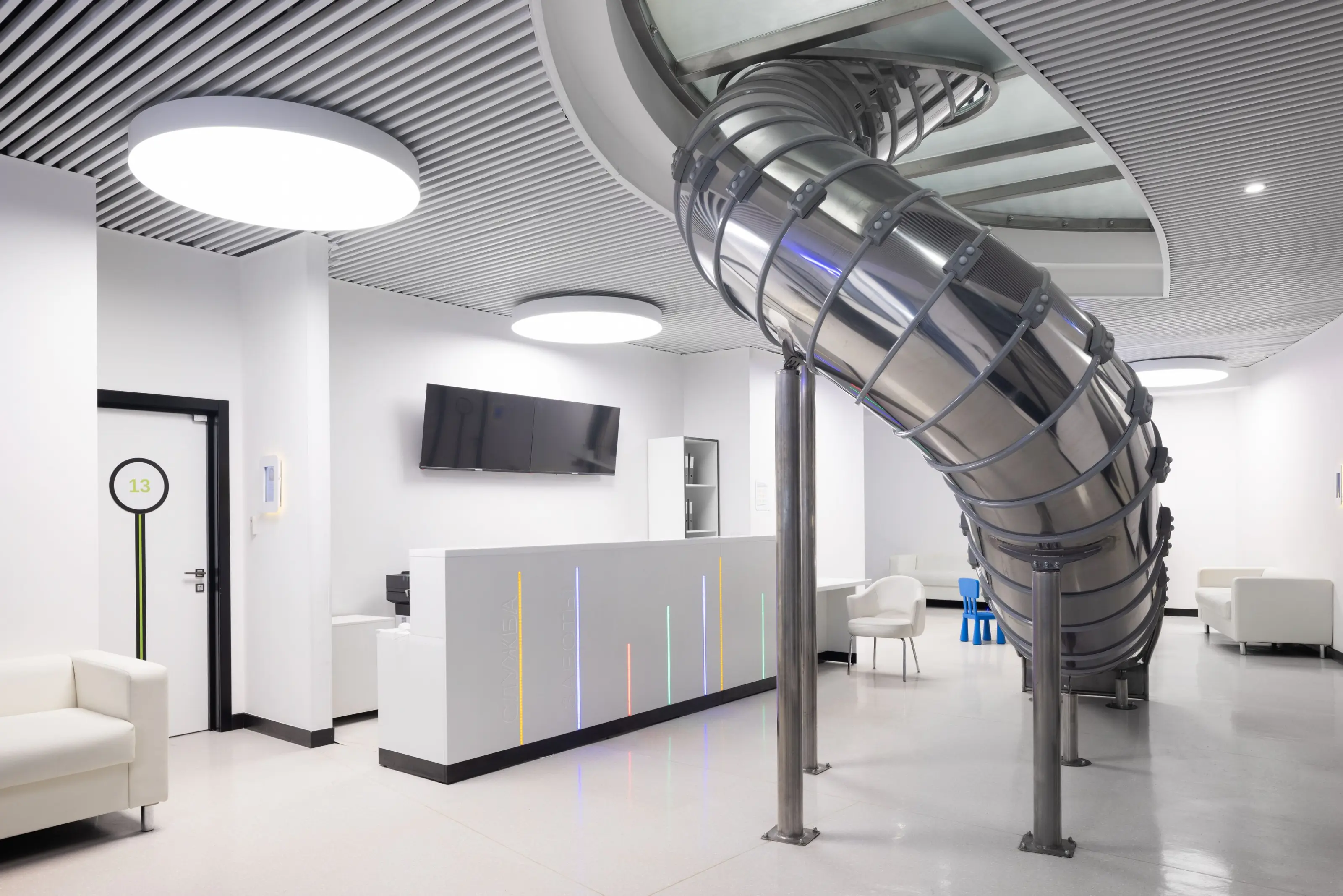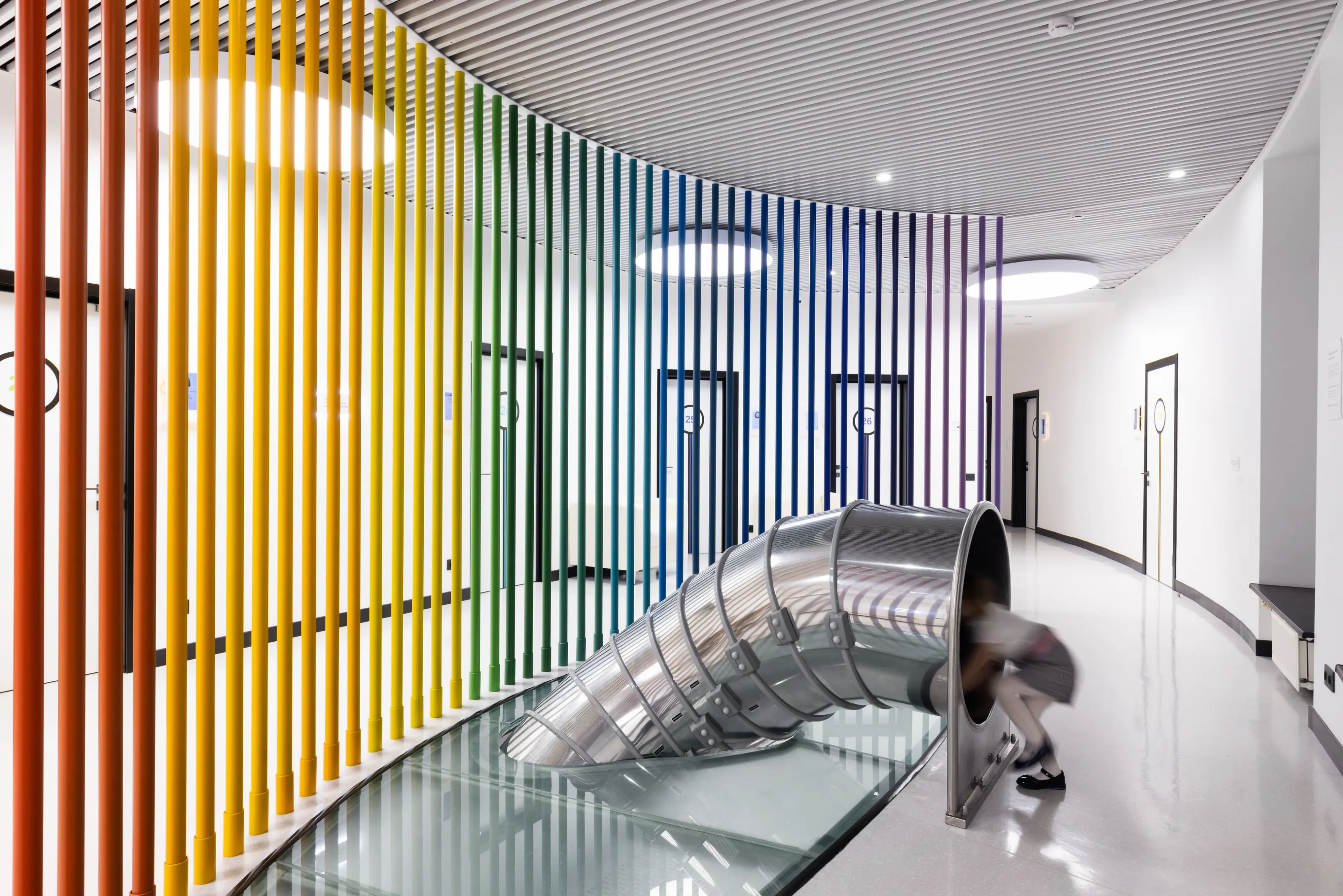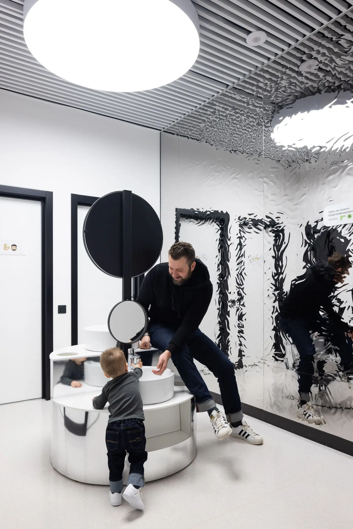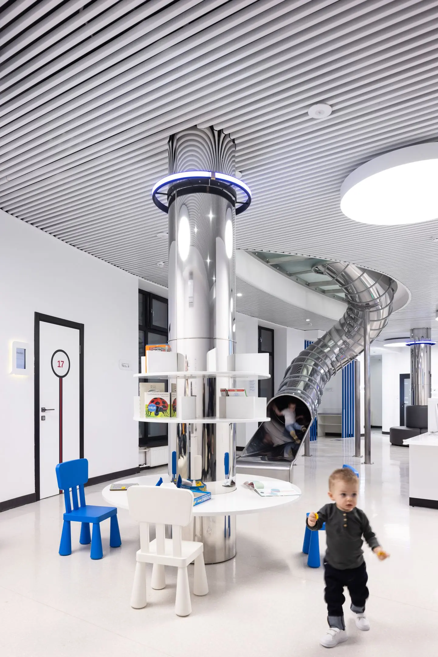Однако ощущение холодности нивелируется возможностью рисовать на стенах, управлять светодиодными светильниками, кататься с горки, соединившей два этажа, играть и читать в специально продуманных для этого зонах — яркими красками, которые способны привнести сами посетители центра.