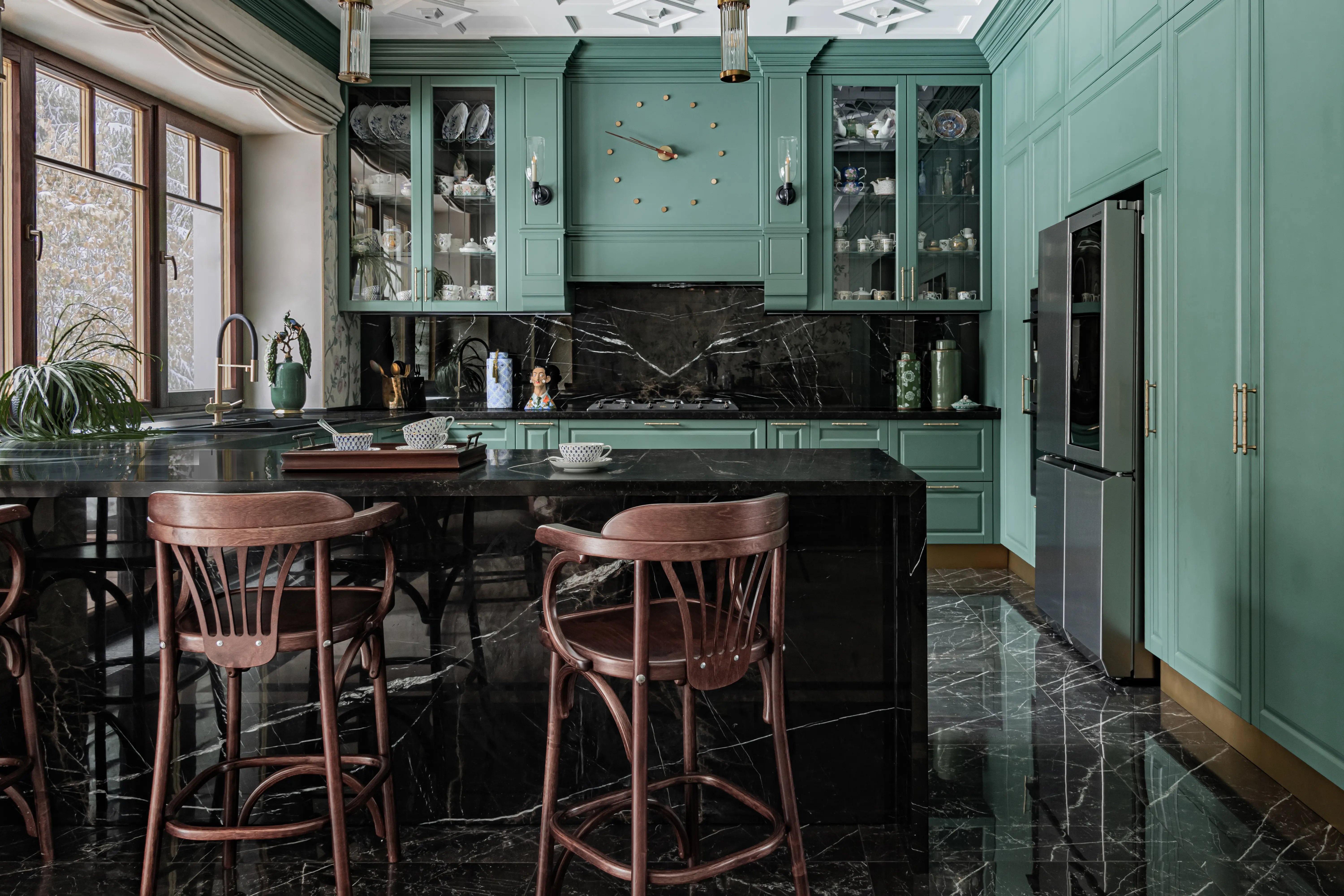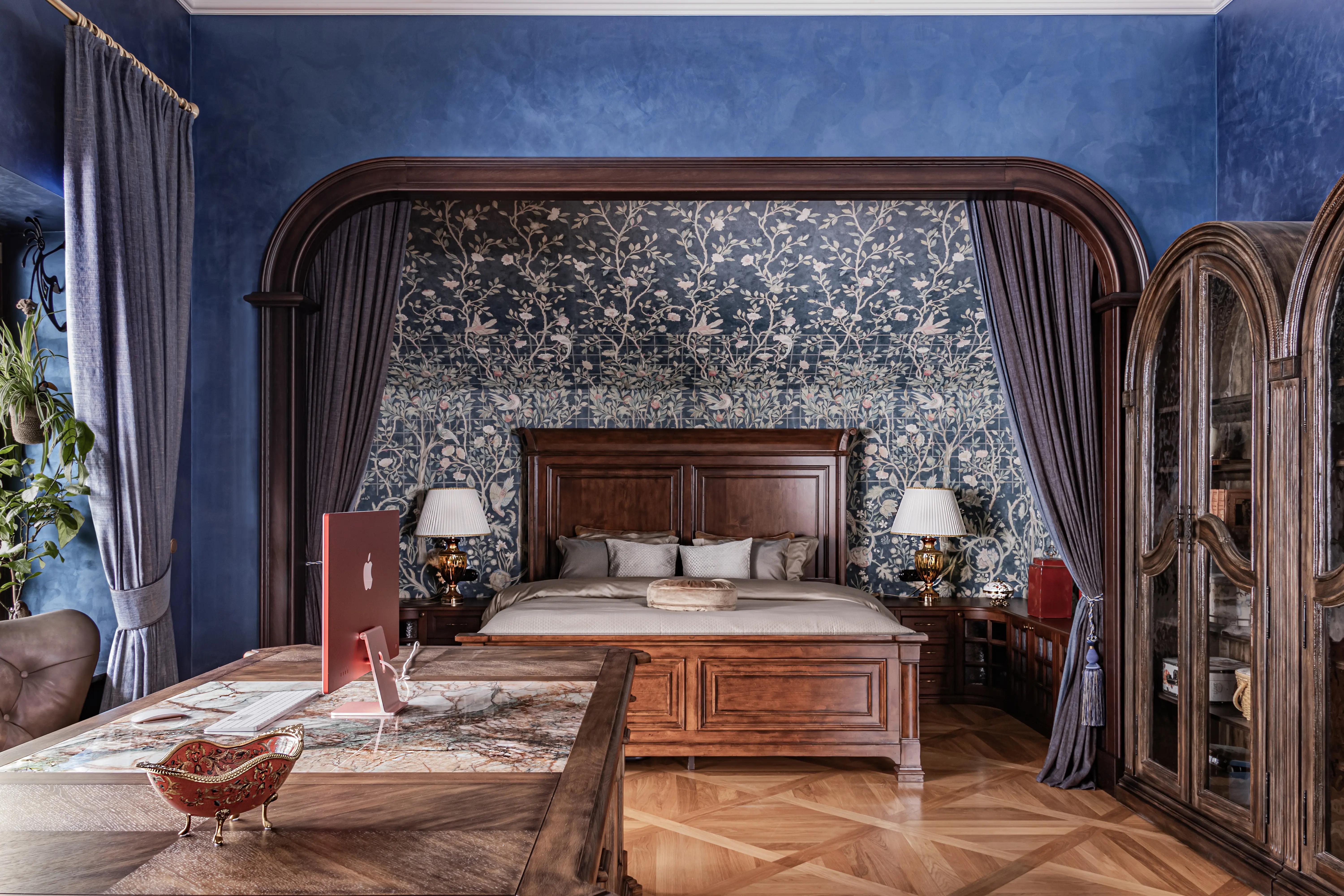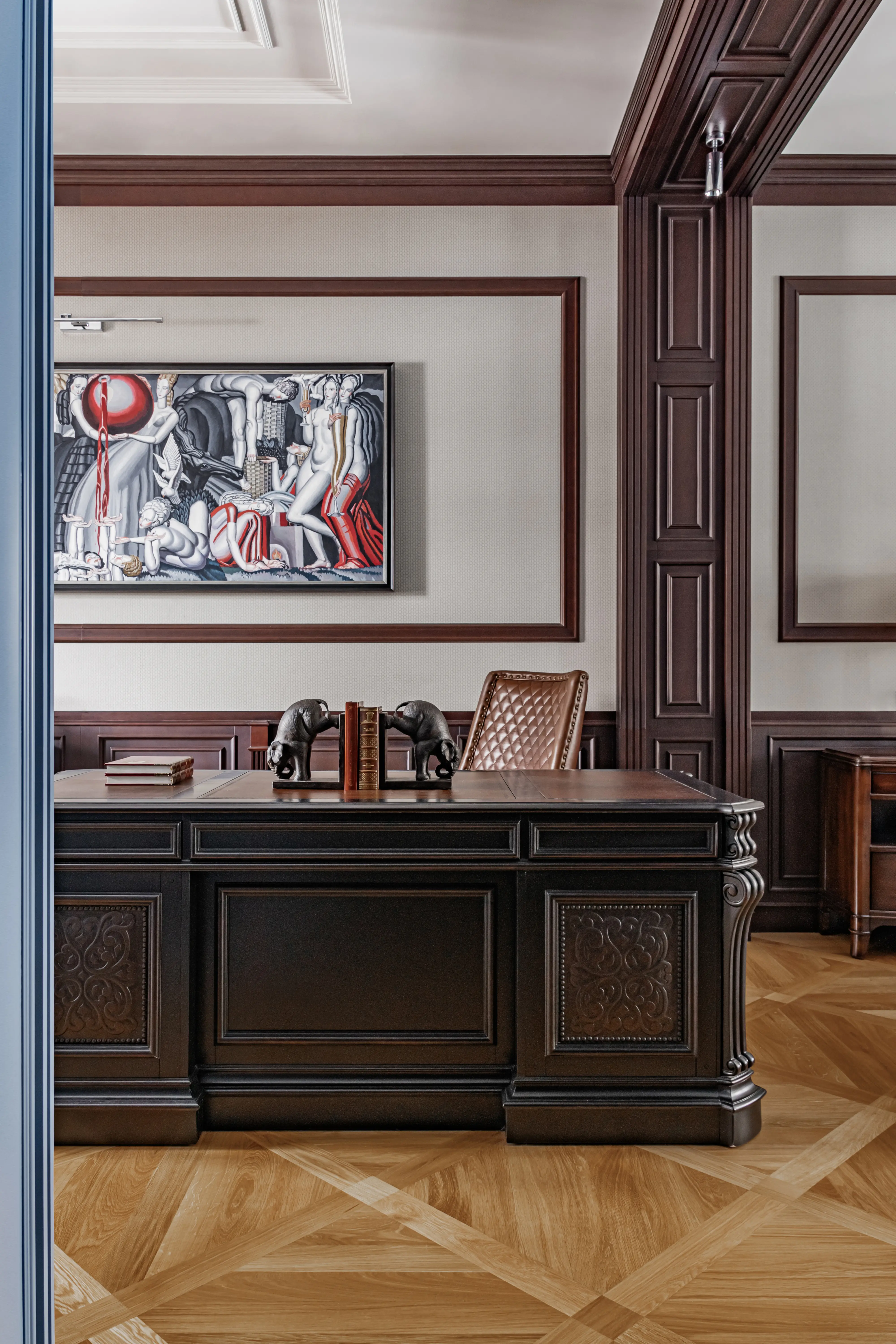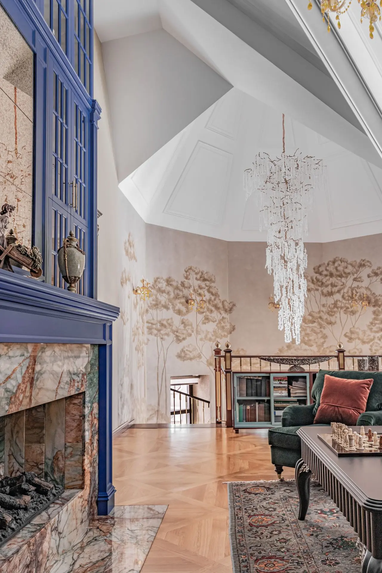 «Прочувствовать» предпочтения клиентов Надежде помогло вдумчивое изучение прежнего интерьера. Оказалось, что огромную симпатию супруги питают к красным, синим и зеленым тонам, которые легли в основу цветовой гаммы. В итоге дизайн-проект получился крайне сложным и многогранным — неудивительно, что его реализация потребовала совместной работы всей команды студии.