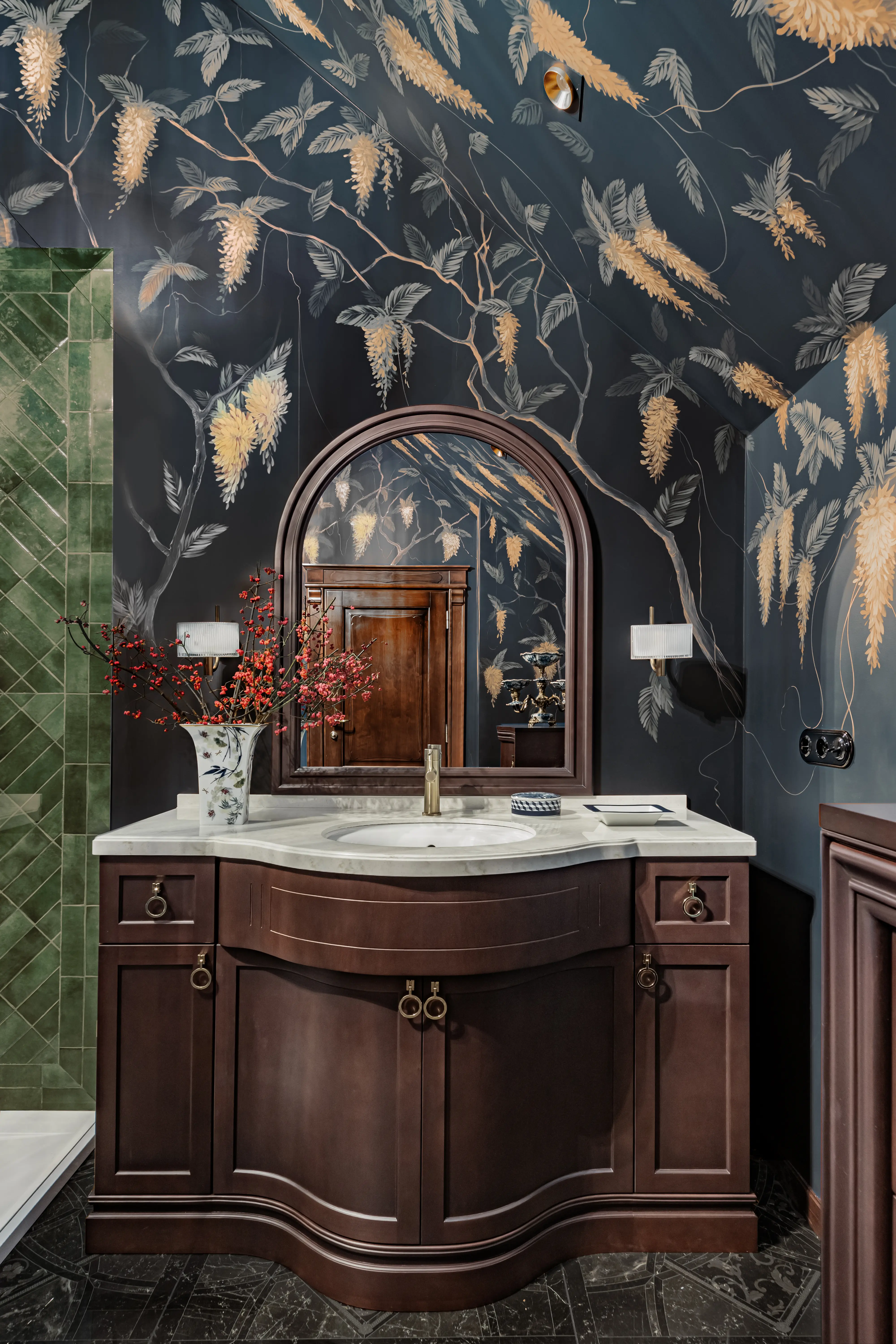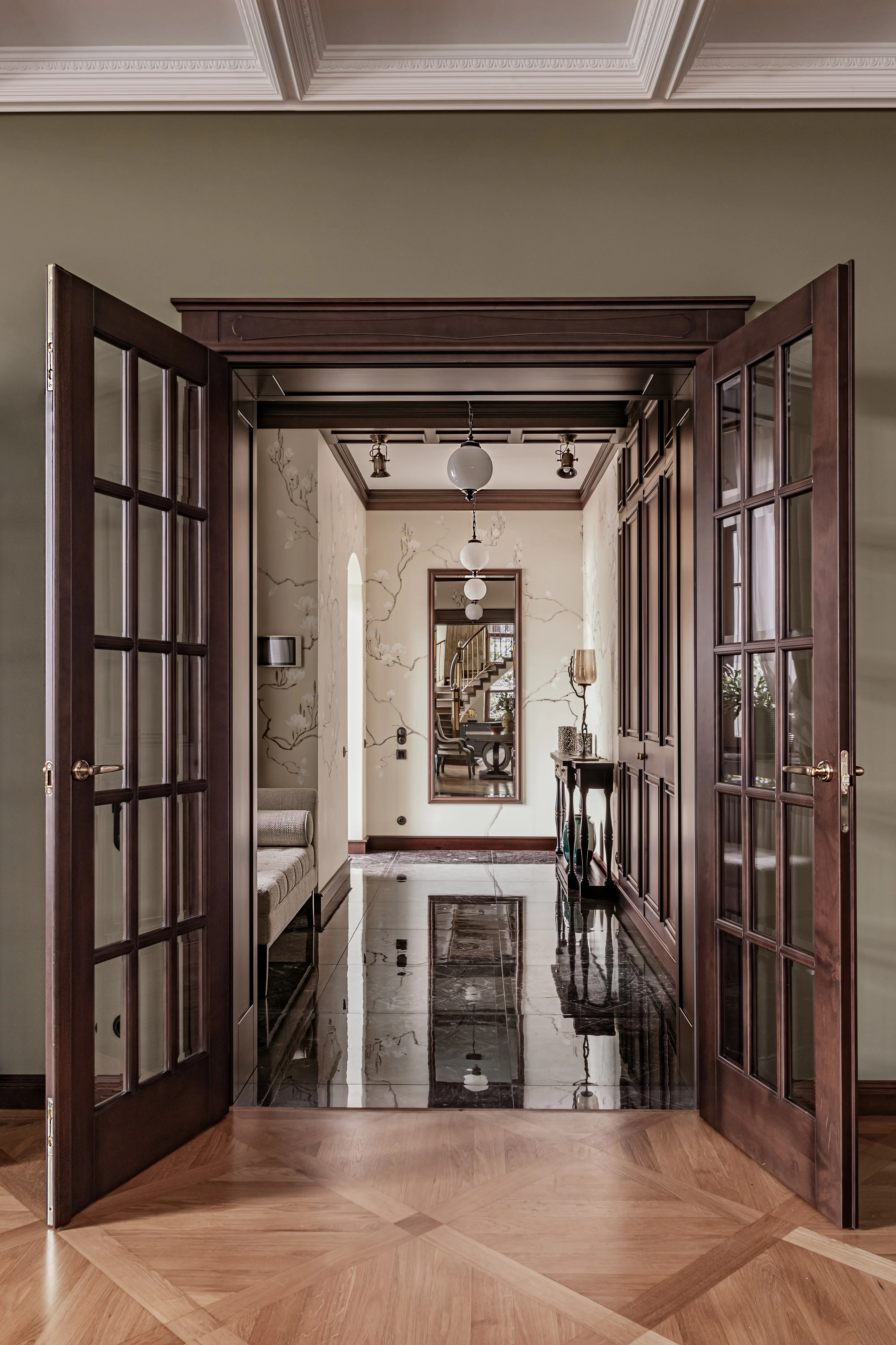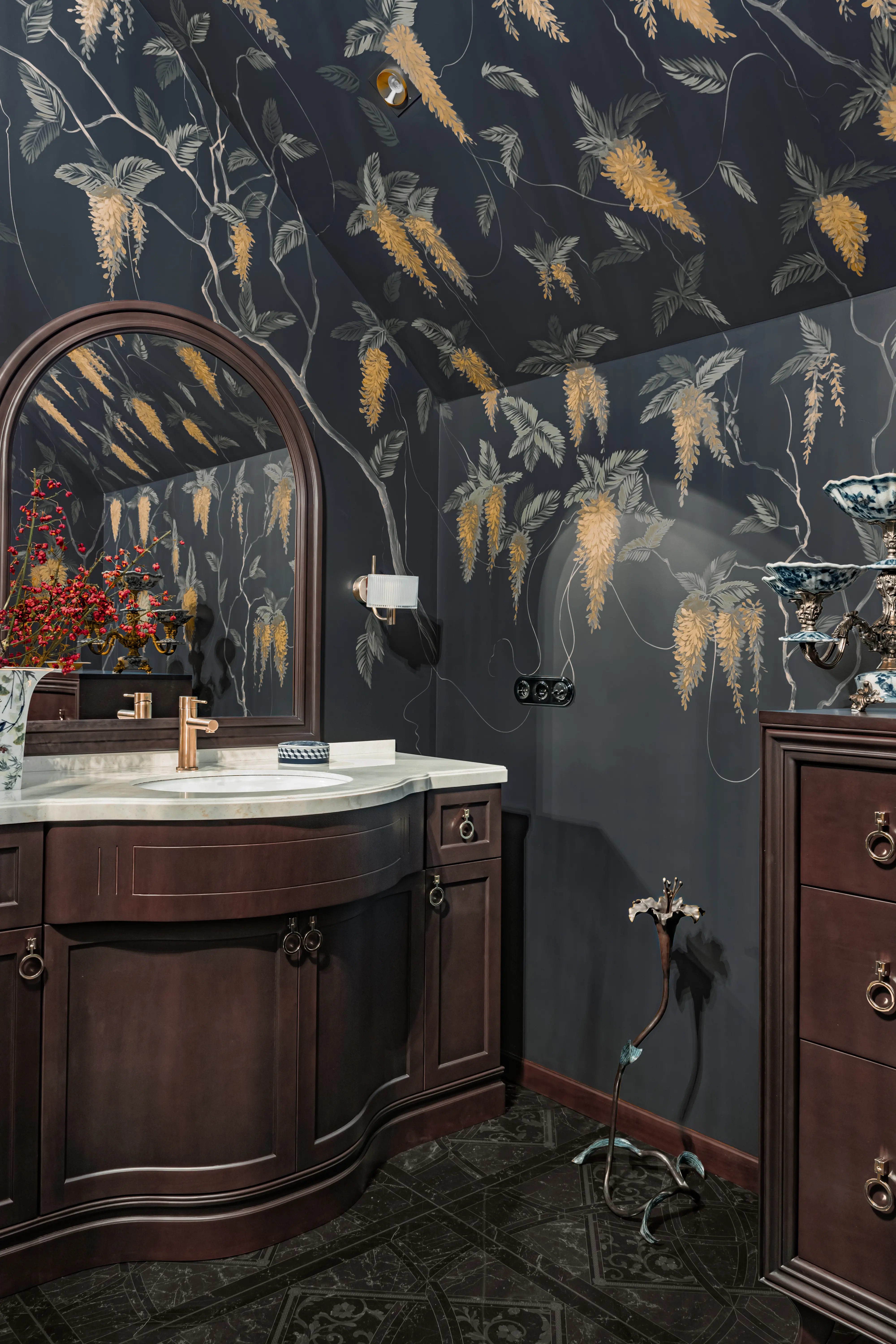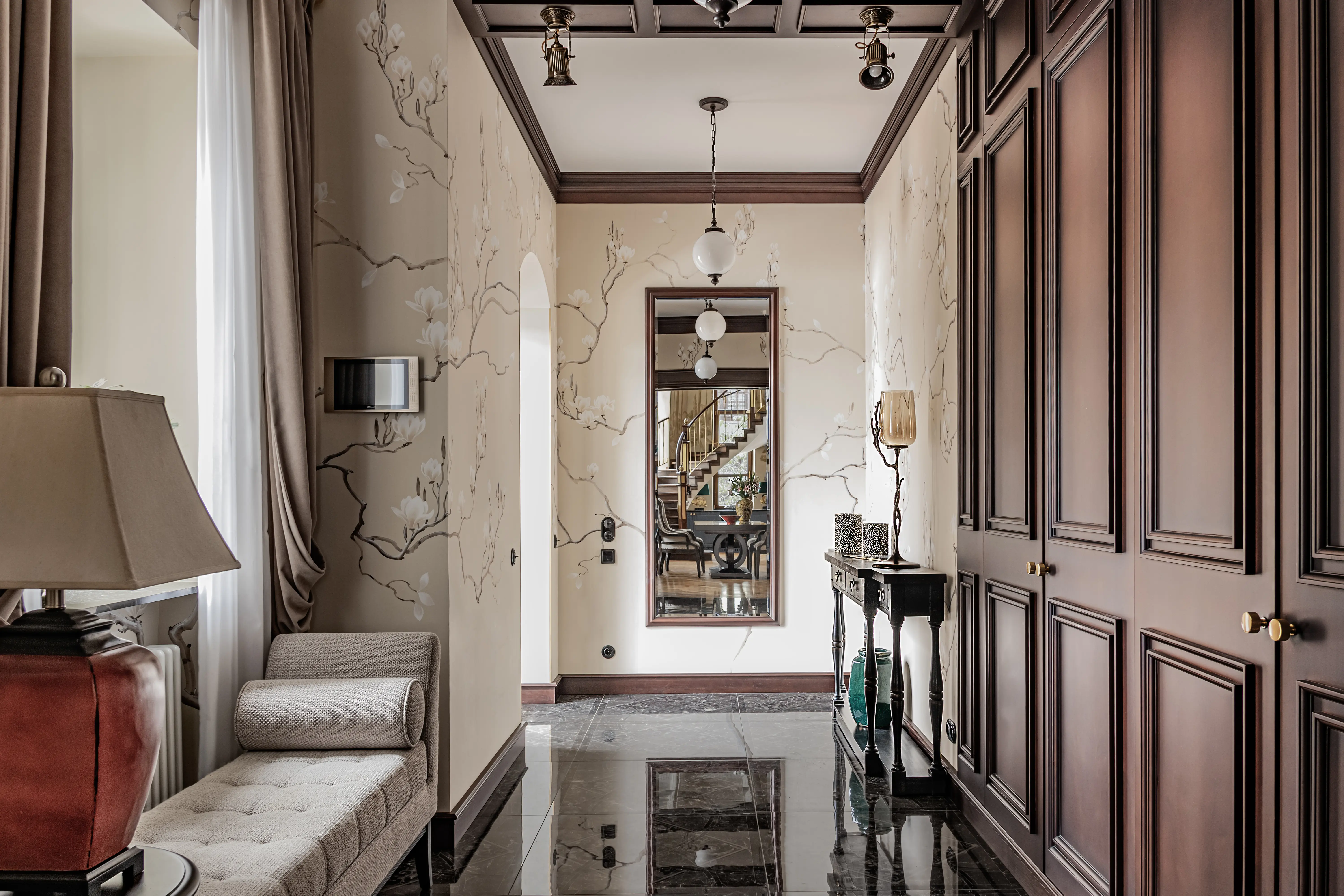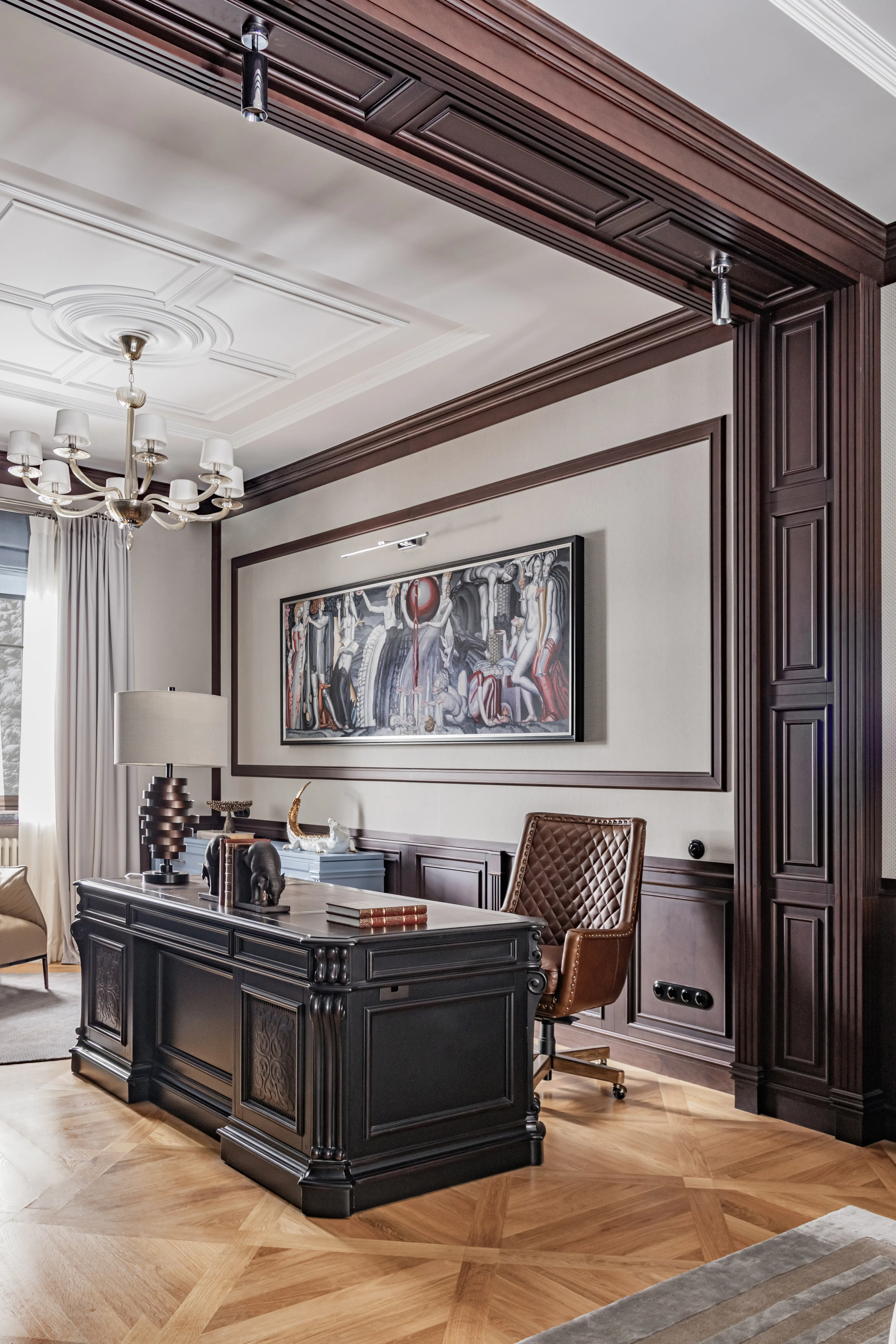 «Прочувствовать» предпочтения клиентов Надежде помогло вдумчивое изучение прежнего интерьера. Оказалось, что огромную симпатию супруги питают к красным, синим и зеленым тонам, которые легли в основу цветовой гаммы. В итоге дизайн-проект получился крайне сложным и многогранным — неудивительно, что его реализация потребовала совместной работы всей команды студии.