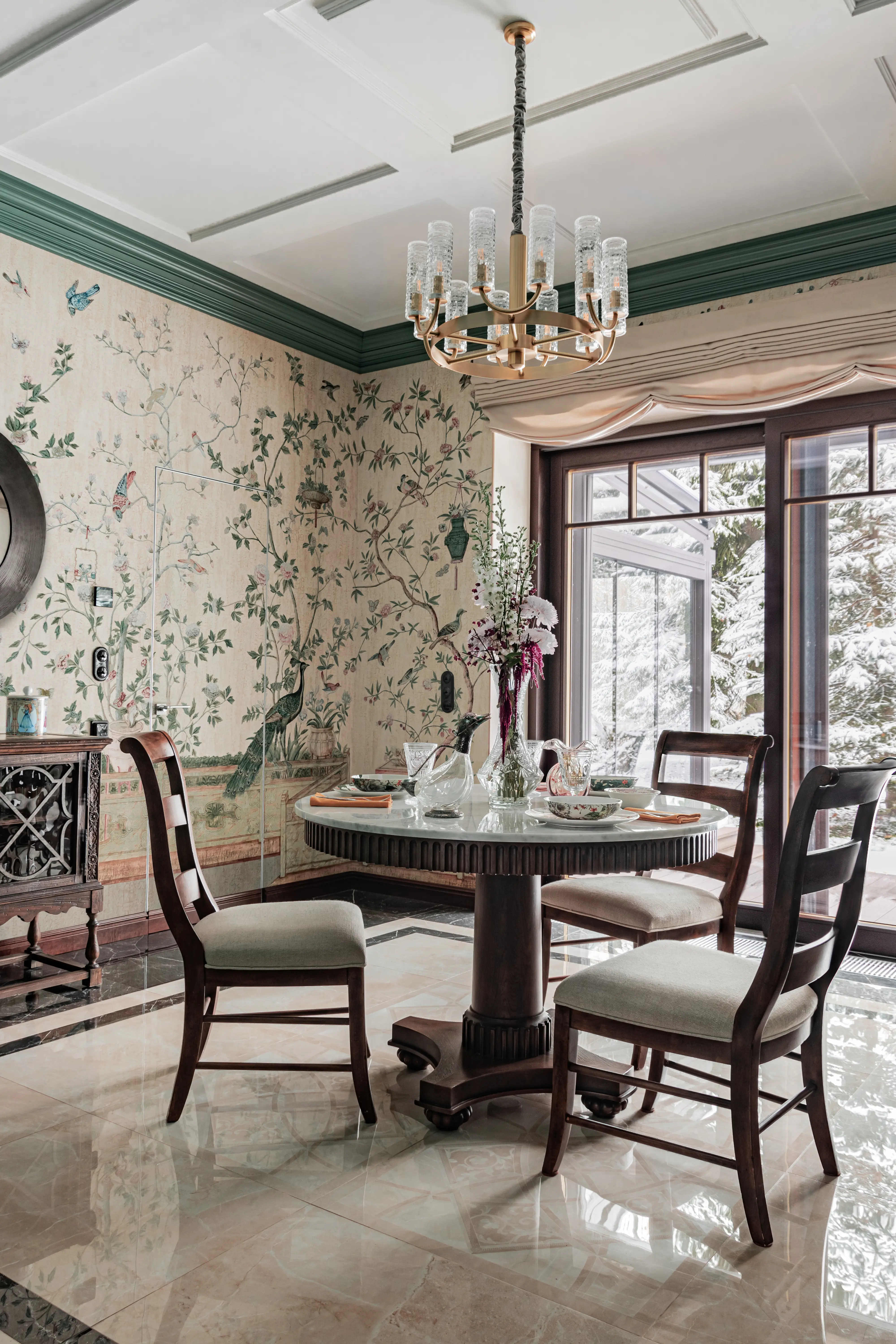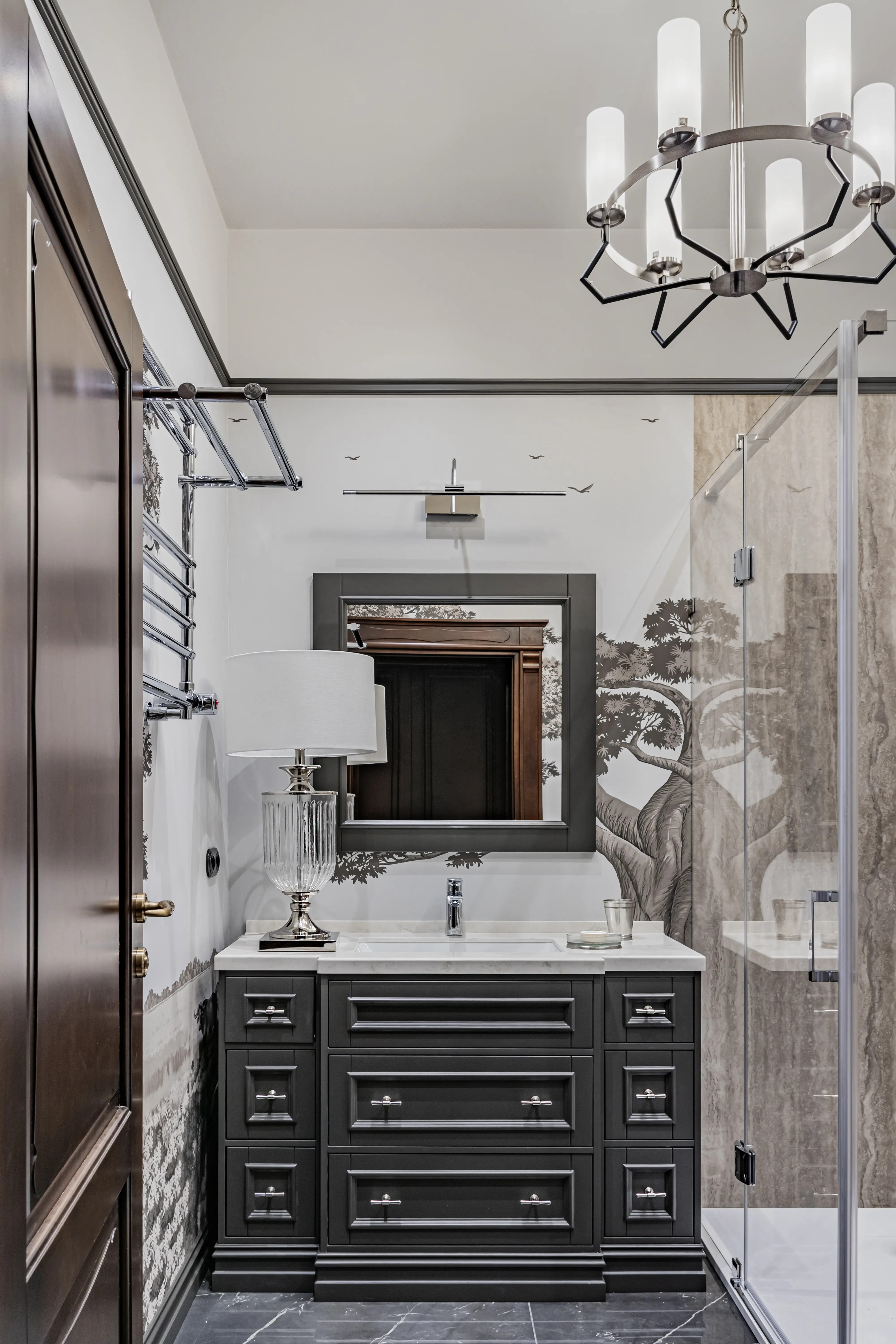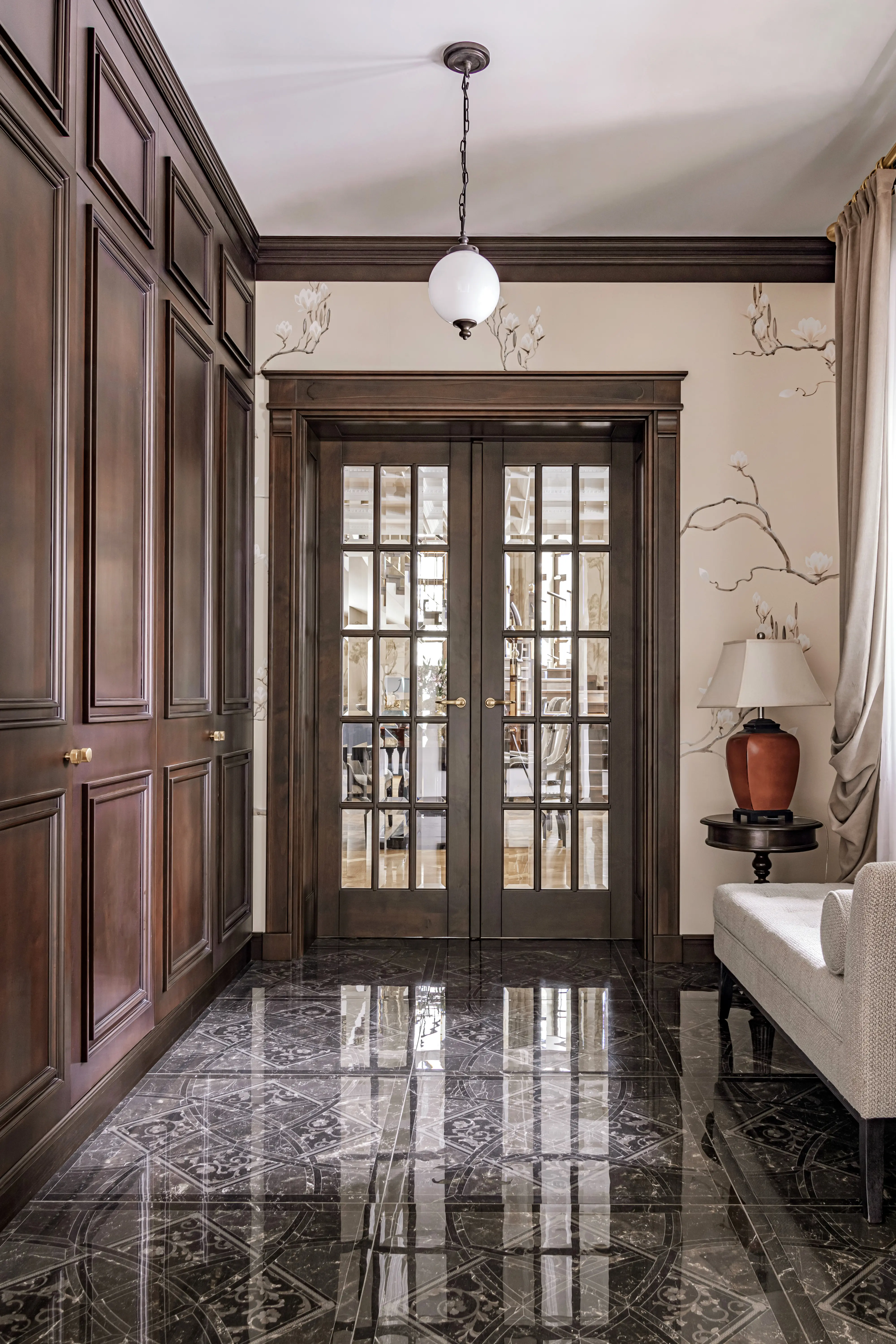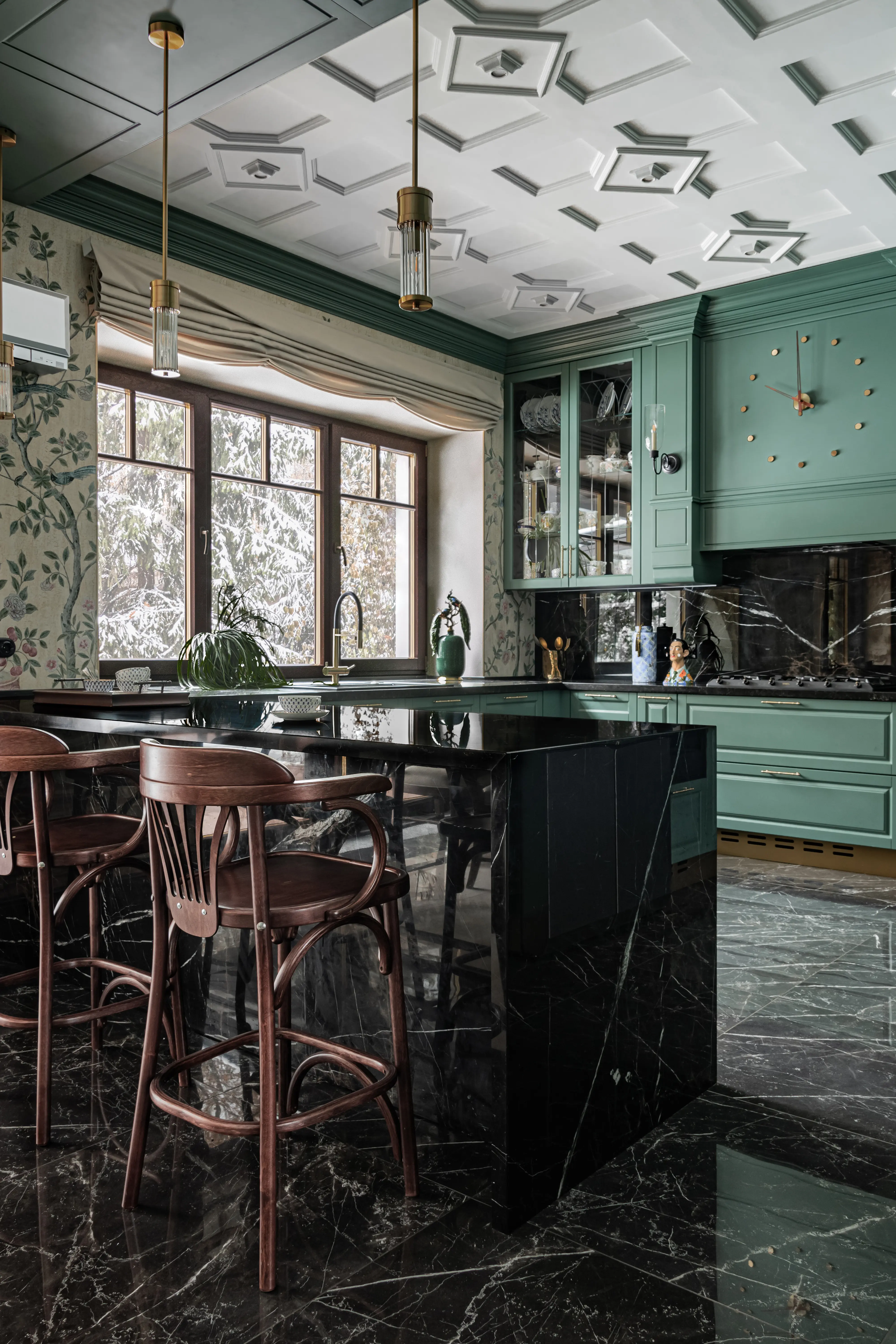 «Прочувствовать» предпочтения клиентов Надежде помогло вдумчивое изучение прежнего интерьера. Оказалось, что огромную симпатию супруги питают к красным, синим и зеленым тонам, которые легли в основу цветовой гаммы. В итоге дизайн-проект получился крайне сложным и многогранным — неудивительно, что его реализация потребовала совместной работы всей команды студии.