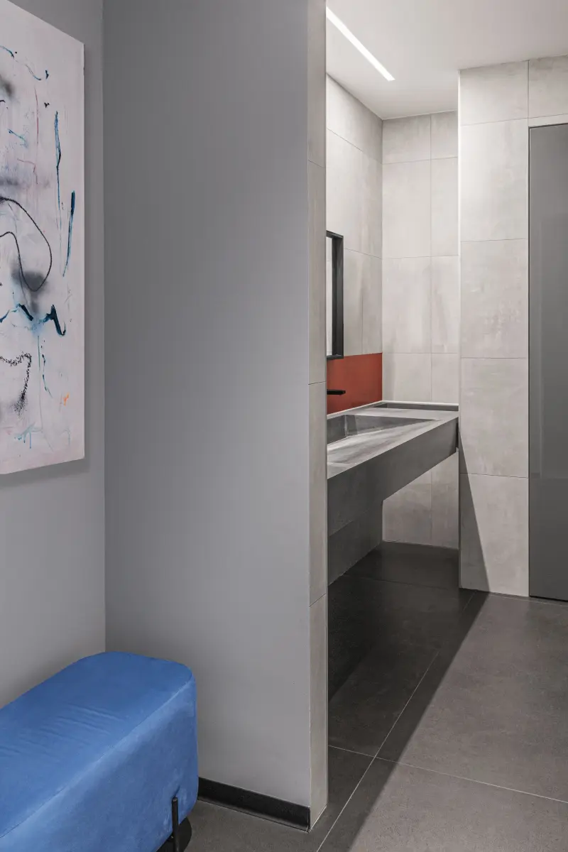 Наполнению переговорных было уделено особое внимание: в стены здесь интегрированы ниши с сидениями для отдыха, а мебель подбиралась мобильная. Абстрактная картина Олега Устинова сформировала легкую отсылку к ориентированной на детей сфере деятельности компании. Оживить строгую палитру помог контраст отделочных материалов – водостойкой краски, мягких звукопоглощающих панелей и декоративной штукатурки с имитацией бетона. Последняя также украсила входную зону с глянцевой стойкой ресепшн. Так, уже при входе в офис клиенты погружаются в деловую атмосферу и знакомятся с уникальным подходом «Лебер» к работе. Ощущение завершенности оформлению придают полотно художницы Кати Нечаевой и настольная лампа &Tradition.
