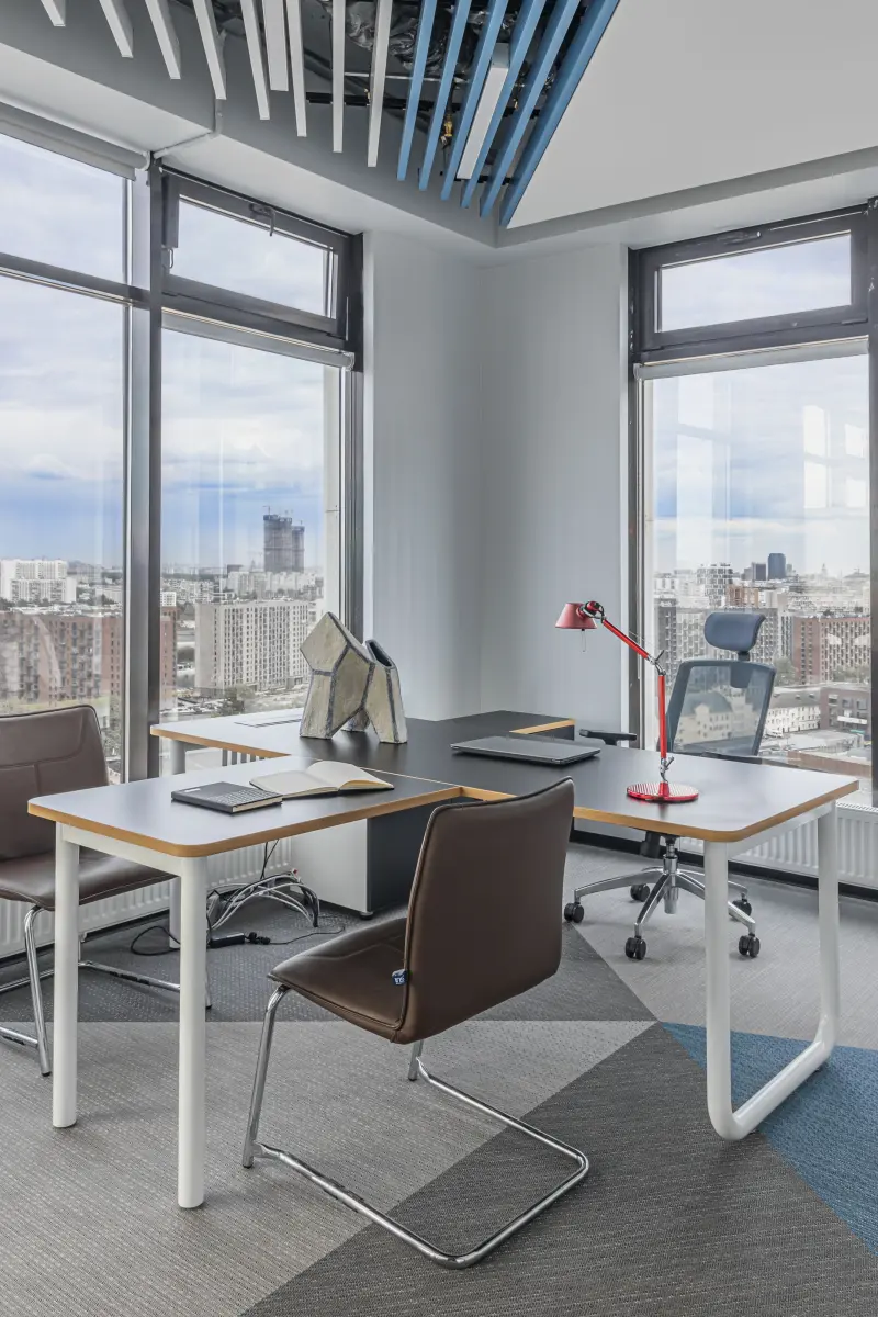 Команда студии «Точка дизайна» разработала красочный интерьер офиса для компании «Лебер» – российского поставщика и производителя детских игровых комплексов. Заказчики хотели получить нескучное оформление, которое будет комфортным для сотрудников и руководства, а также подчеркнет связь с ярким и функциональным дизайном для детей. Передать характер бренда помогли акцентные детали – строгие геометрические формы и насыщенные вкрапления глубоких синих и красных цветов. Фоном для них выступили располагающие к концентрации серые и графитовые оттенки. Главными составляющими дизайн-проекта стали продуманное зонирование, комбинированные рабочие места и разнообразные световые сценарии. Работа над проектом проходила легко и быстро. ««Точка дизайна» подготовила референсы, которые стали начальным этапом работы. Увидев их, мы внесли небольшие правки и сообщили команде студии о том, что нам нравится, а что не подходит. Также очень профессионально дизайн-студия подошла к определению вкуса заказчика, использовав для этого авторский опросник» — Артем Романович Сорокин, председатель совета директоров «Лебер».