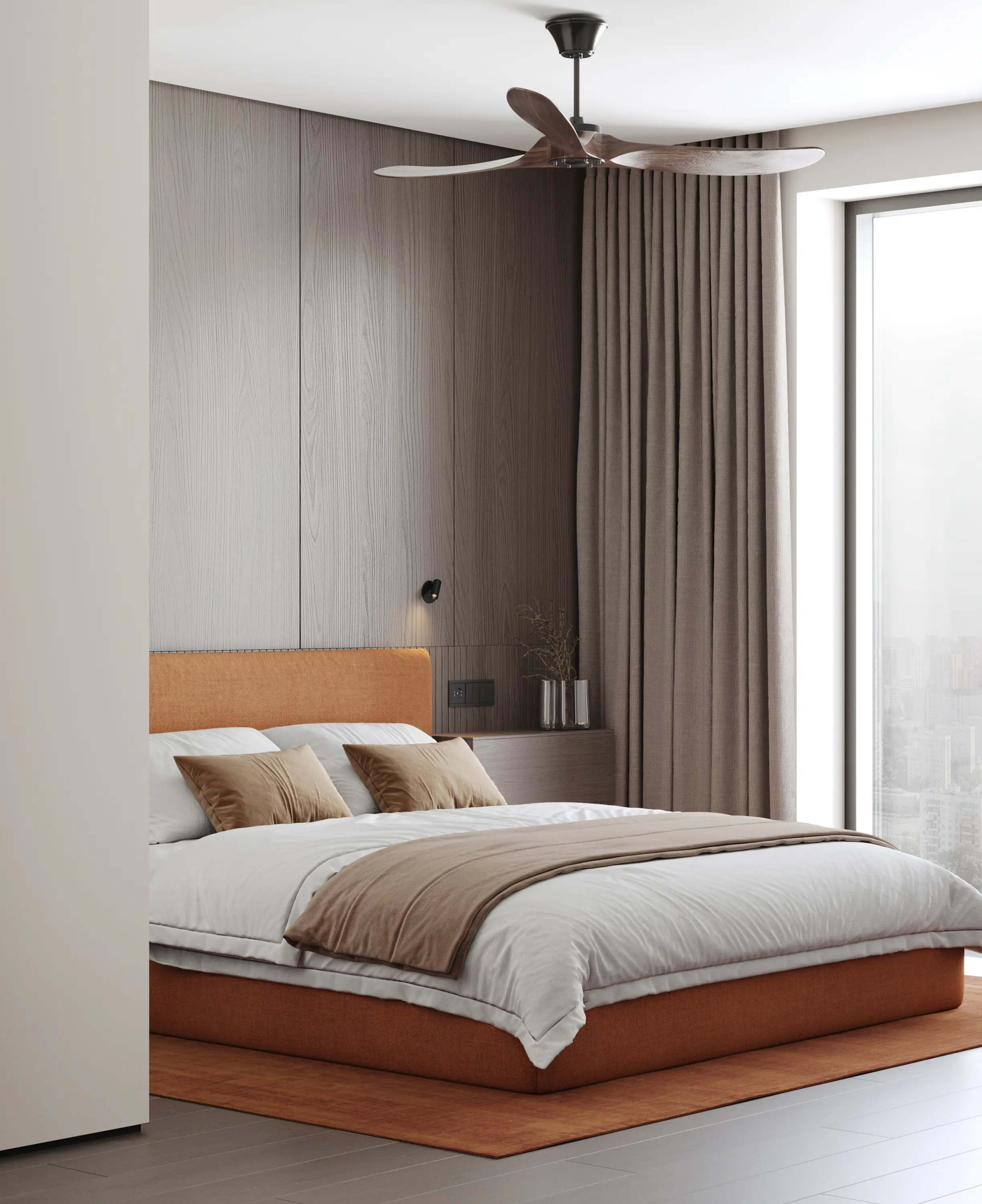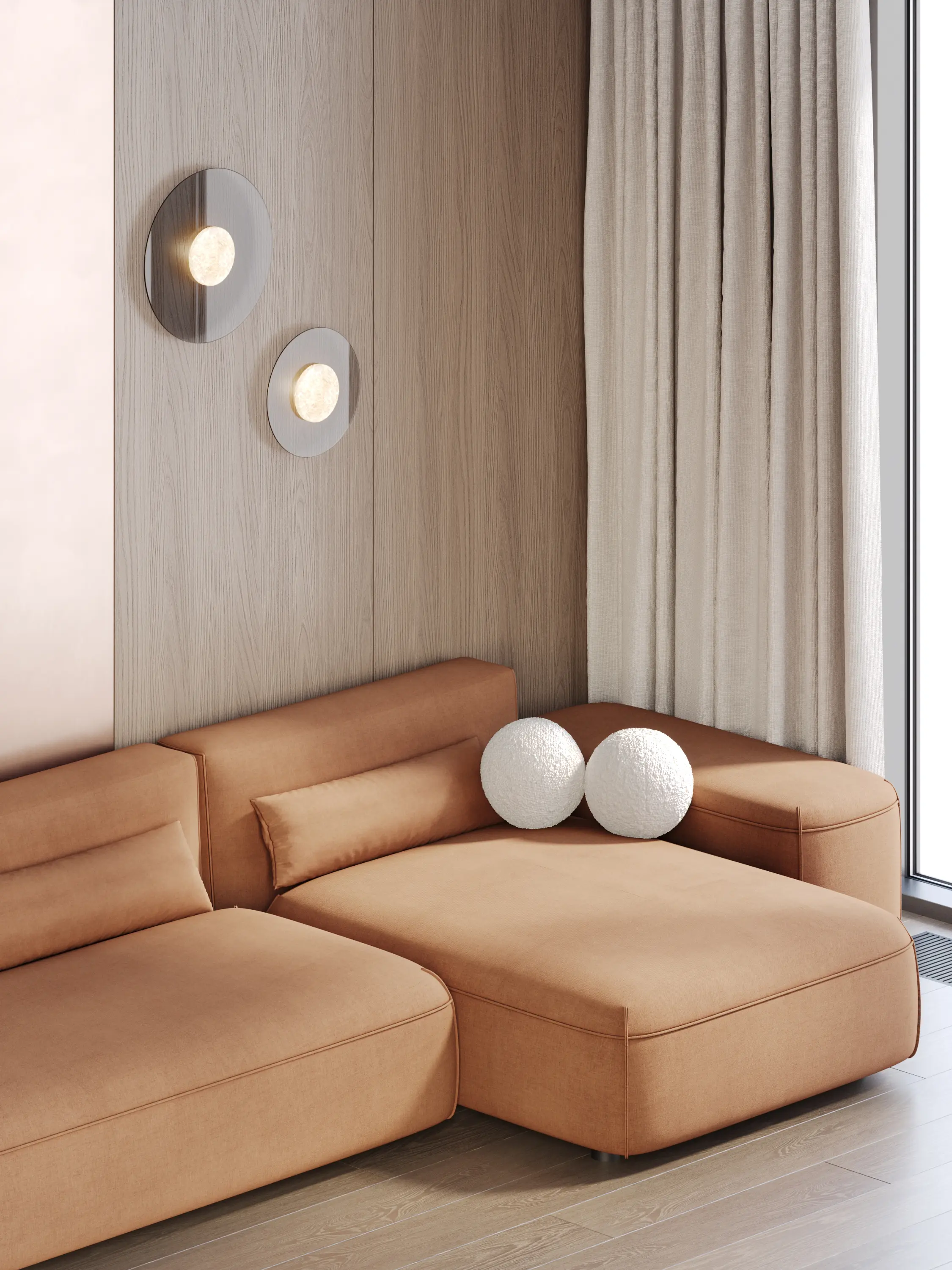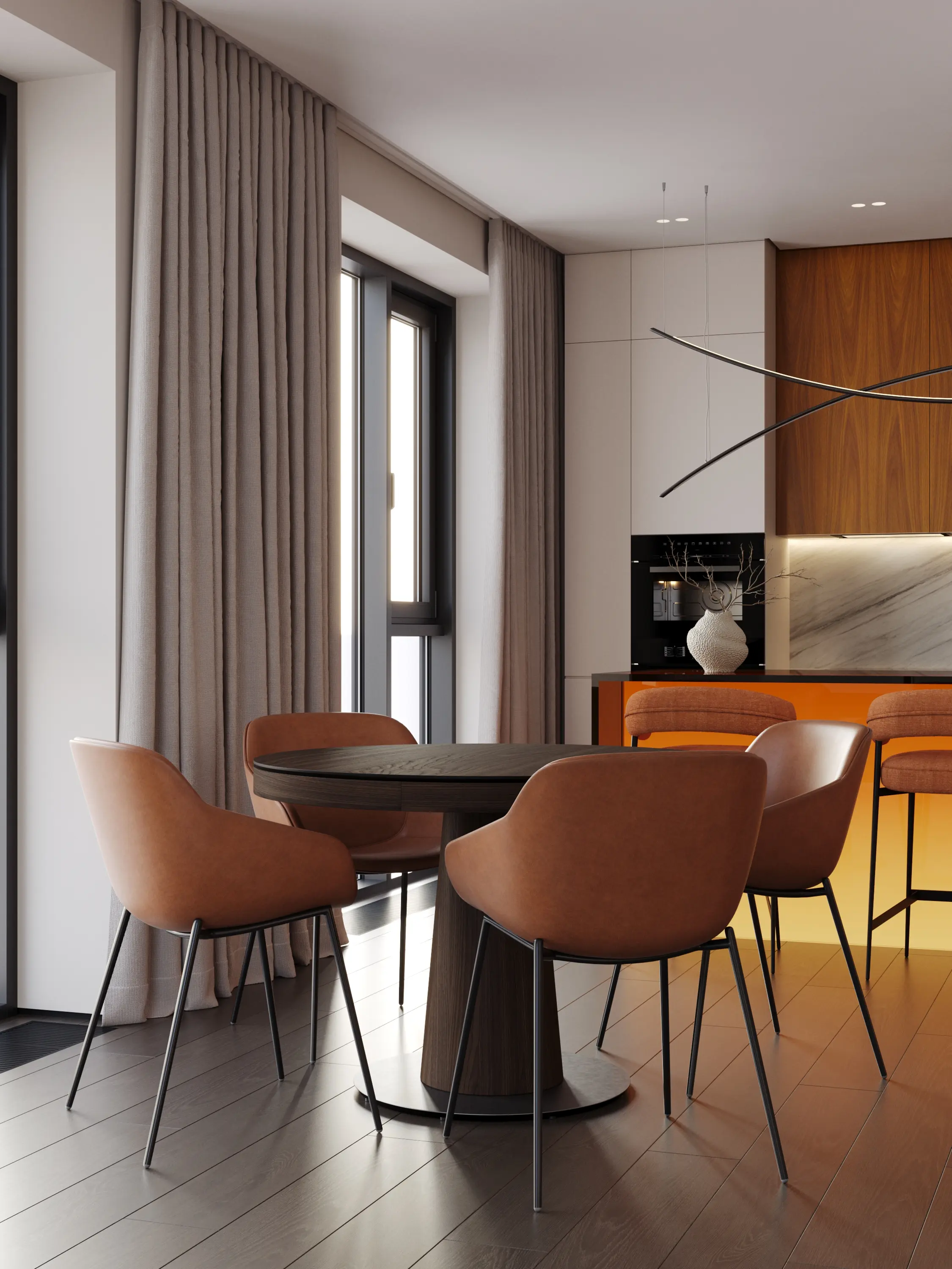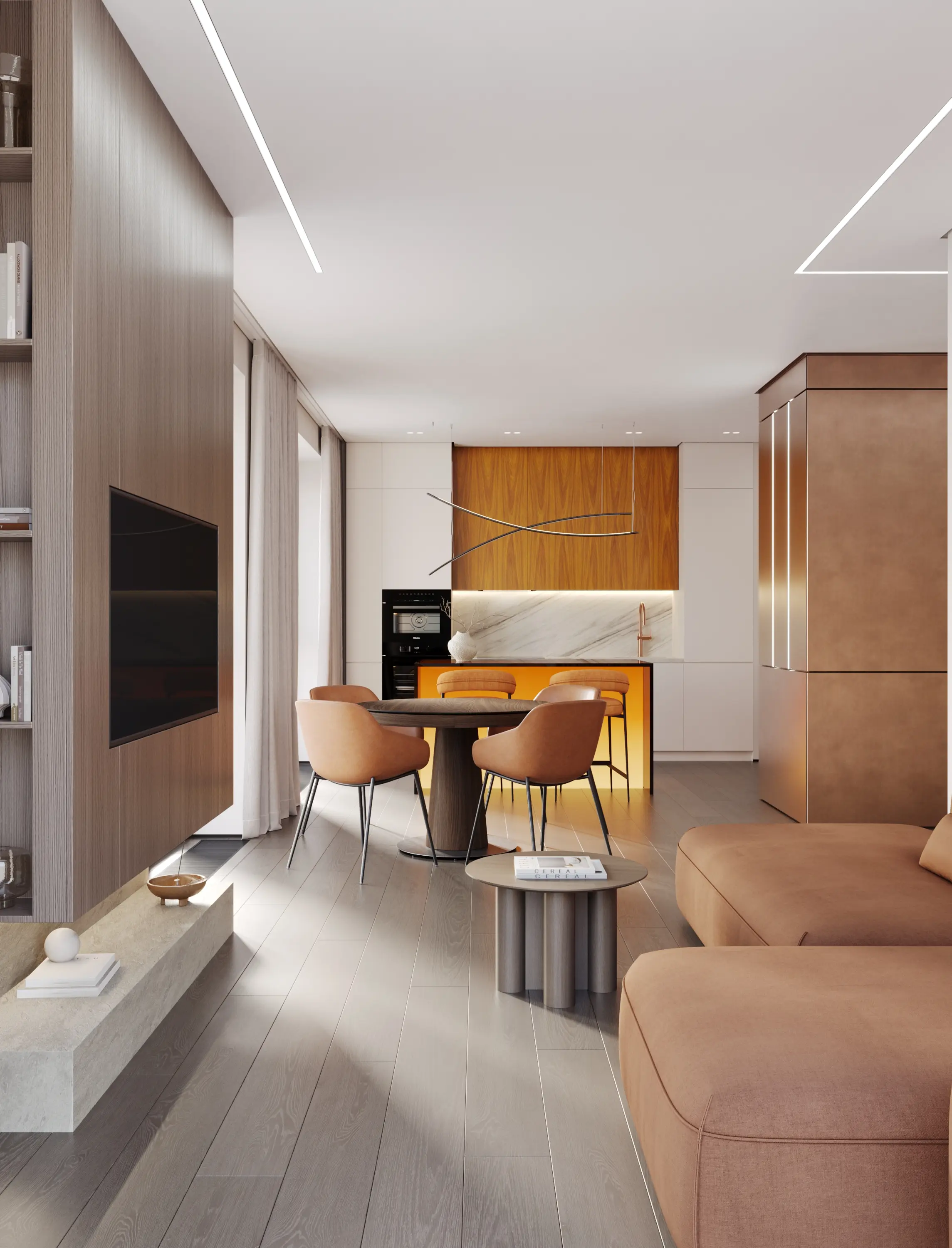 Одновременно преимуществом и вызовом стали многочисленные панорамные окна, которые клиент хотел сохранить открытыми, не загромождая мебелью. Из окон открывается впечатляющий вид на Москву и воду, и мы сделали его полноценной частью интерьера.