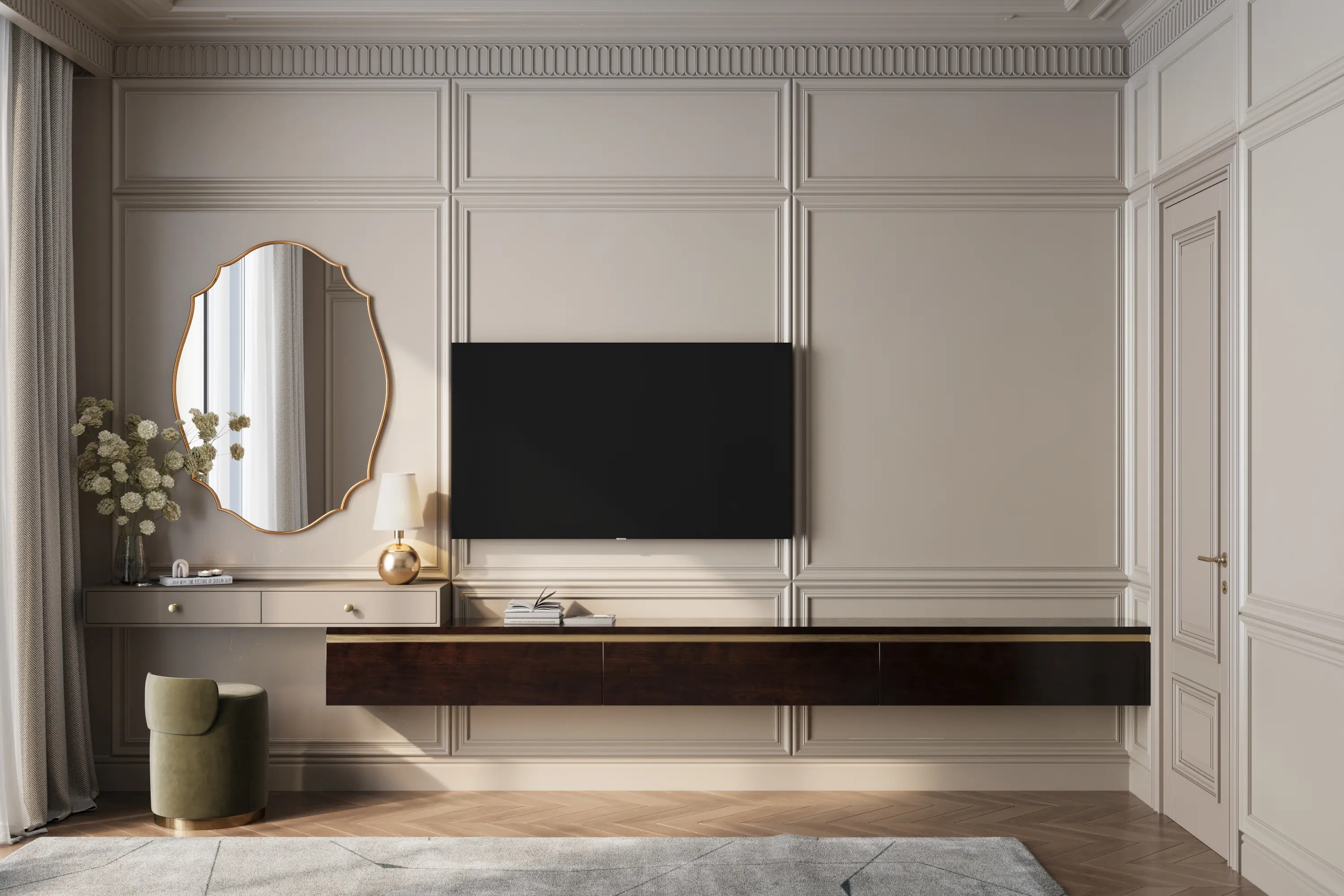 Концепция строится на создании уютного современного интерьера с лёгким настроением загородного дома. В проекте мы использовали обилие дерева, текстиля и обволакивающих тёплых оттенков. Дизайнер Анастасия Василица насытила проект цветными акцентами, но при этом сохранила ощущение уюта за счёт приглушённых и сложных оттенков. Такое решение особенно выигрышно смотрится в интерьере современной новостройки.