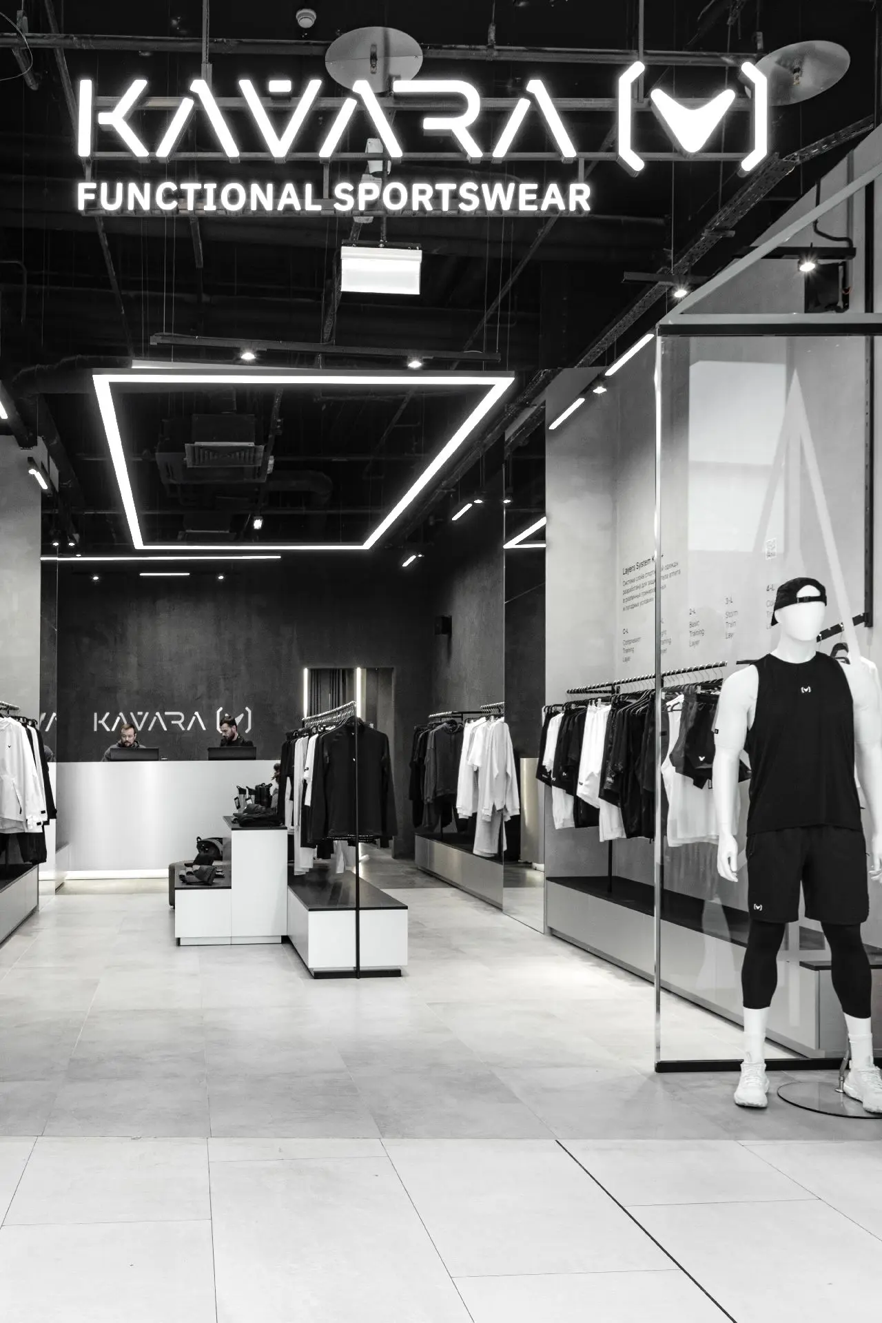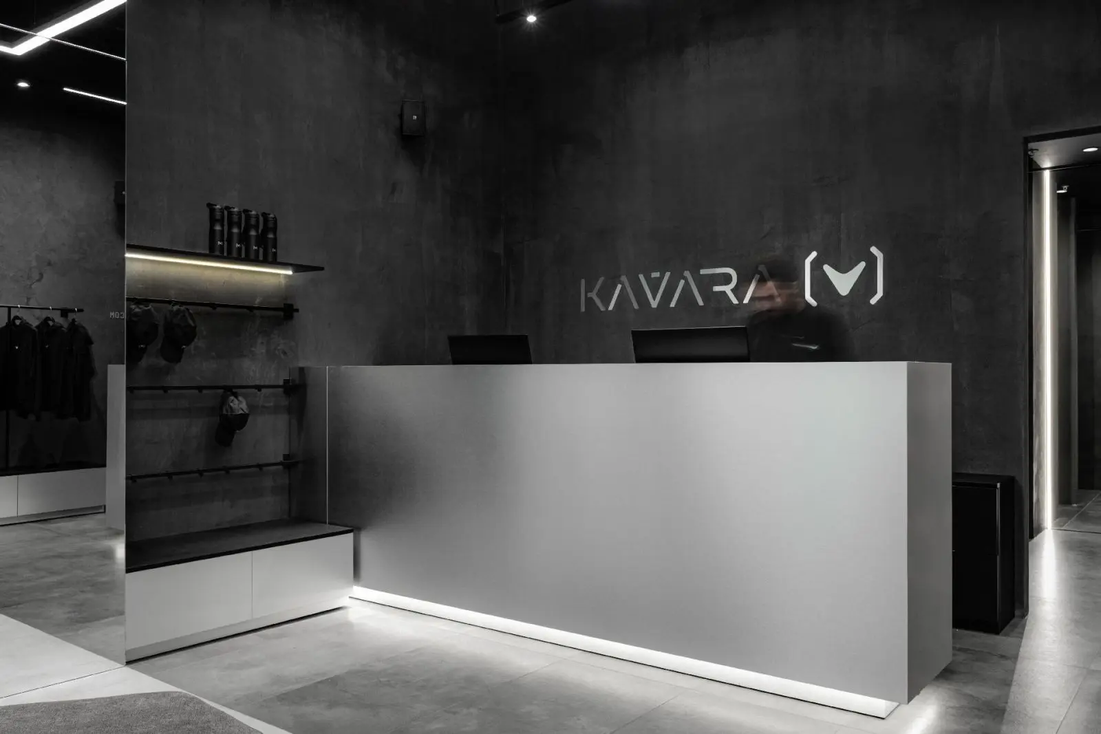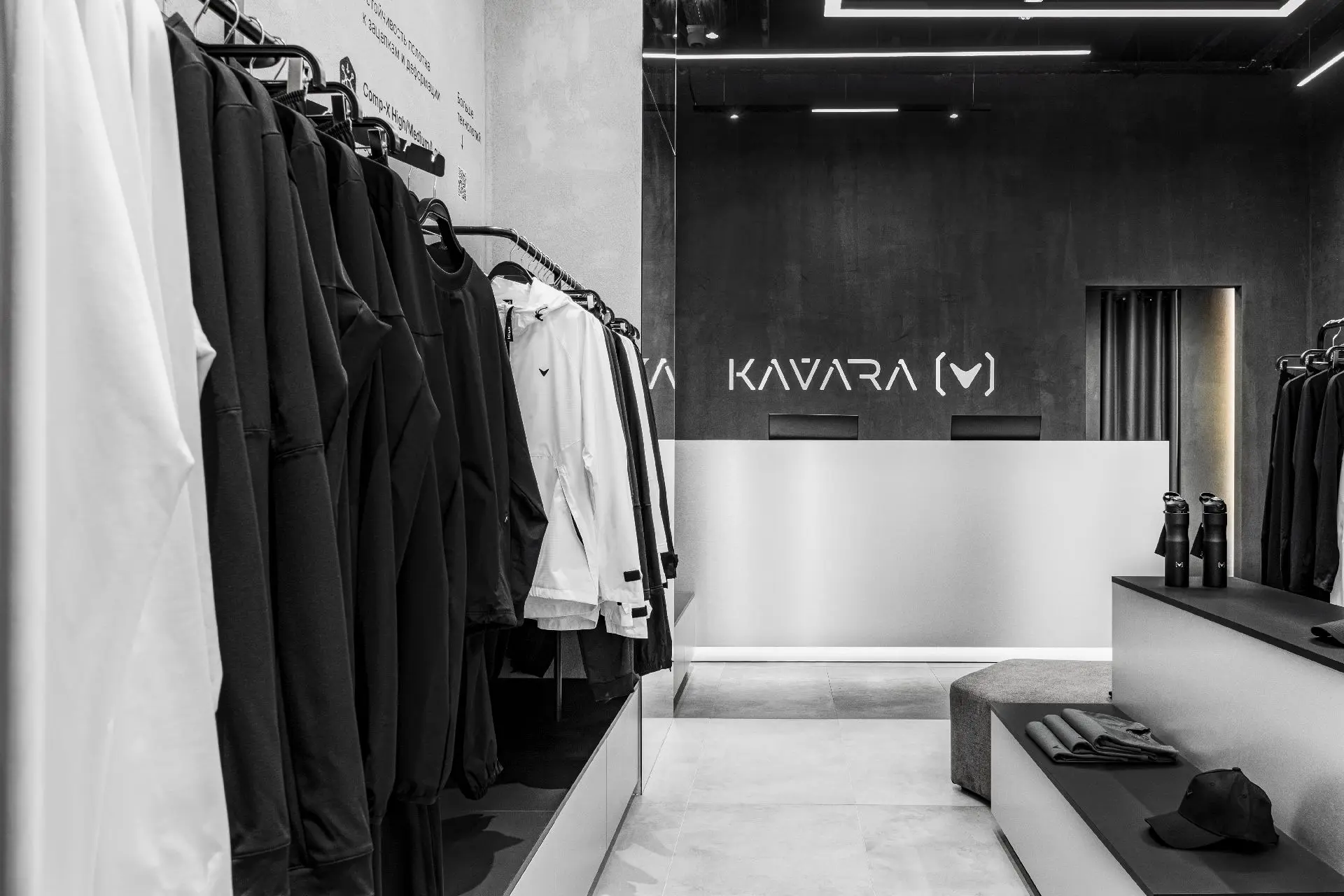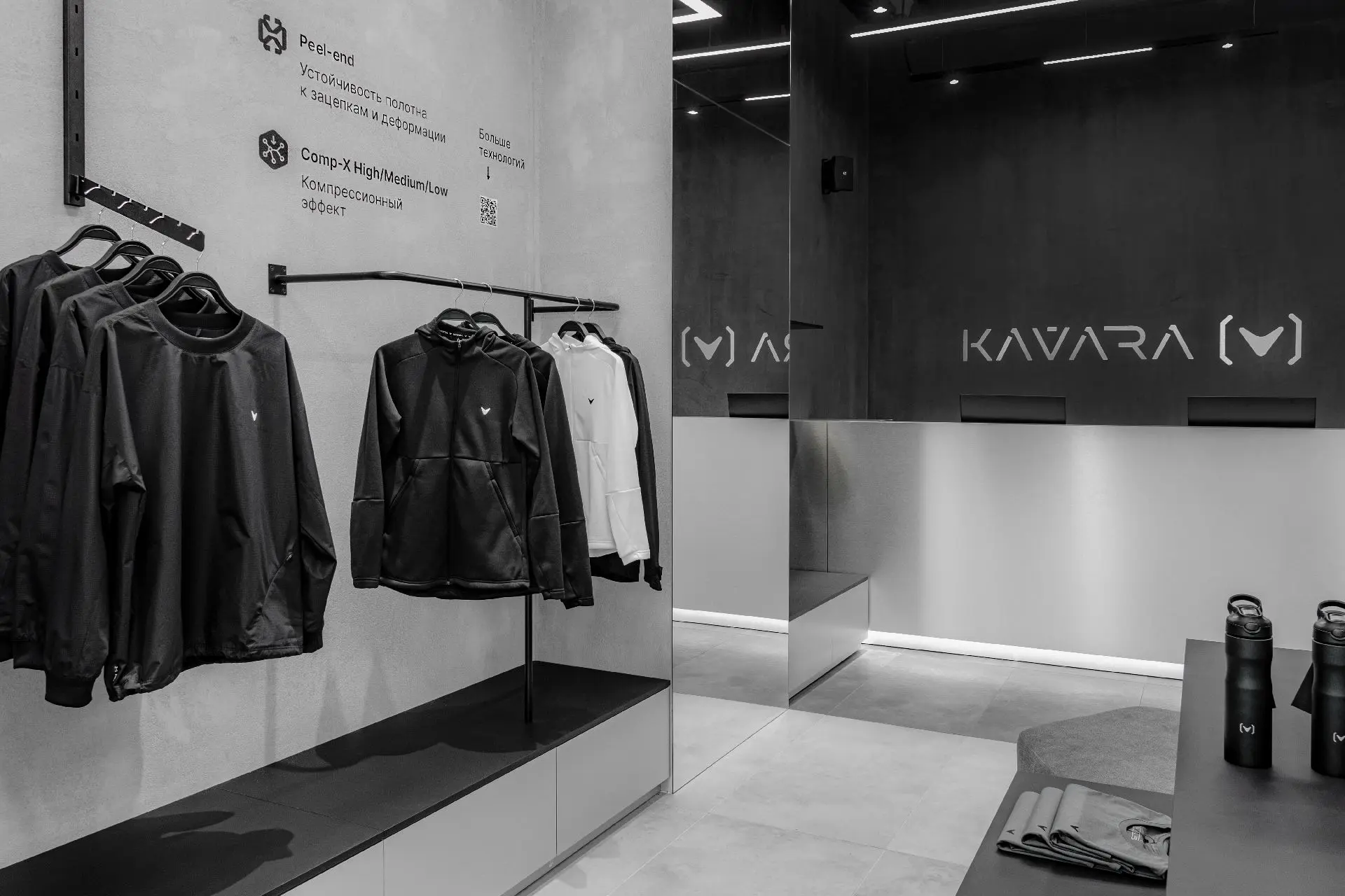 Молодые основатели бренда спортивной одежды KAVARA обратились к команде студии «Точка дизайна» с запросом на создание эффектного шоурума. Это был их первый магазин, поэтому к разработке интерьера все стороны подошли с большим энтузиазмом. В основу визуальной концепции легли подобранные заказчиками референсы, а еще брендбук и философия компании. В диалоге с клиентами зародилась идея о брутальной и обволакивающей атмосфере торгового зала. Полный отказ от ярких красок помог подчеркнуть индивидуальность продукта – пространство может показаться нарочито холодным, но синтез черно-серого монохрома и материалов подчеркивает строгость мужского характера. Современный стиль и смелая цветовая палитра без единого теплого оттенка отразили красоту самосозерцания и самосовершенствования, заложенную в «сердце» ДНК бренда.