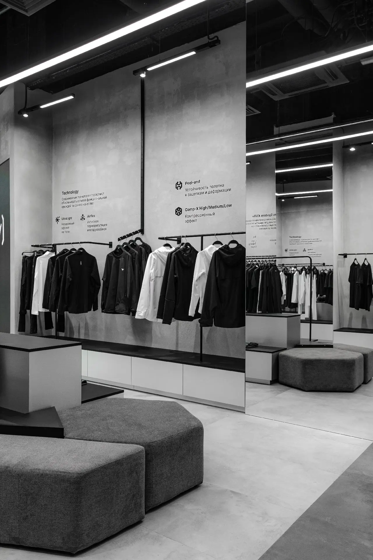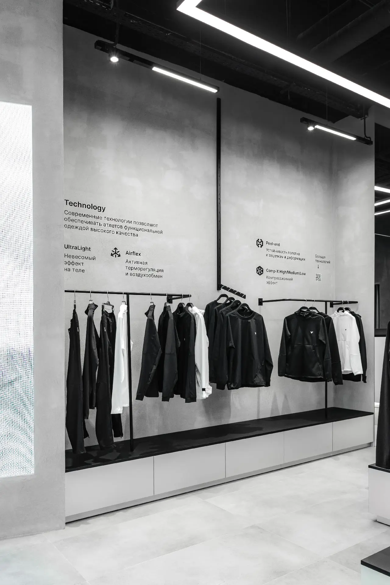 Помещение магазина в московском ТЦ «Метрополис» было довольно удачным – его небольшую площадь компенсировали захватывающие высокие потолки. На 72 квадратных метрах Анастасии Василице предстояло выделить торговый зал и комнату для персонала. Первым делом она провела перепланировку – обновила входную группу и демонтировала старые примерочные. Их хотелось сделать более симметричными и комфортными для покупателей. Открытое основное пространство отлично просматривается сквозь стеклянные витрины. В нем разместились эффектная стойка кассы из нержавеющей стали, рейлы для развески одежды и дополнительные системы хранения. Для удобства посетителей под графичными вешалками даже установили лаконичные тумбы с выдвижными ящиками. Их фасады выполнены в тон кассы, поэтому остаются практически незаметными. В качестве напольного покрытия был выбран фактурный керамогранит под бетон, а для стен идеально подошла обволакивающая декоративная штукатурка. Они элегантно передают в оформлении внутренний стержень, дисциплину и готовность настоящего спортсмена к преодолению трудностей. Акцентные ростовые зеркала и авторская мебель из холодного металла оживили минималистичную отделку. Чтобы подчеркнуть внушительную высоту помещения, дизайнеры пошли на смелый эксперимент: они выкрасили потолки в черный цвет – получилась иллюзия бесконечно уходящего вверх объема. Коммуникации, наоборот, оставили открытыми. Теперь вкупе со строгой цветовой гаммой они придают интерьеру небанальной брутальности. Спокойную мужественную базу из серых оттенков украсили графичные детали – элементы корпусной мебели и точечные рисунки на стенах. Хорошее освещение лидировало среди запросов клиентов, поэтому его разработку доверили специально приглашенным светодизайнерам из компании «Центр световых решений». Особое внимание уделили примерочным: мягкий свет позволяет оценить все достоинства одежды и подчеркивает ее текстуру на фотографиях в соцсетях. В зоне раскладки использовались потолочные треки с направленными светильниками. Бунтарский дух шоурума также задают арт-объекты – светящееся копье за витриной и экран с динамичными видеороликами.