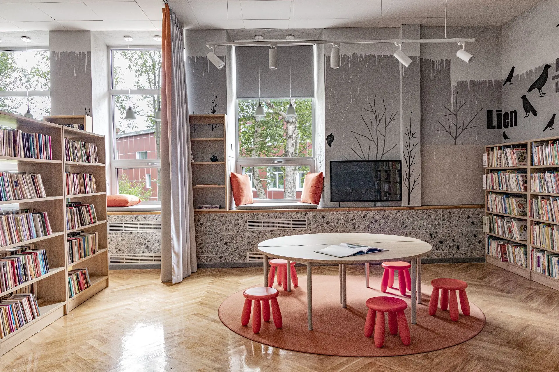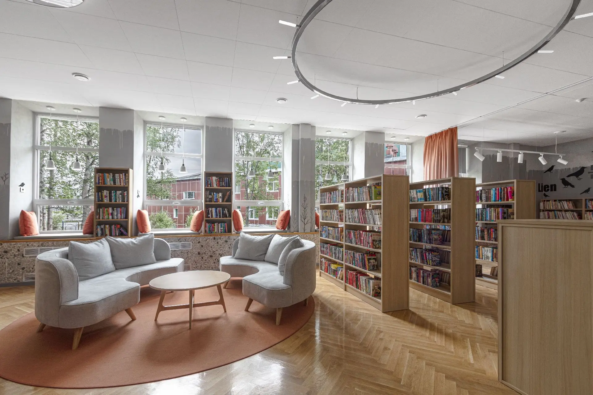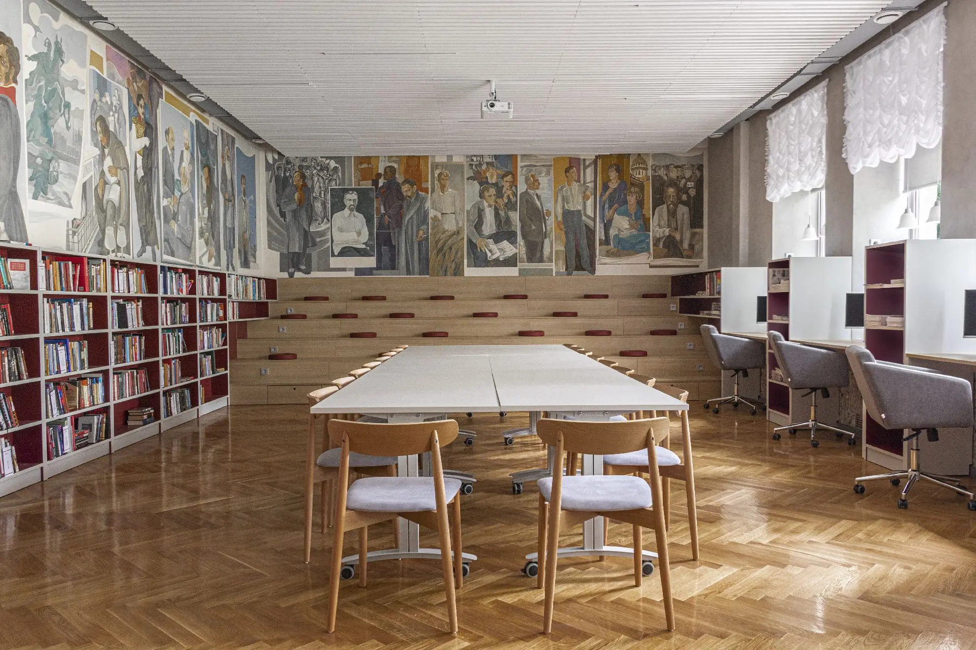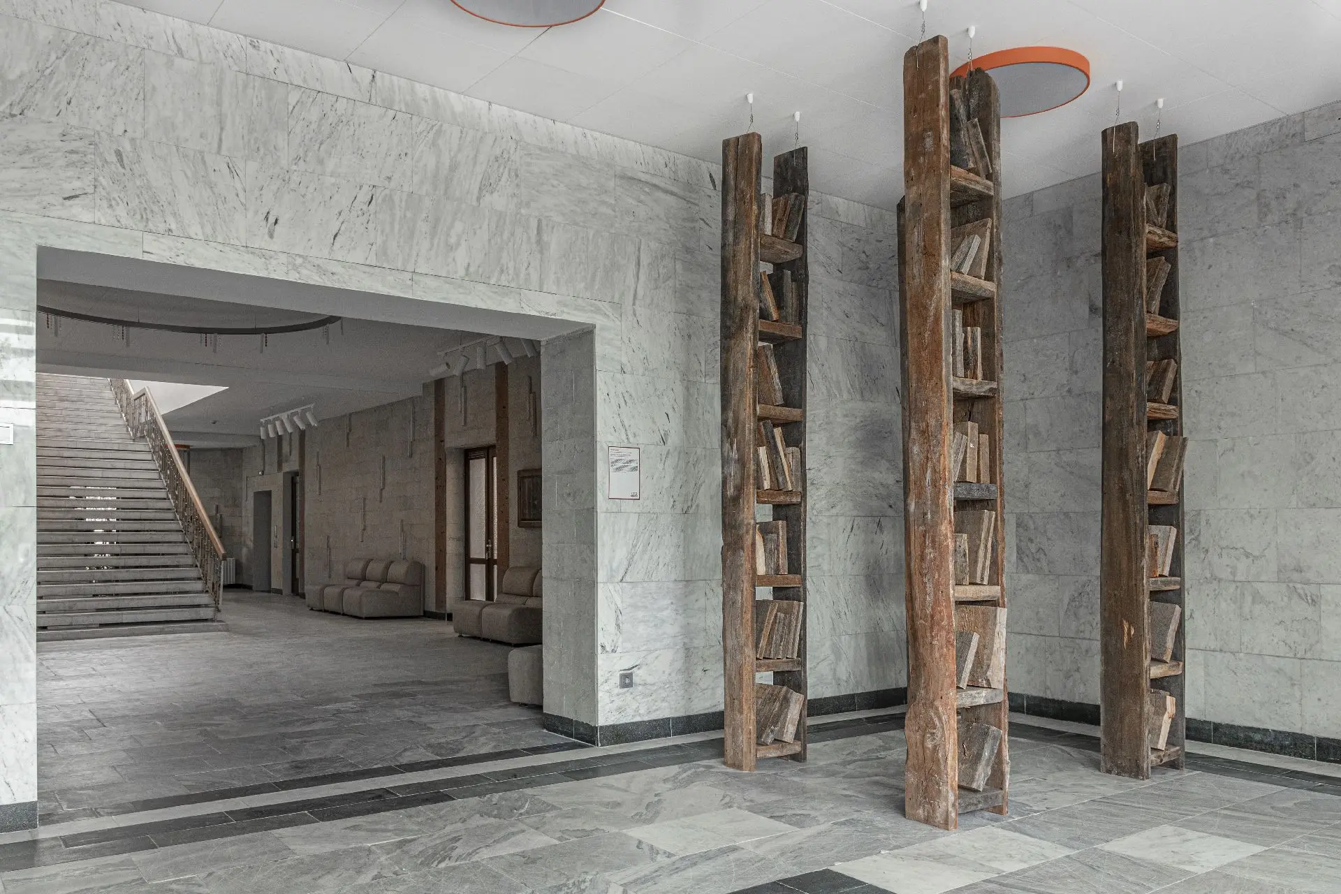 Модернистская архитектура здания и богатая история локации вдохновили дизайнеров на сохранение советского наследия. Они сфокусировались на бережном восстановлении исходных архитектурных особенностей и материалов — песчаника, мрамора, паркета и «парящей» лестницы. При создании визуальной концепции проекта команда студии «Точка дизайна» вдохновлялась эстетикой советской эпохи. Например, необычными фасадами: из-за назначения здания в выполненных в форме флагштоков изгибах люди стали узнавать страницы открытой книги. Архитекторы дополнили их контурной подсветкой, благодаря которой мягкие линии смотрятся особенно интересно в течение полярной ночи. Работа над интерьером началась с обновления инженерных коммуникаций и вентиляции. Первоначальная планировка объекта была удачной, поэтому основные функциональные блоки остались на прежних местах. Изменения коснулись только хозяйственных помещений, которые соседствовали с лифтовой зоной: их пришлось уменьшить, чтобы сделать пространство более инклюзивным. Высокие окна наполнили залы естественным светом, а воссозданное историческое остекление придало сложную игру бликов и отсветов на полу и стенах.