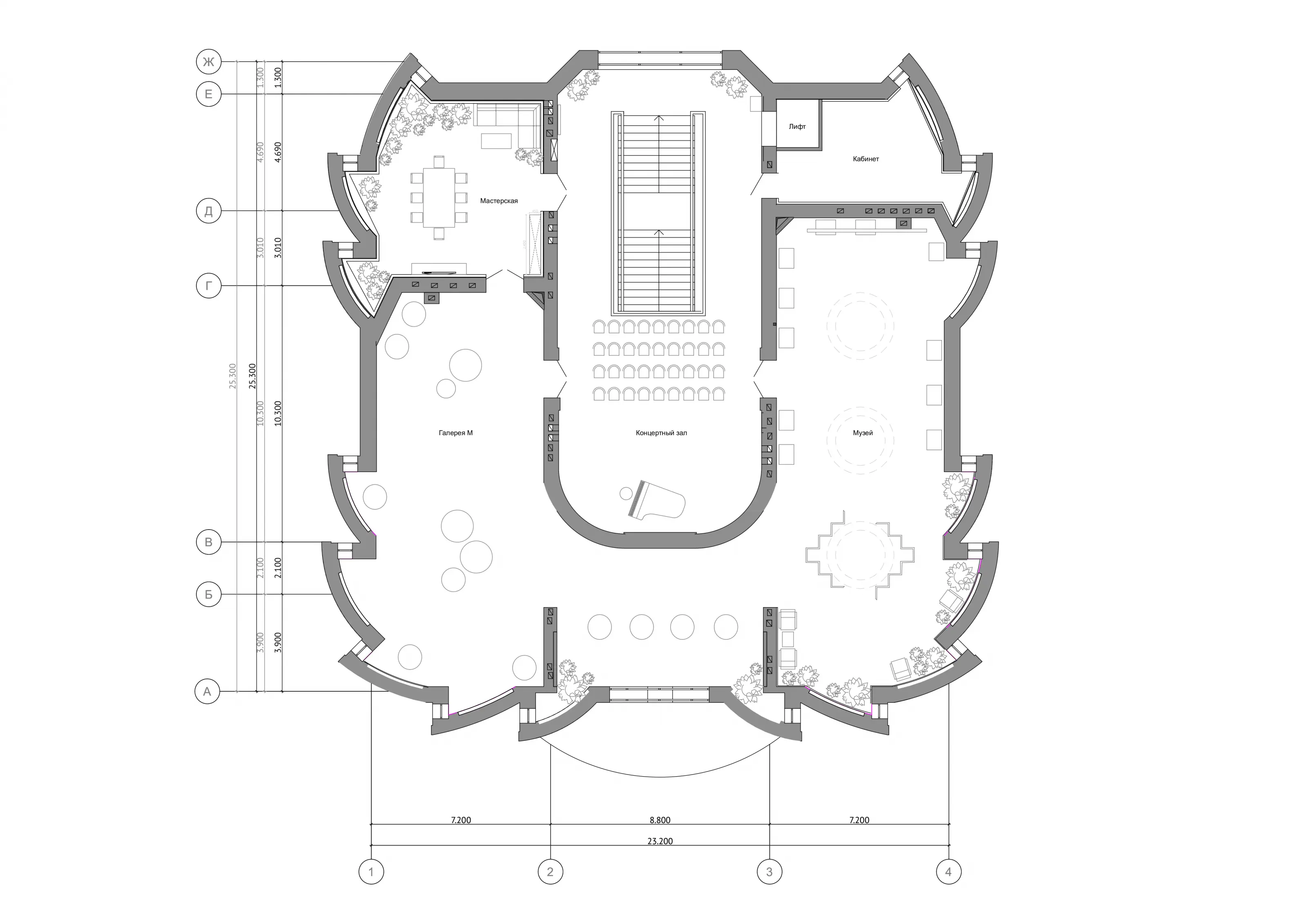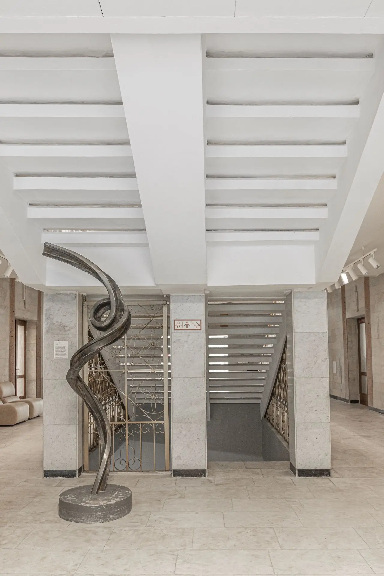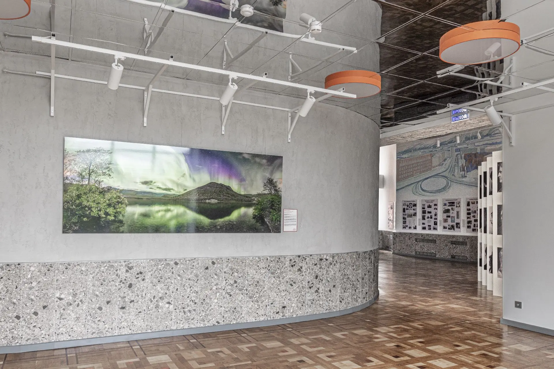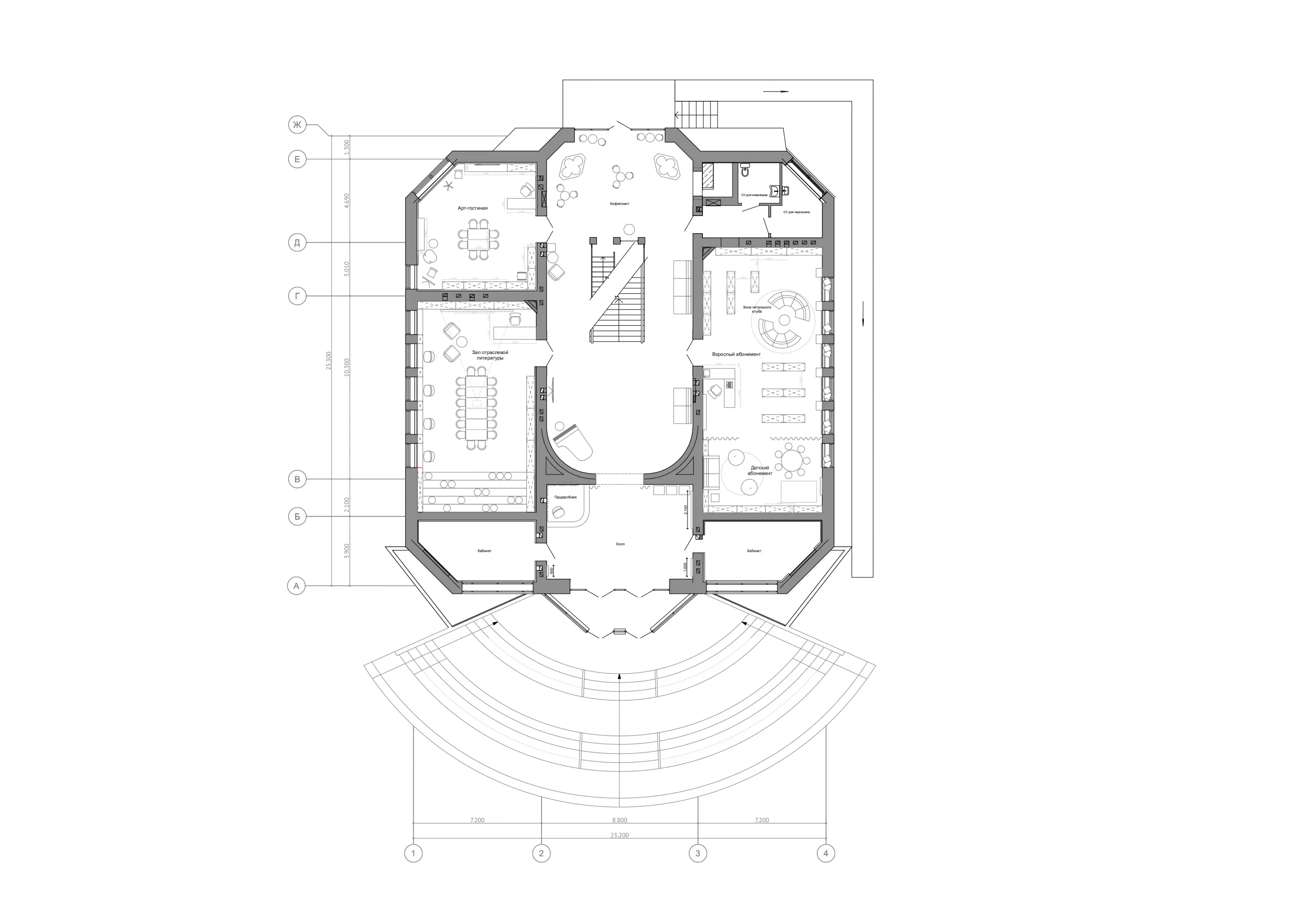 Модернистская архитектура здания и богатая история локации вдохновили дизайнеров на сохранение советского наследия. Они сфокусировались на бережном восстановлении исходных архитектурных особенностей и материалов — песчаника, мрамора, паркета и «парящей» лестницы. При создании визуальной концепции проекта команда студии «Точка дизайна» вдохновлялась эстетикой советской эпохи. Например, необычными фасадами: из-за назначения здания в выполненных в форме флагштоков изгибах люди стали узнавать страницы открытой книги. Архитекторы дополнили их контурной подсветкой, благодаря которой мягкие линии смотрятся особенно интересно в течение полярной ночи. Работа над интерьером началась с обновления инженерных коммуникаций и вентиляции. Первоначальная планировка объекта была удачной, поэтому основные функциональные блоки остались на прежних местах. Изменения коснулись только хозяйственных помещений, которые соседствовали с лифтовой зоной: их пришлось уменьшить, чтобы сделать пространство более инклюзивным. Высокие окна наполнили залы естественным светом, а воссозданное историческое остекление придало сложную игру бликов и отсветов на полу и стенах.