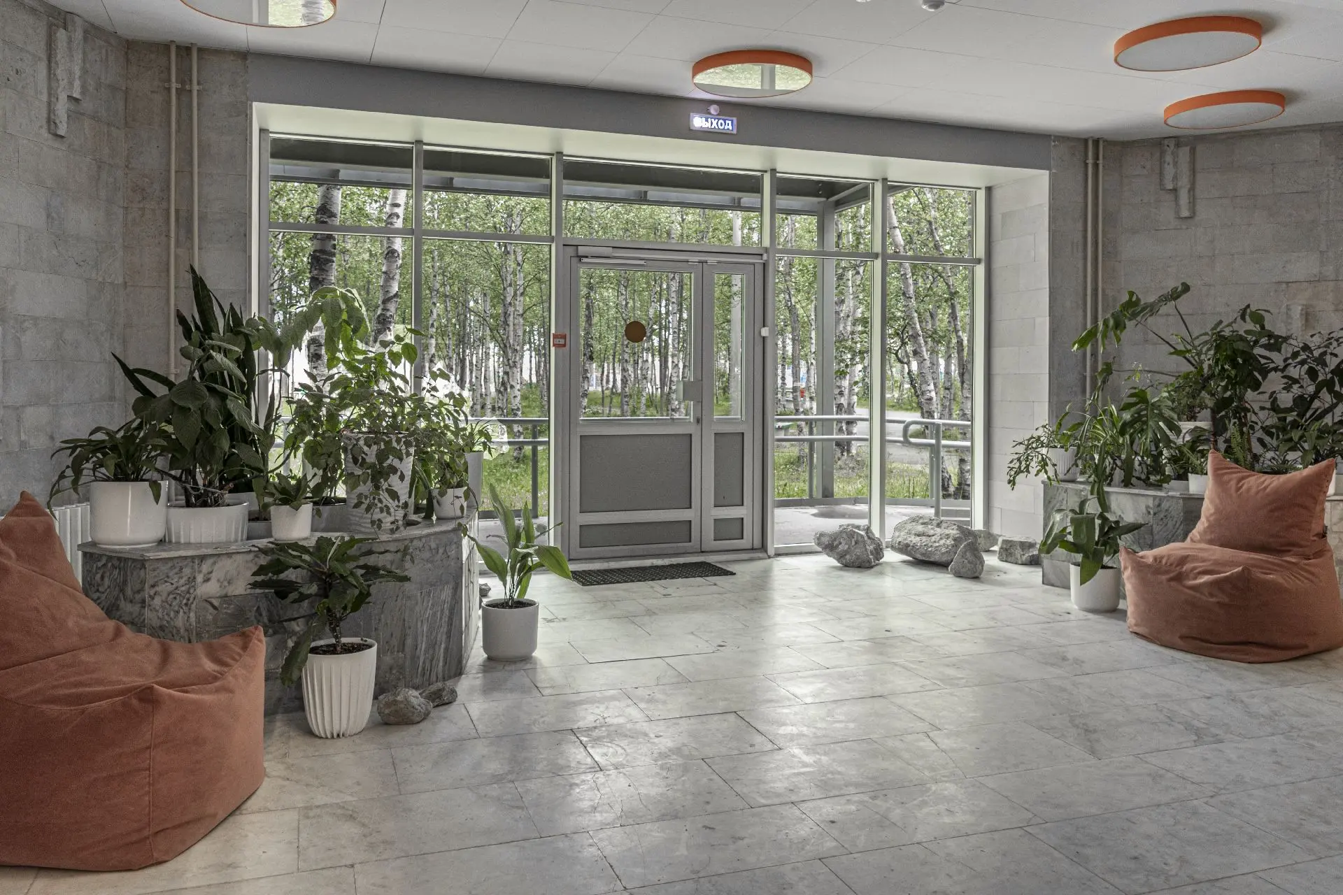 На первом этаже, отведенном под библиотеку, разместились входная зона с холлом и гардеробной, большая читательская зона, зал отраслевой литературы и арт-гостиная, подходящая для мастер-классов и камерных встреч. Каждое помещение Анастасия Юхневич постаралась адаптировать под интересы людей разных возрастов, которые будут приходить сюда в будущем. Главной точкой притяжения посетителей стала зона взрослого и детского абонементов. Ее продуманное наполнение обеспечило многофункциональность пространства: на полукруглых диванах могут собираться участники книжного клуба, а в отделенной портьерами с градиентом части зала — играть дети. Для них установлена отдельная секция детских книг, закуплены бизиборды, мягкие пуфы и столы для рисования. Задорное настроение тут задают круглые ковры, мягкие фактуры и цветные подушки на низких подоконниках для чтения. В помещении напротив, наоборот, царит умиротворяющая атмосфера: сценарии движения строятся вокруг длинного стола на четырнадцать человек. Возле окон расположились индивидуальные рабочие места с доступом к интернет-библиотеке, а в глубине пространства — «трибуна» для отдыха и проведения лекций. Малый зал, выполненный в духе арт-галереи, подходит для узконаправленных мастер-классов, которые будут регулярно проводиться по графику. Акцентной деталью интерьера выступила лестница из белого мрамора, ведущая на второй уровень. За ней скрывается кофе-пойнт с яркими оранжевыми столиками и креслами. Панорамное остекление этой зоны открывает живописный вид на березовую рощу, а оформленные светлым камнем клумбы с живыми растениями обеспечивают ее визуальную связь с экстерьером и «впускают» природу в холл.
