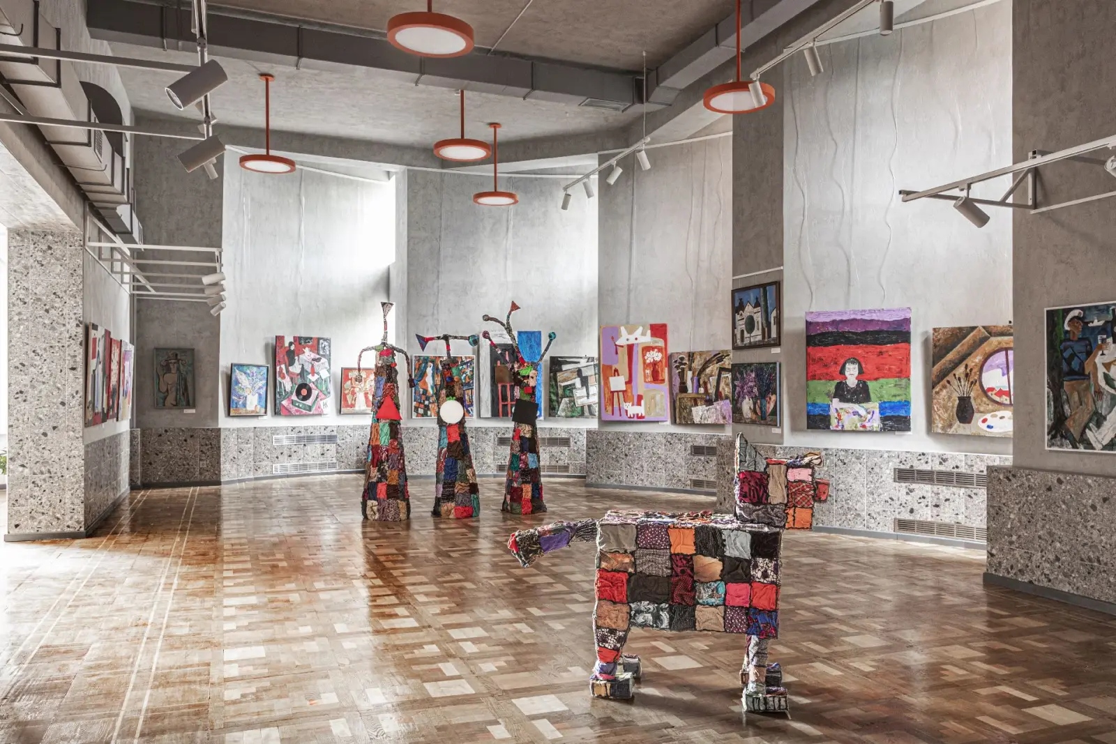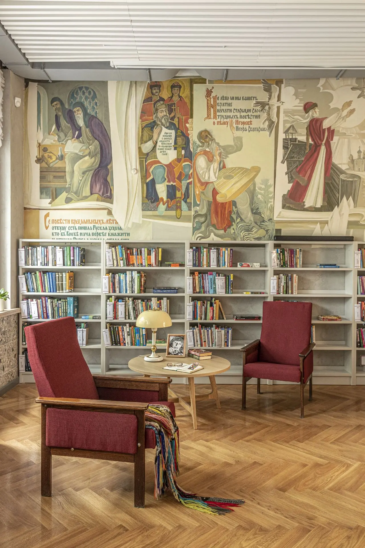 Холодная палитра цветов, использованных на фасадах, легла в основу интерьерных решений. Мурманская область, к которой относятся Апатиты, расположена в северном регионе и соседствует со Скандинавскими странами. Активный культурный обмен с Данией, Финляндией и Швецией повлиял на визуальные предпочтения горожан. Привычные сочетания серого, белого и красного интуитивно понятны местным жителям, поэтому их решили сохранить и дополнить фактурными деталями. Мебель в проекте довольно нейтральная: стулья из светлого дерева, отреставрированные кресла и перетянутые диваны не изменяют прежнее настроение интерьера, а просто делают его более современным. Бархатистые ткани обивок сбалансировали строгие отделочные материалы — природный мрамор, характерный для советских учреждений ракушечник и декоративную штукатурку под бетон на стенах одного из залов. Анастасия Юхневич и другие дизайнеры старались во всем сохранить и достоверно повторить оригинальную отделку: даже поврежденный временем кусок мрамора был заботливо заменен подобранным в тон материалом. Ощущением уюта и тепла интерьер наполнили яркие акценты — в том числе, оранжевые светильники, отсылающие к образу солнца. Его силуэт часто дублируется в круглых коврах, а оттенок — в текстиле и декоре. Симметрии и дополнительного объема в помещение привнесли зеркальные потолки и гипсовая лепнина. Специальная система освещения с разными сценариями была разработана командой студии вместе с петербургскими светодизайнерами MDM Light. В дизайн-проект были интегрированы лаконичные лампы и абажуры, которые облегчили торжественность найденных на Авито люстр под хрусталь. Так, обычная городская библиотека в Апатитах превратилась в культурный центр, миссия которого — сделать литературу и искусство более доступными для жителей города. Благодаря обновлению пространства они больше вовлекаются в современный контекст и обретают место для общения и досуга. Здесь проводятся кружки, концерты, встречи по интересам и детские развивающие мероприятия. В работе над проектом участвовали десятки неравнодушных людей — дизайнеры и архитекторы, представители администрации, губернатор области и телеведущий Андрей Малахов. По инициативе последнего к оформлению пространства присоединился художник Валерий Чтак: из-под его руки вышли аккуратные росписи на стенах галереи. Фрески, пострадавшие из-за потопа в ходе ремонта, восстанавливали при помощи выпускников Суриковского училища. Им удалось передать авторскую стилистику изображений и дух разных временных периодов, от образов Кирилла и Мефодия до Владимира Маяковского.