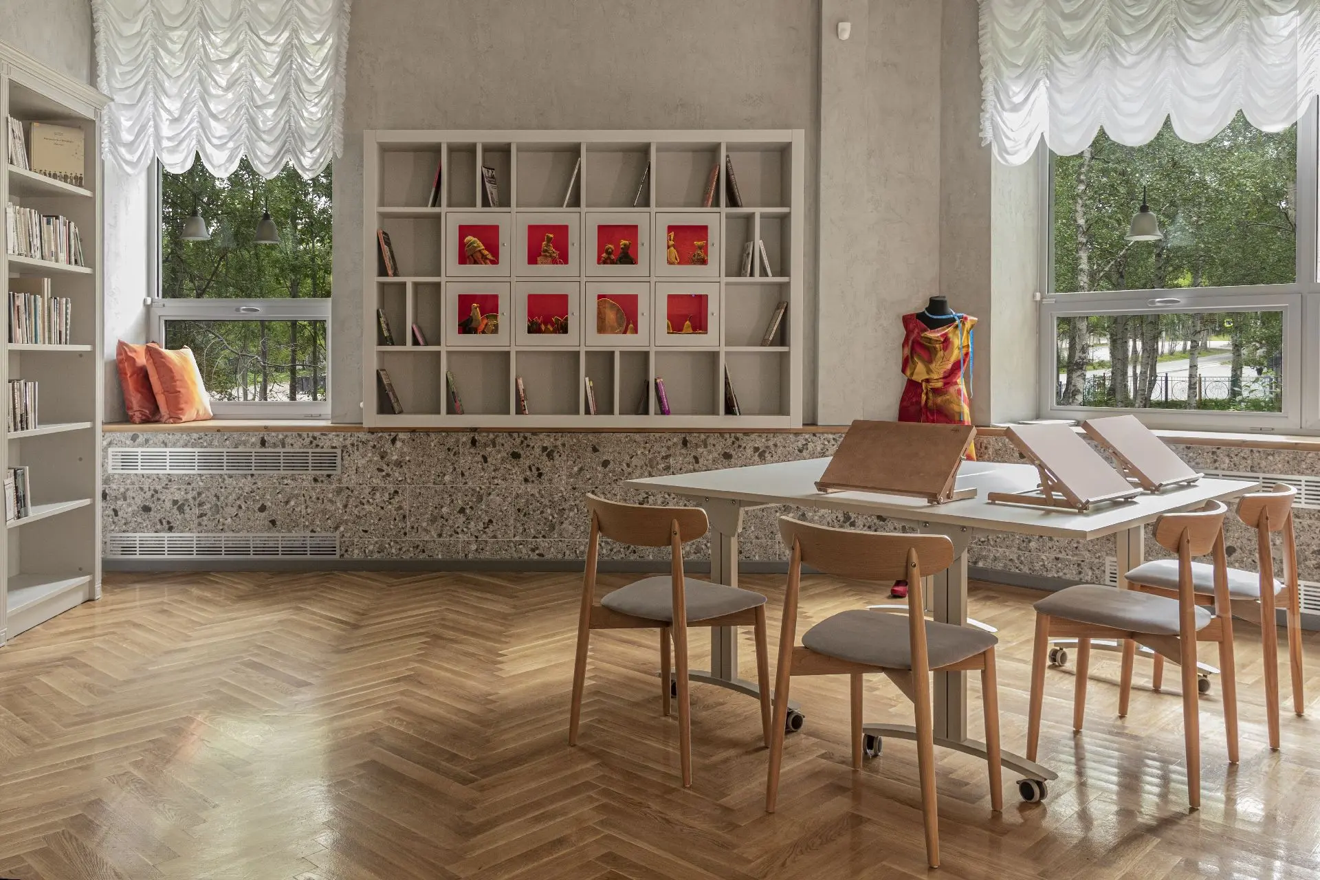 Площадь верхнего этажа была разделена между краеведческим музеем, современным выставочным пространством и концертным залом с роялем. Три года назад в этом самом месте проходила выставка работ из коллекции Андрея Малахова «В холодном климате, с любовью», сразу после которой библиотеку закрыли на реконструкцию. То есть еще до преображения здания оно уже начало работать по-новому: события стали более масштабными, возрос интерес жителей к библиотеке. Более того, именно организованная московскими дизайнерами и куратором Кристиной Дрягиной выставка помогла привлечь внимание общественности к реконструкции здания и добиться увеличения бюджета. Всего за несколько недель команда студии «Точка дизайна» подготовила сильный дизайн-проект, который кратно превосходил предыдущий план реновации и был быстро согласован — так началась работа над проектом. Перед долгожданным открытием здесь появились постоянные и временные экспозиции, положившие начало насыщенной культурной программе. Ее художественный совет также разрабатывал вместе с Андреем Малаховым, который активно участвует в развитии своего родного города. В пространстве уже выставлялись картины Энди Уорхола и японского художника Такаши Мураками. Обновленный центр продолжит вовлекать жителей Апатитов в культурные процессы и ближе знакомить их с современным искусством. Особое внимание в проекте уделено небольшой комнате, которая изначально была оформлена дермантиновыми панелями. Во времена выставки «В холодном климате, с любовью» там сделали инсталляцию: расставили живые цветы и встроили УФ-лампы, напоминающие о местной традиции использования искусственного освещения для домашних растений. Тогда это пространство стало визитной карточкой библиотеки, а неоновая надпись с названием выставки натолкнула основателя студии «Точка дизайна» Степана Бугаева на идею о сочетании акцентного розового цвета с коричневой отделкой стен. В результате дермантин сменился гипсовыми панелями из-за требований пожарной безопасности, но расслабленная атмосфера и тактильные материалы были сохранены. Мягкие диваны с пастельно-розовой обивкой здесь соседствуют с большим столом и креслами в том же оттенке: оформление выглядит настолько неформальным и стильным, что даже глава городской администрации проводит там планерки и онлайн-встречи.