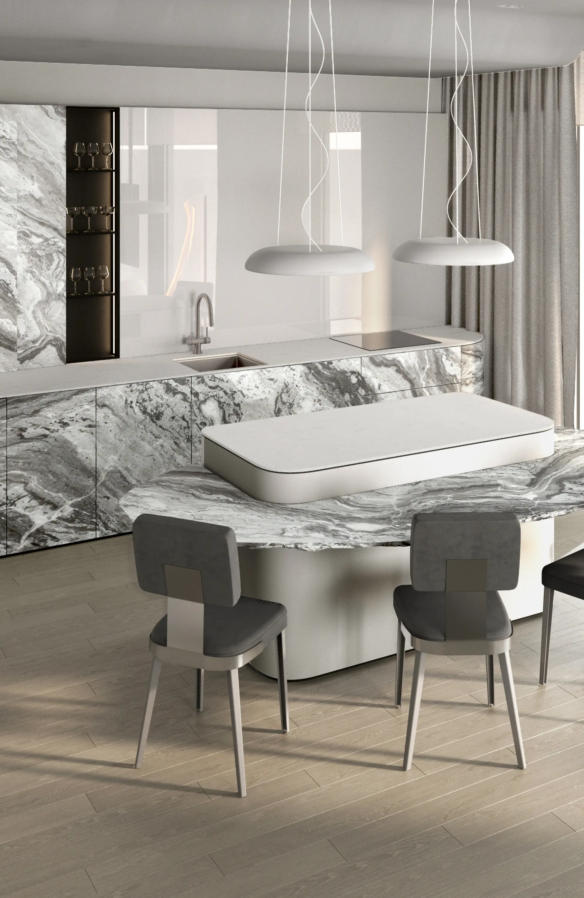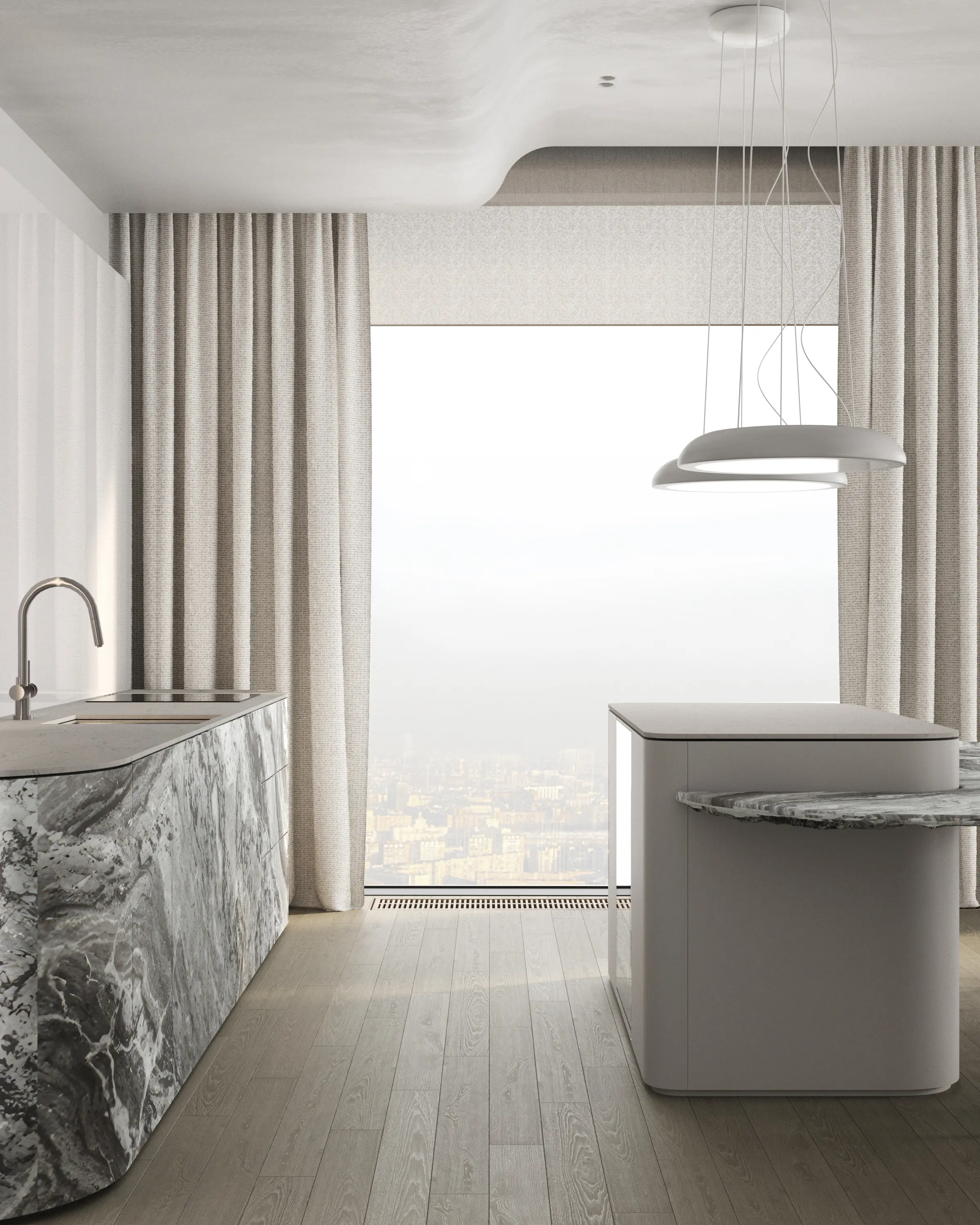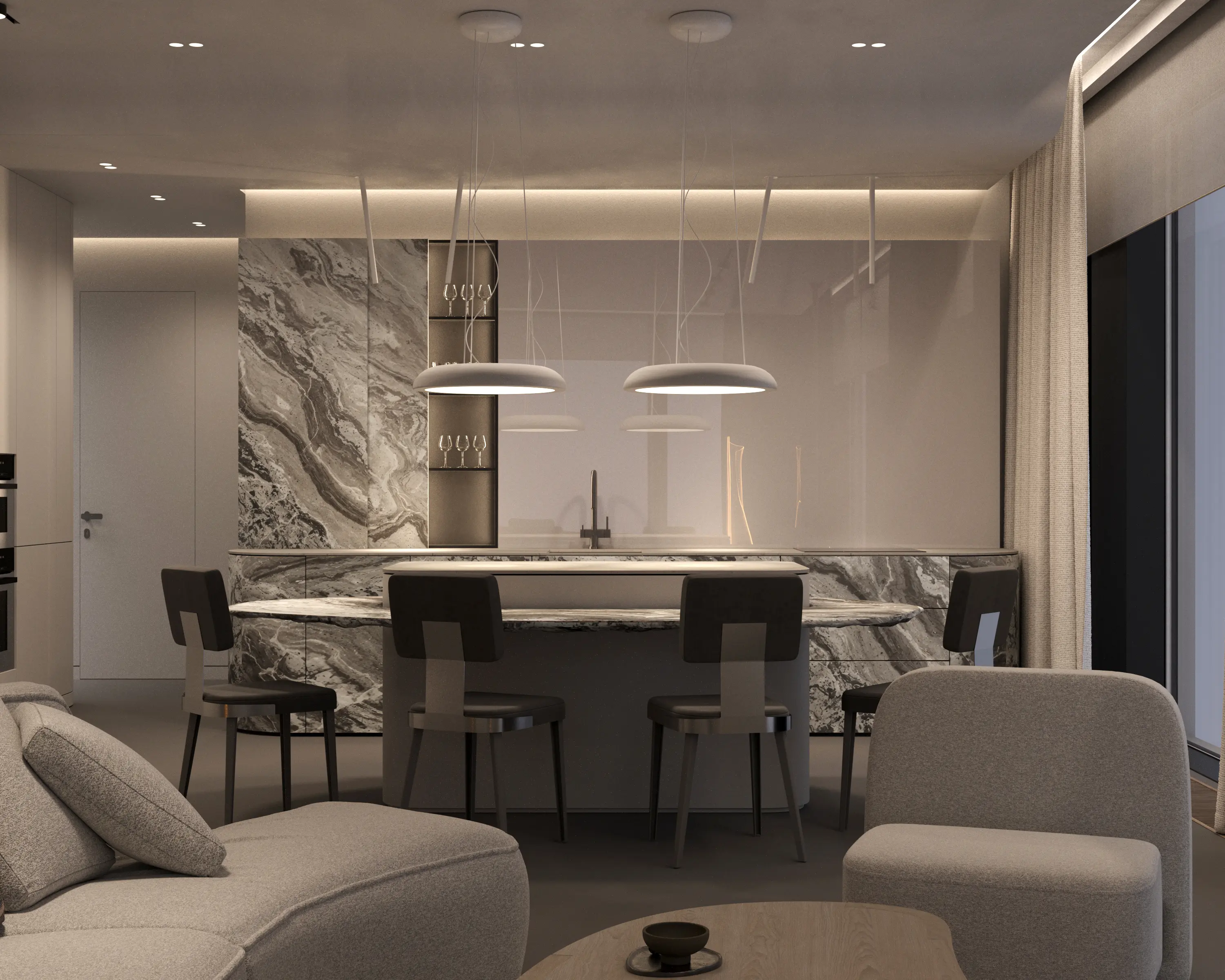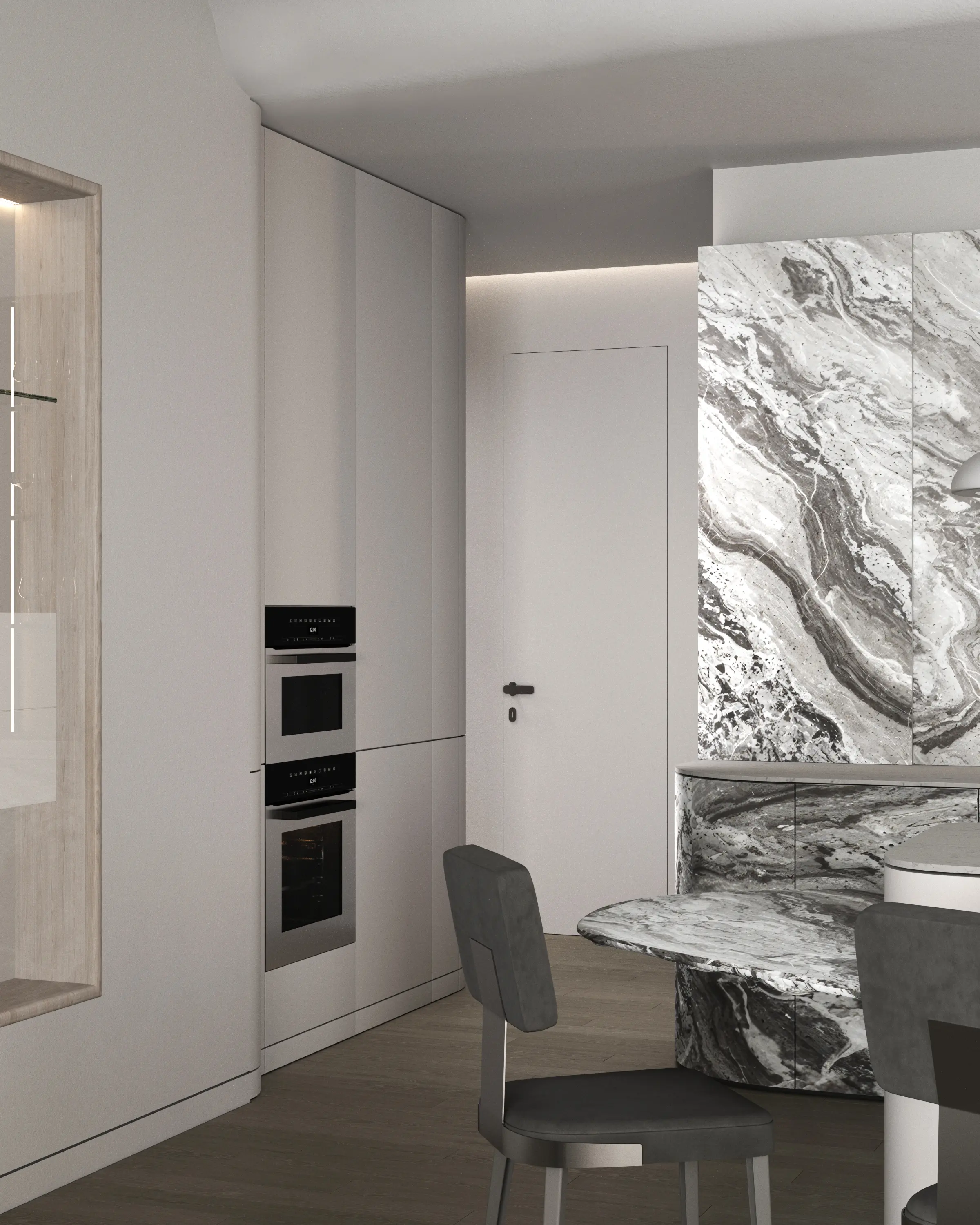 Дизайн-проект в ЖК Capital Towers для ценителя минимализма и строгости! Квартира площадью 104 м² оформлена в духе аскетизма. Мы создали пространство с минимальным количеством мебели, акцентируя внимание на полукруглых линиях и текстурах шпона мрамора.