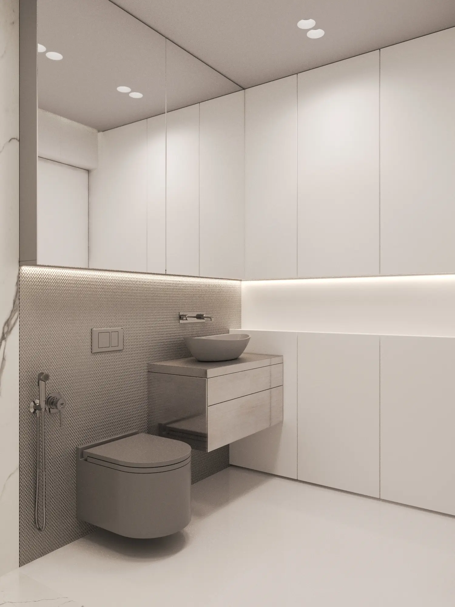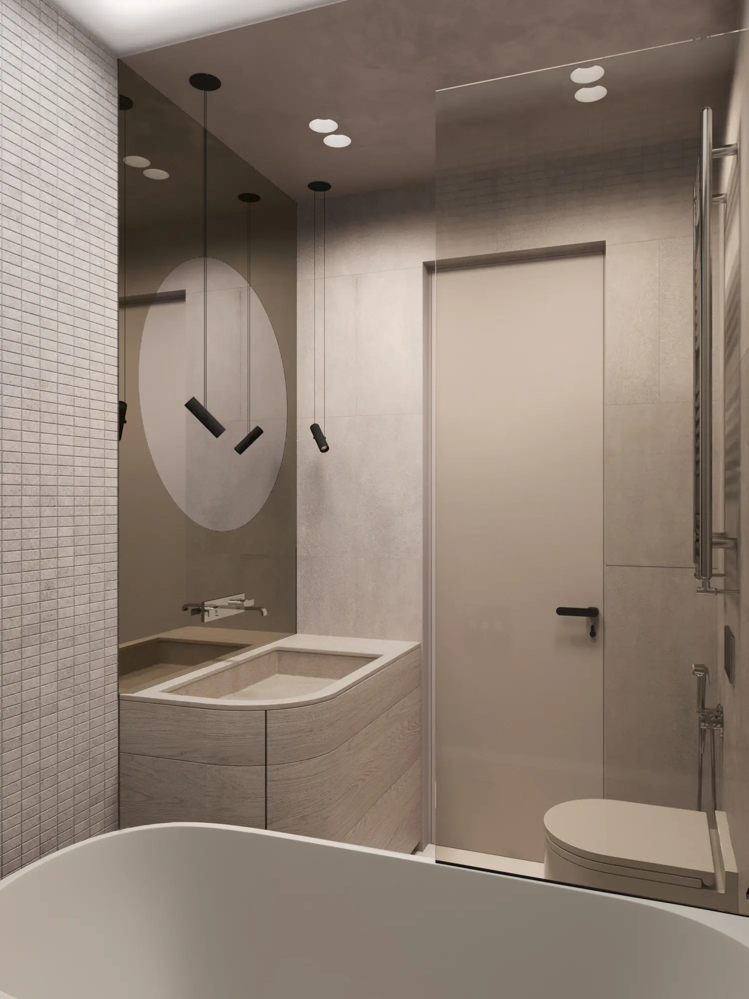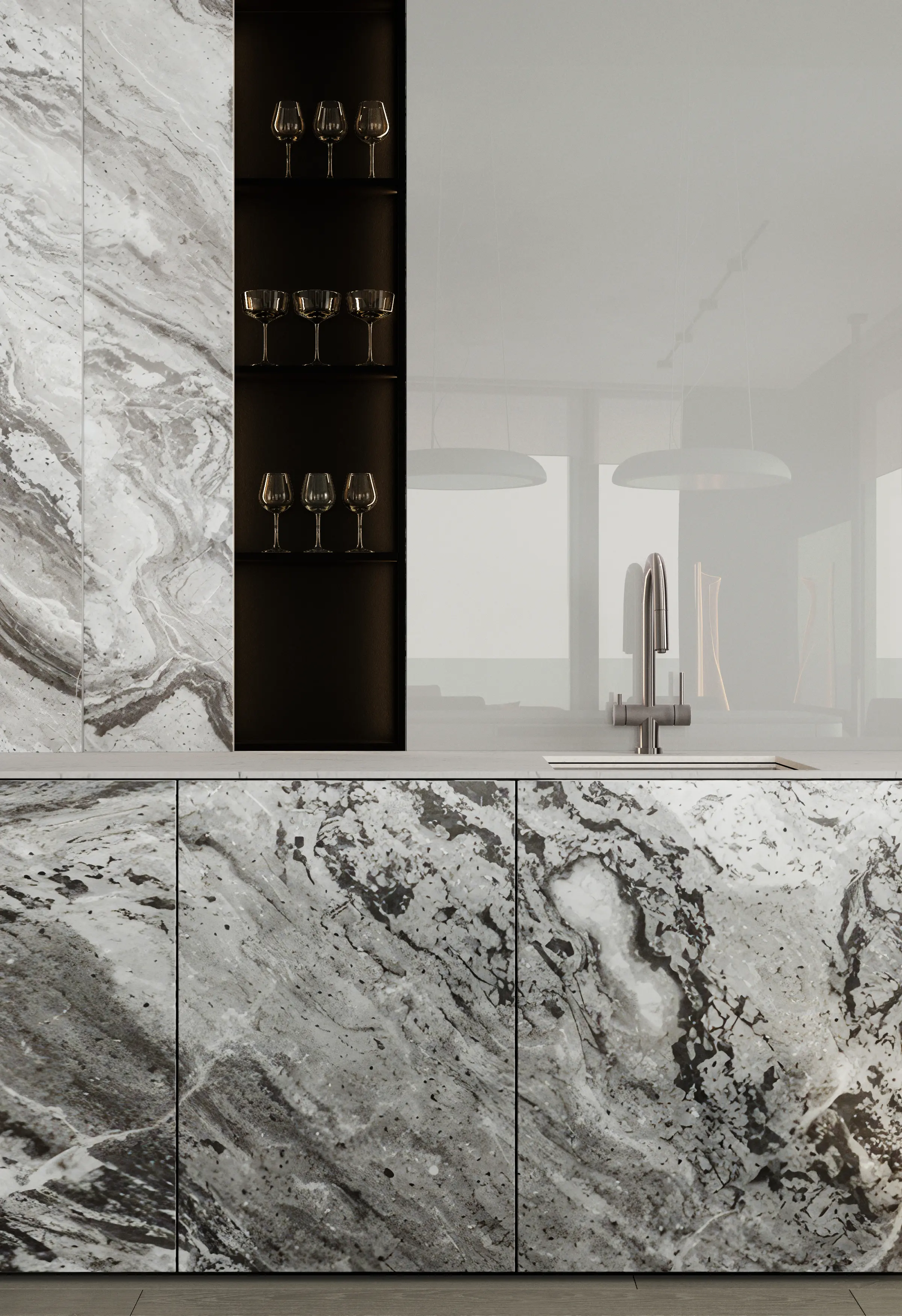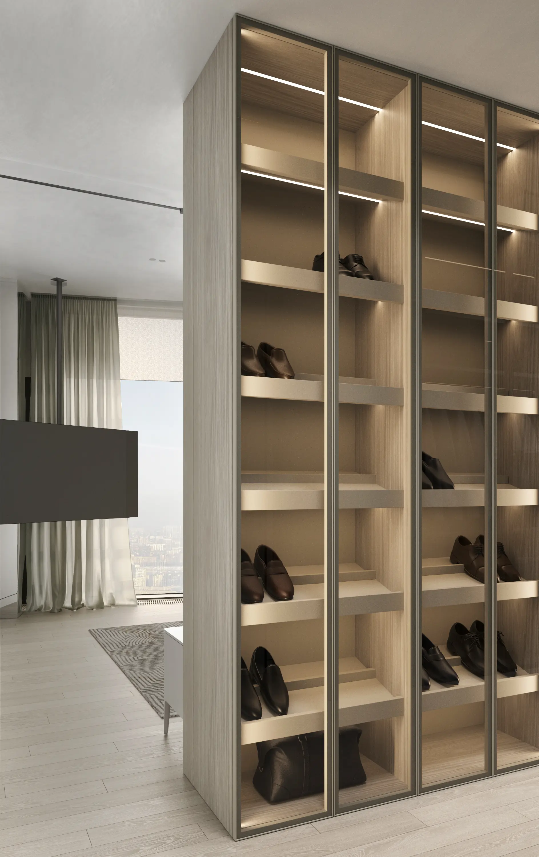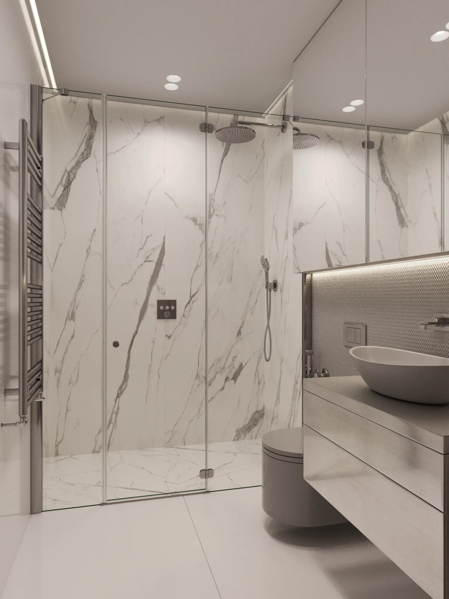 Дизайн-проект в ЖК Capital Towers для ценителя минимализма и строгости! Квартира площадью 104 м² оформлена в духе аскетизма. Мы создали пространство с минимальным количеством мебели, акцентируя внимание на полукруглых линиях и текстурах шпона мрамора.
