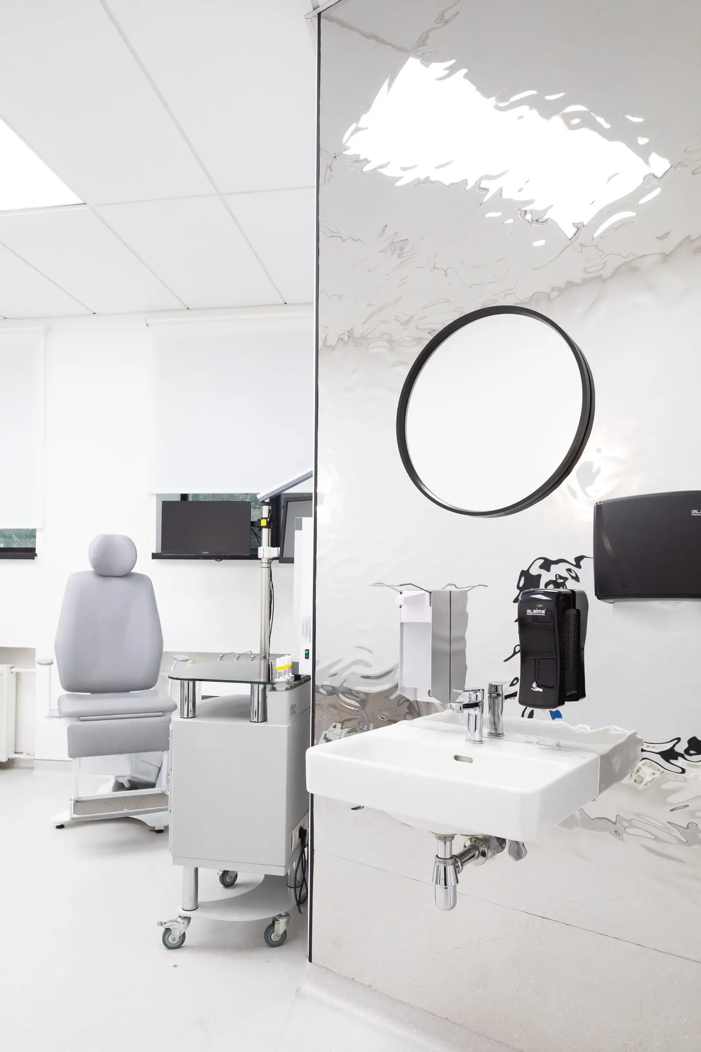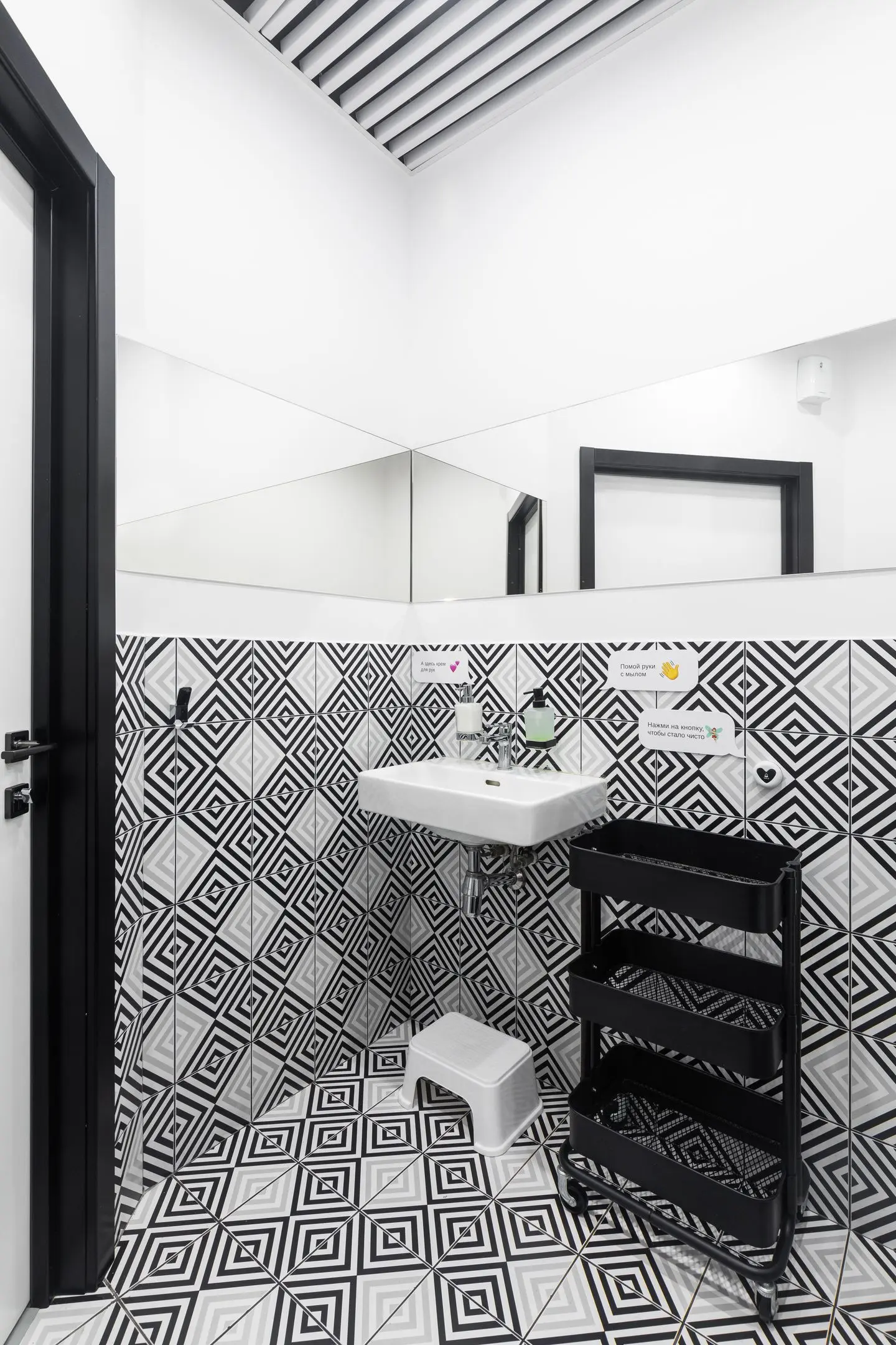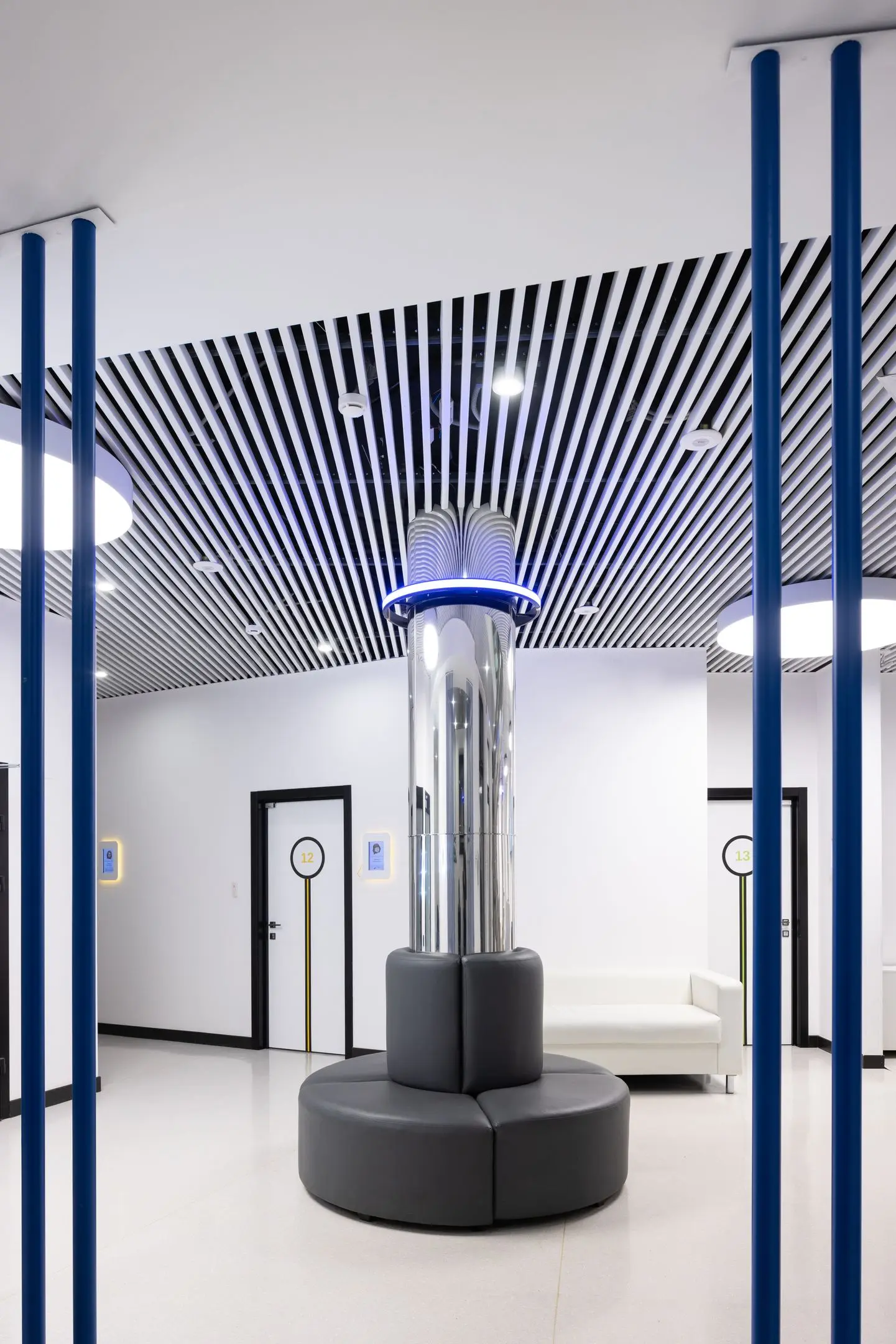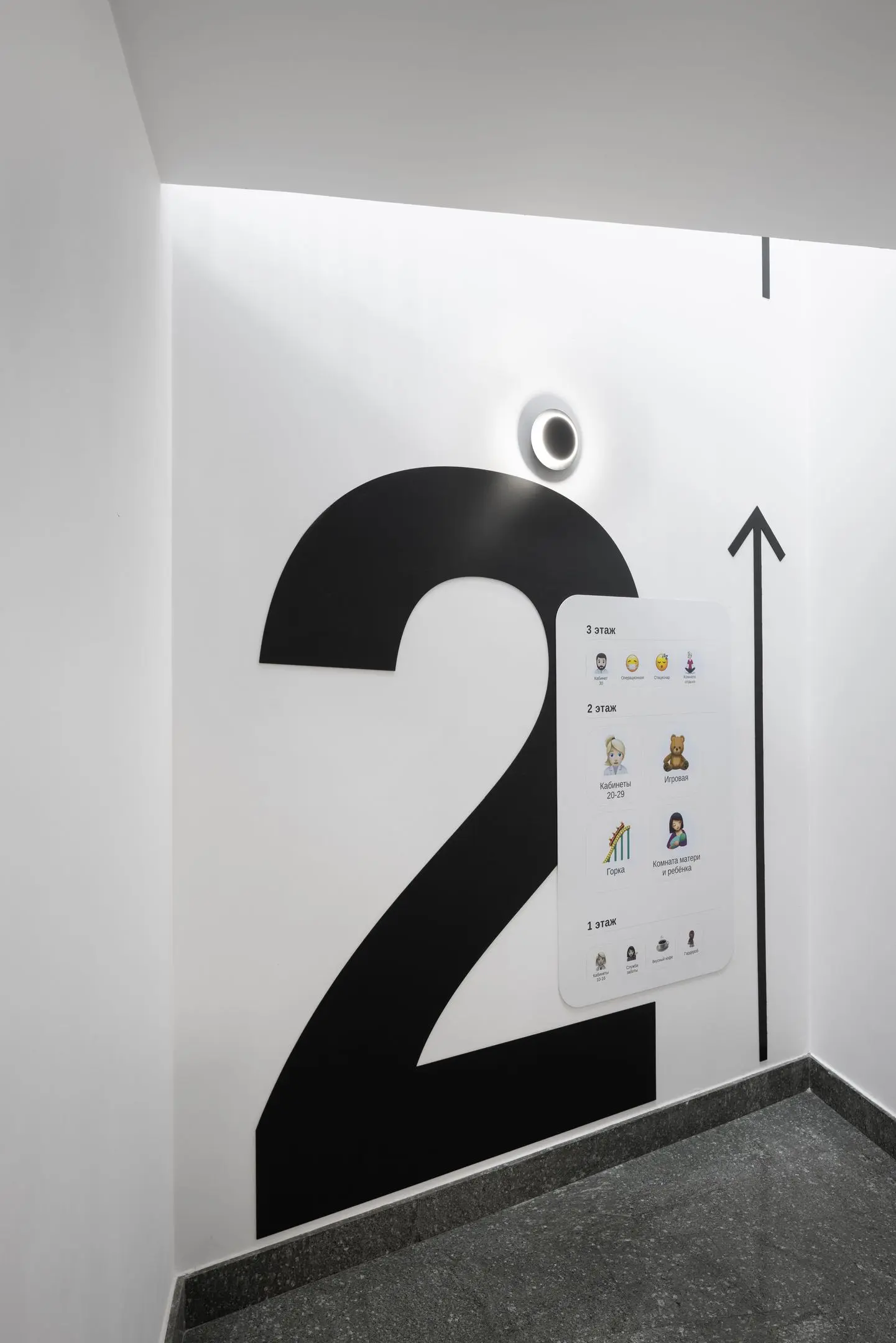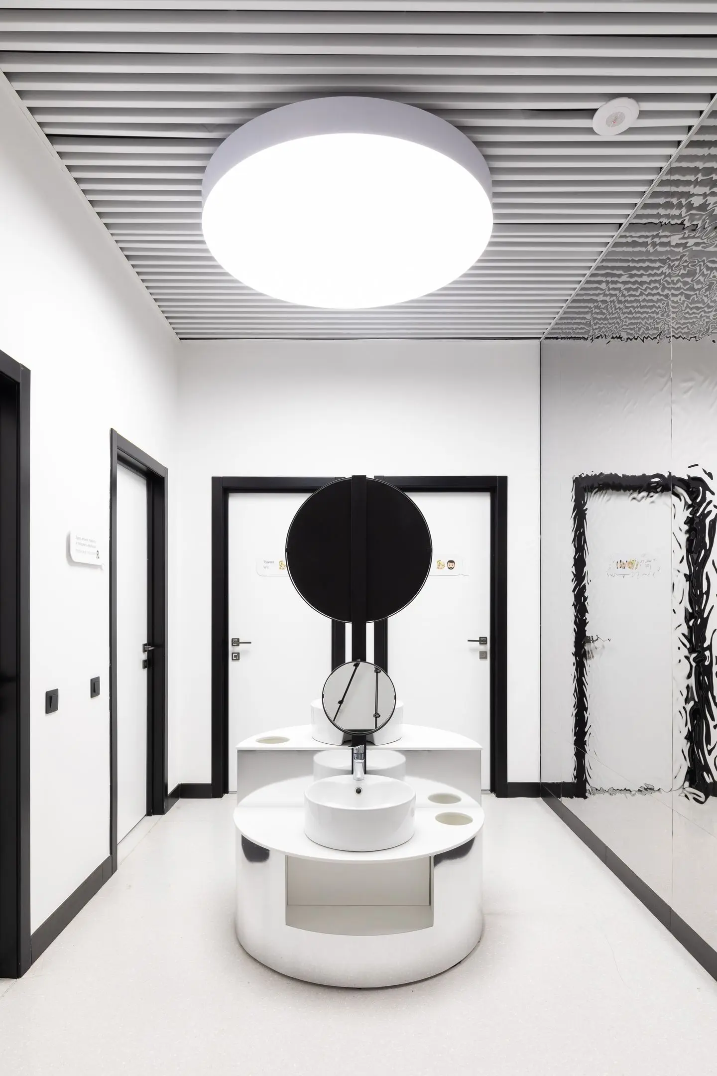 Палитра интерьера полностью построена на сочетании белого и черного с акцентами в виде металлических поверхностей. К этому фону добавили яркие акценты в виде элементов навигации и перегородок, которые помогли отразить айдентику бренда.