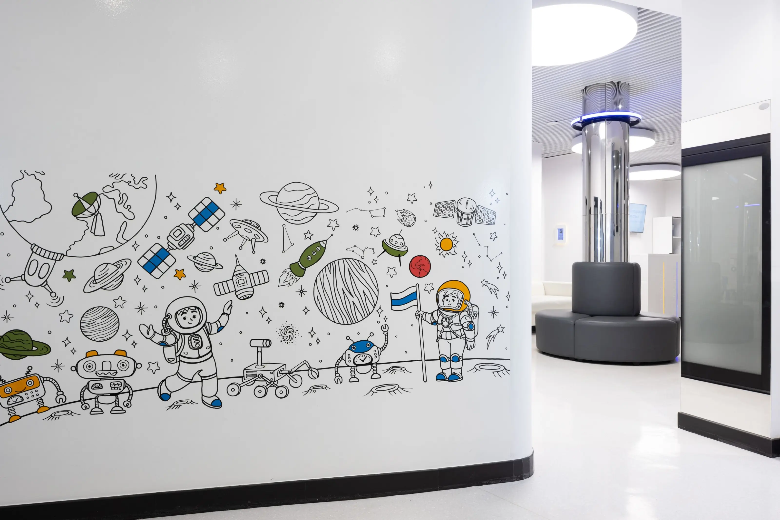 Однако ощущение холодности нивелируется возможностью рисовать на стенах, управлять светодиодными светильниками, кататься с горки, соединившей два этажа, играть и читать в специально продуманных для этого зонах — яркими красками, которые способны привнести сами посетители центра.