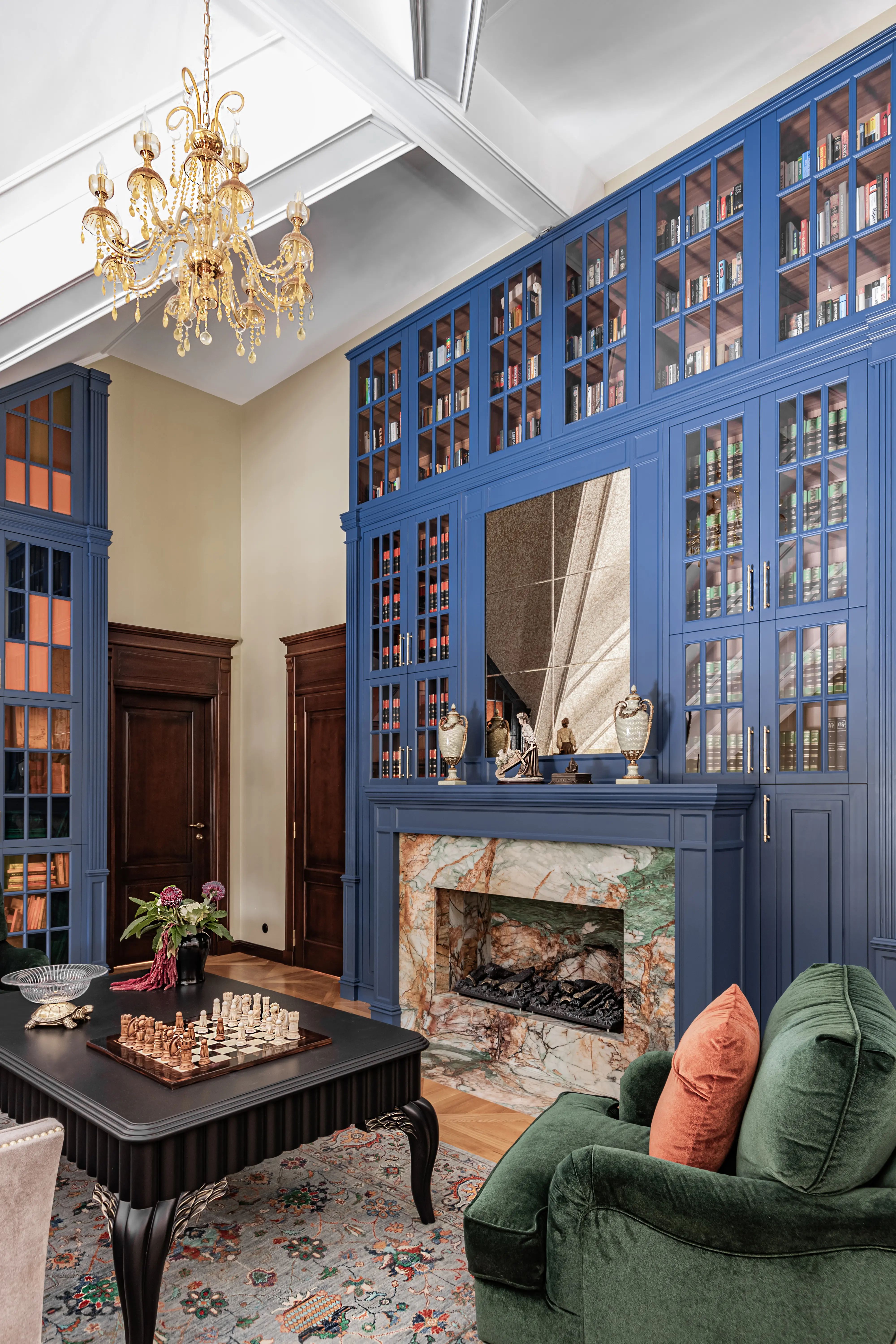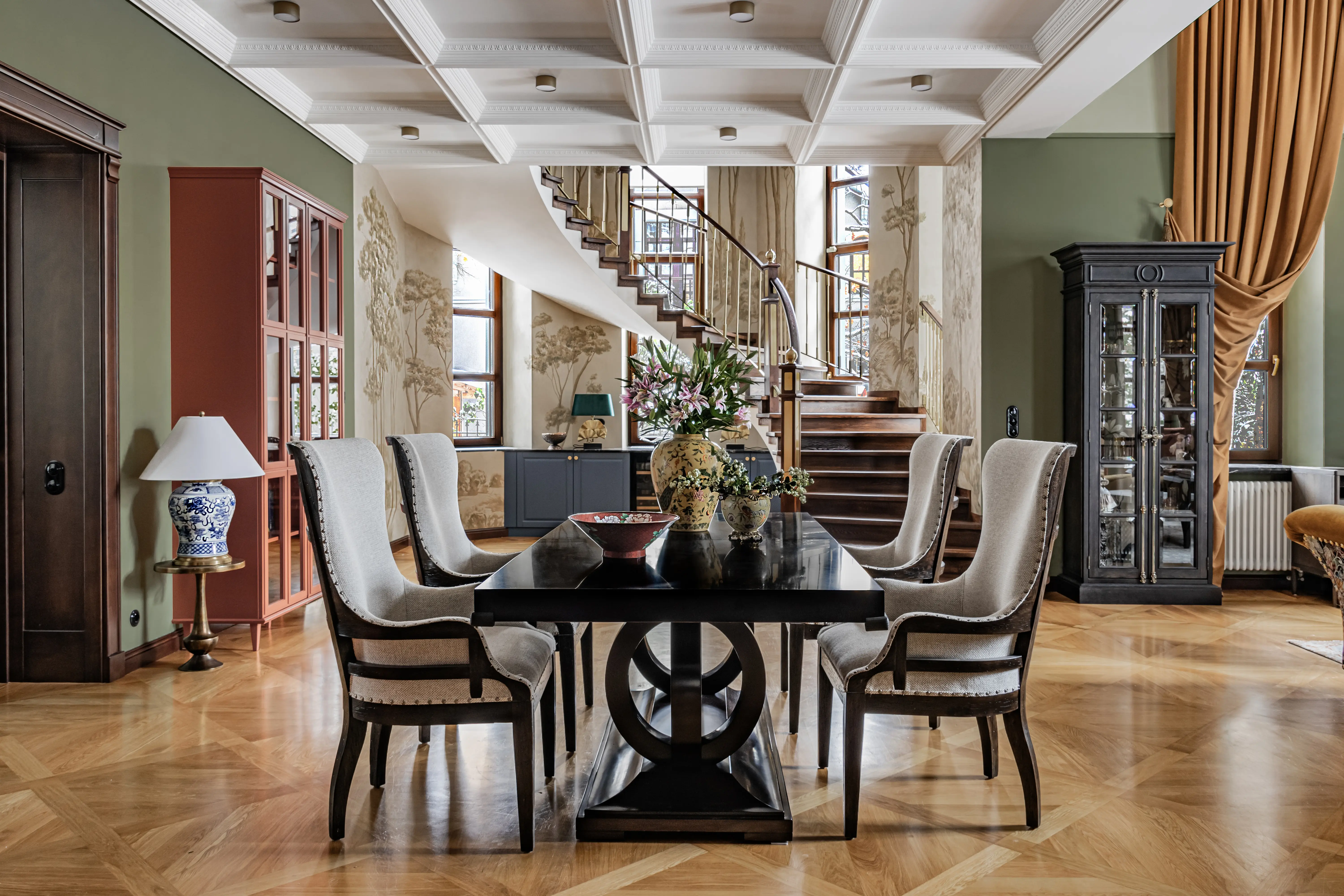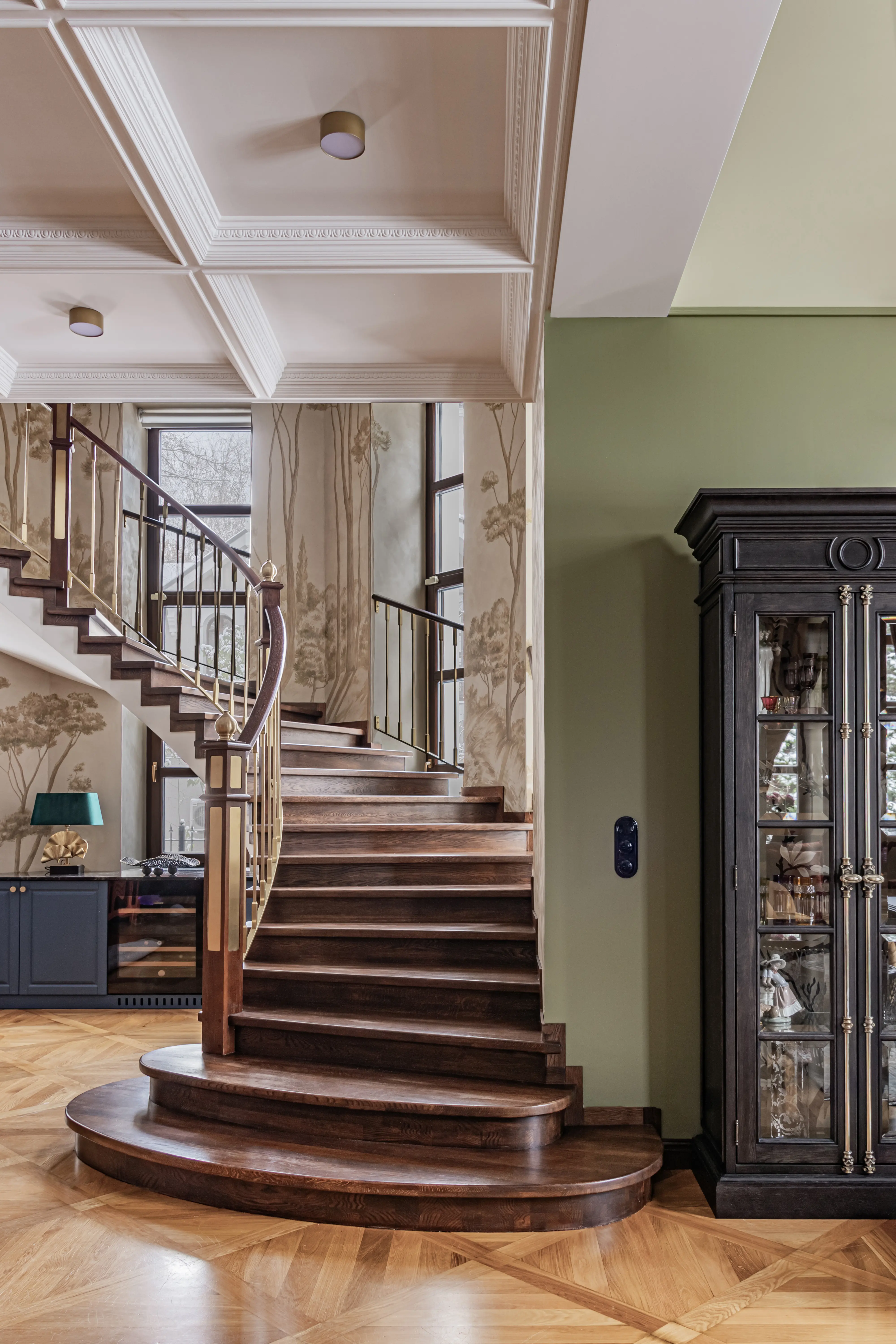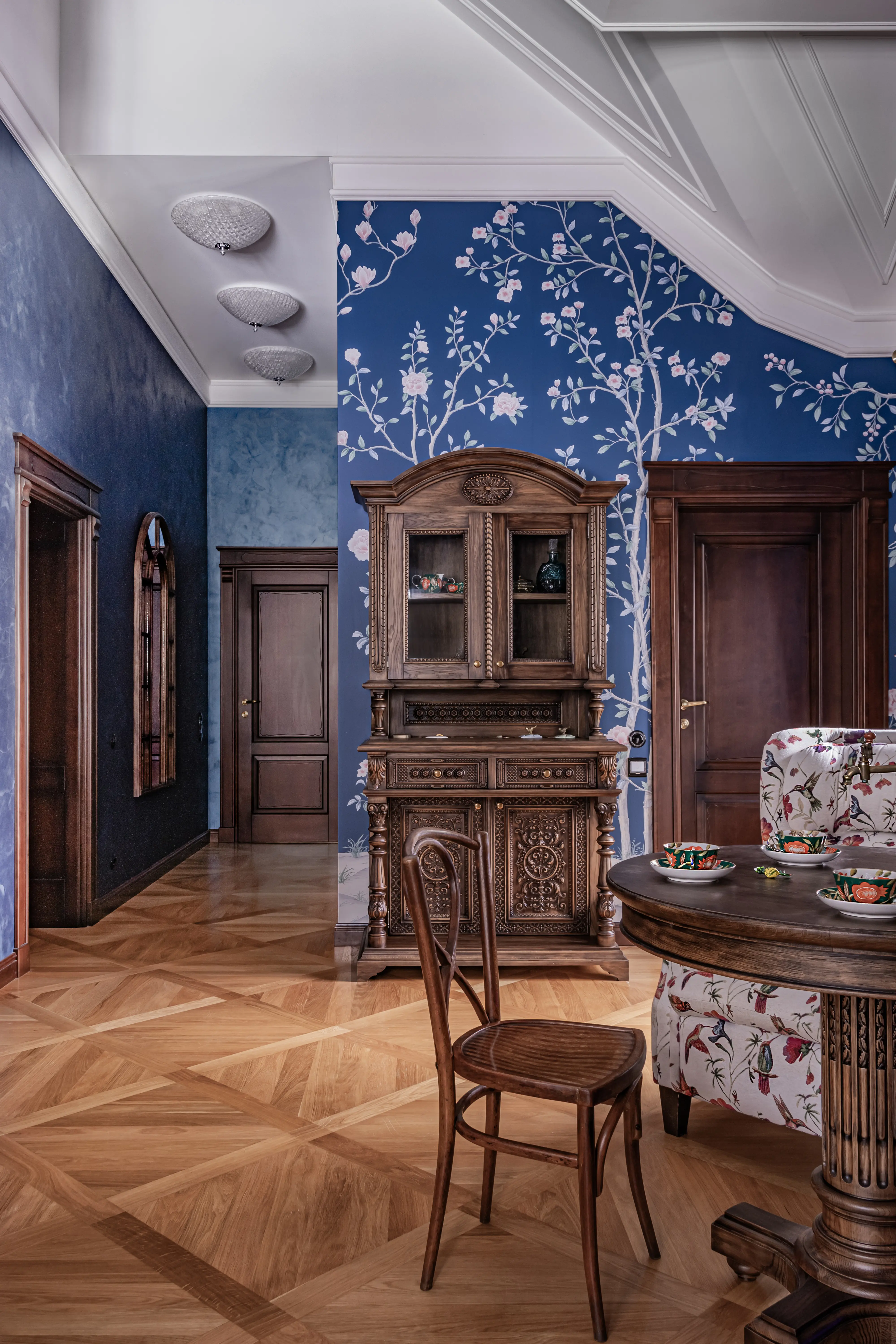 «Прочувствовать» предпочтения клиентов Надежде помогло вдумчивое изучение прежнего интерьера. Оказалось, что огромную симпатию супруги питают к красным, синим и зеленым тонам, которые легли в основу цветовой гаммы. В итоге дизайн-проект получился крайне сложным и многогранным — неудивительно, что его реализация потребовала совместной работы всей команды студии.