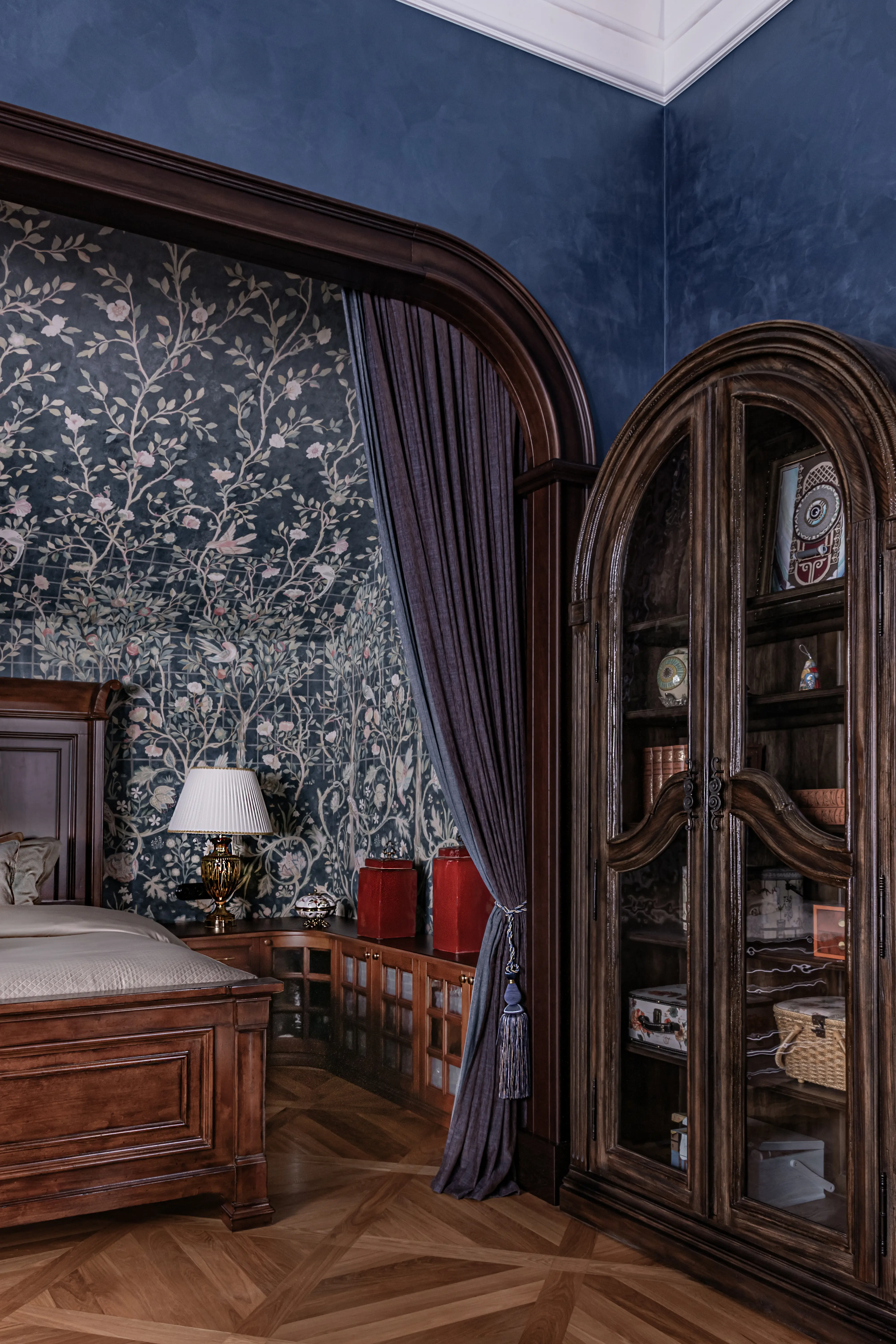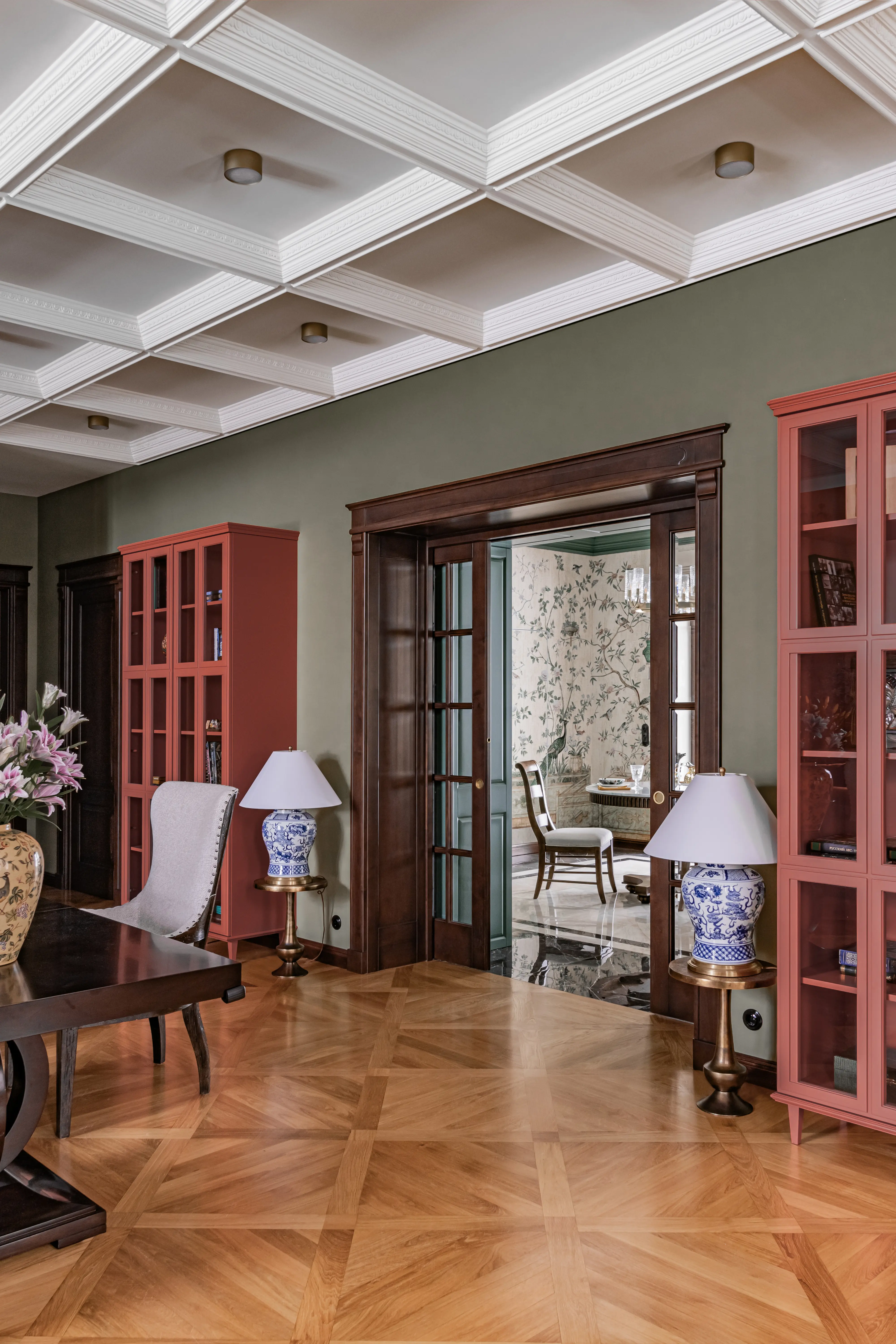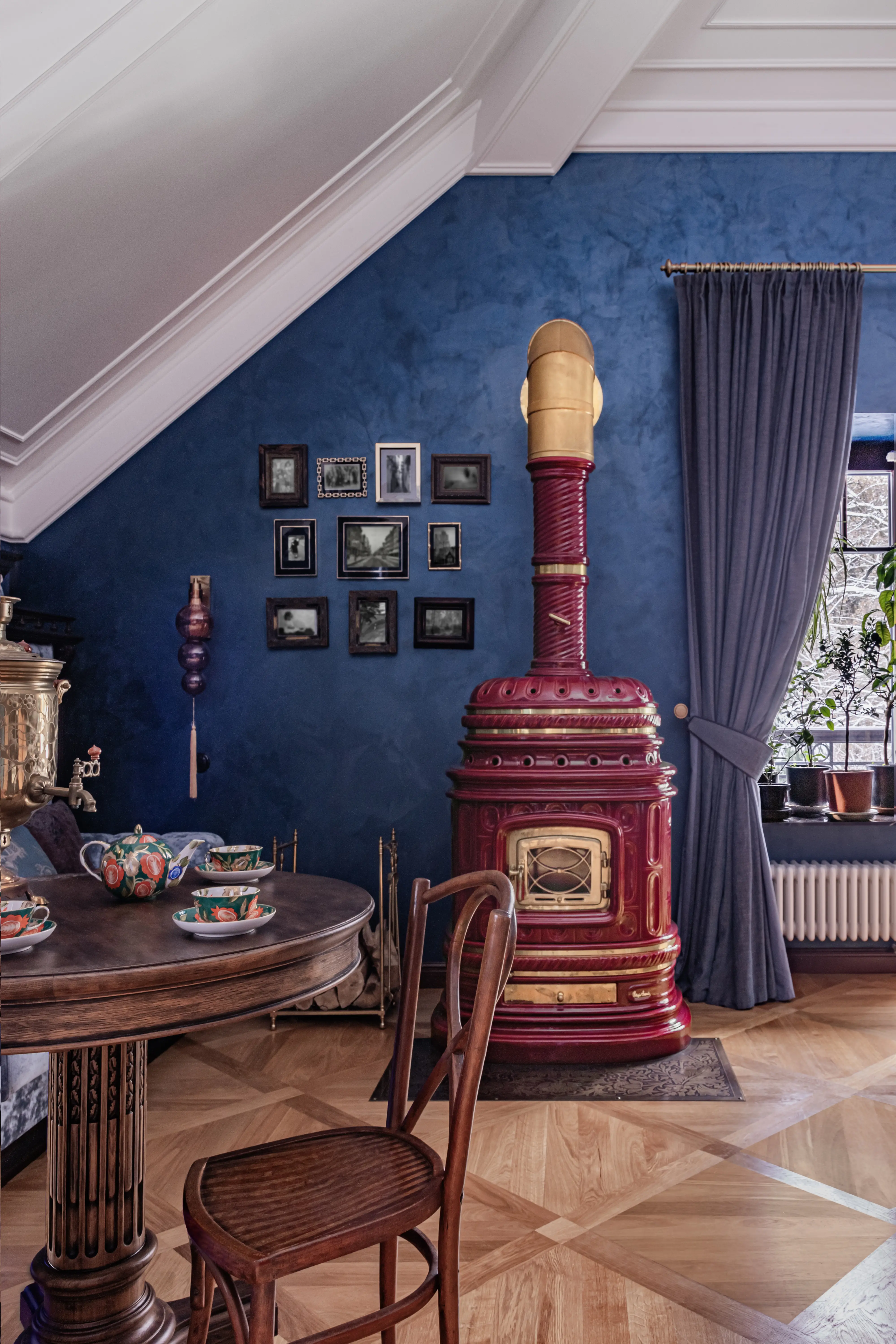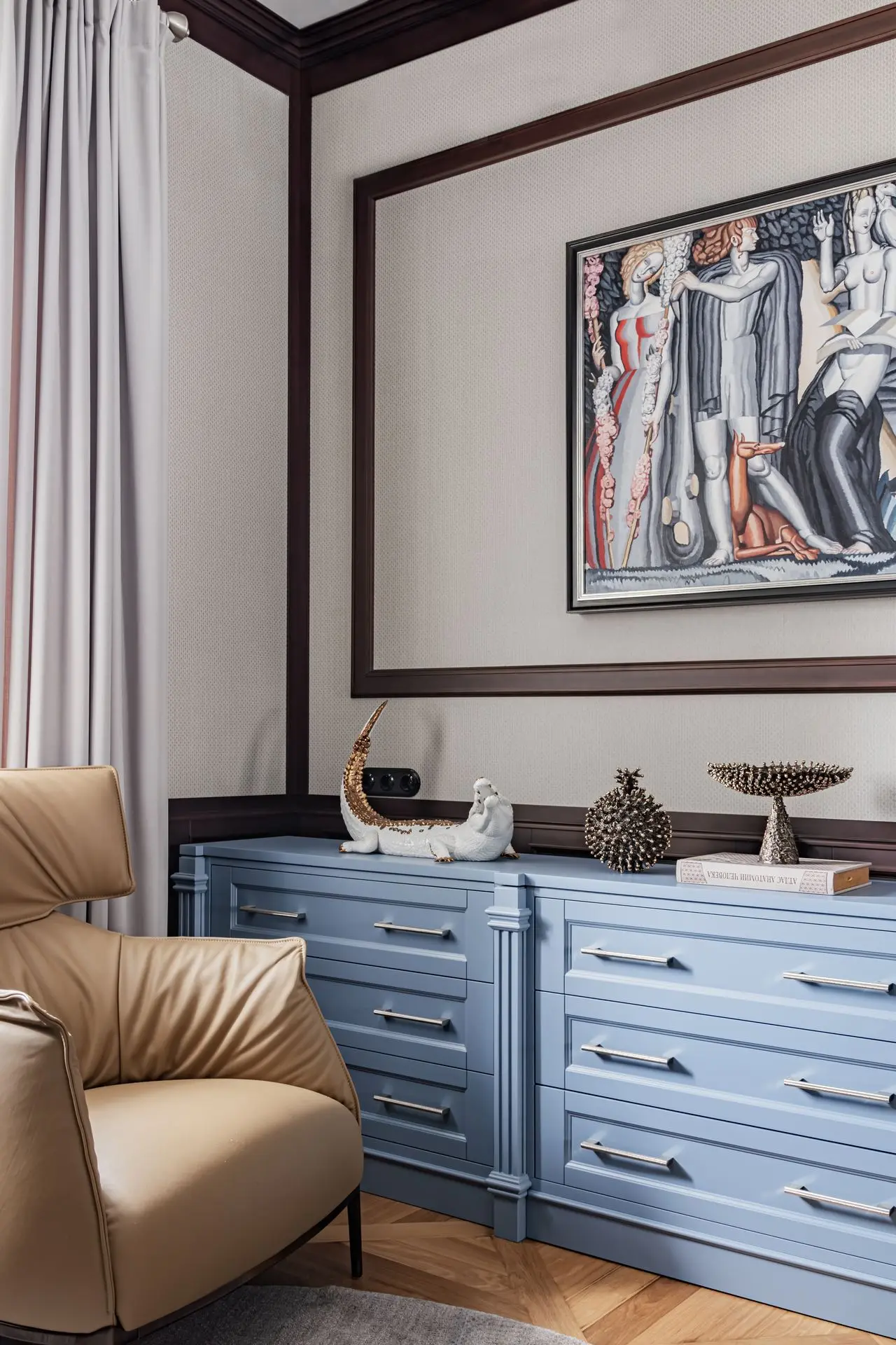 «Прочувствовать» предпочтения клиентов Надежде помогло вдумчивое изучение прежнего интерьера. Оказалось, что огромную симпатию супруги питают к красным, синим и зеленым тонам, которые легли в основу цветовой гаммы. В итоге дизайн-проект получился крайне сложным и многогранным — неудивительно, что его реализация потребовала совместной работы всей команды студии.