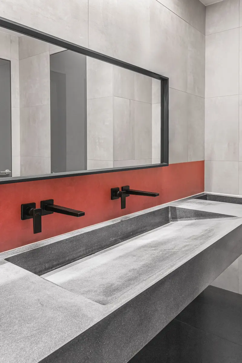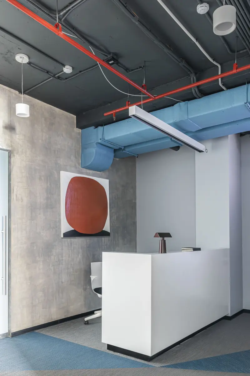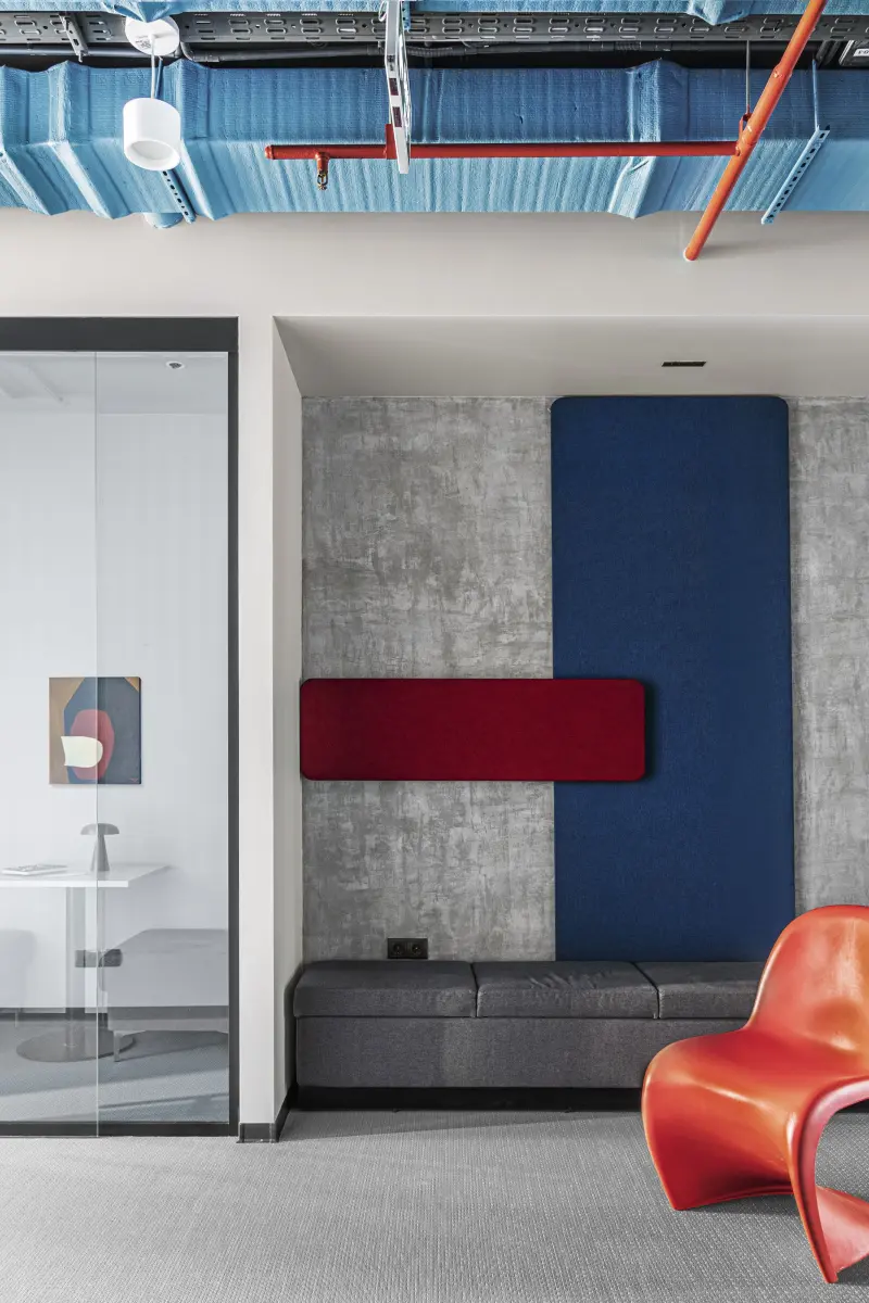 Исходная планировка объекта была довольно удачной: в огромном помещении площадью более трехсот пятидесяти метров были выделены только границы санузла. Его дизайнеры предложили расширить за счет широкого коридора, чтобы сделать более светлым и просторным. Единственным недостатком объекта были низкие потолки, характерные для всего бизнес-центра. Их арт-директор проекта Варвара Чеснокова предложила обыграть с помощью открытых коммуникаций, которые впоследствии превратились из исключительно функциональных элементов в узнаваемые детали. Идея оформить их разными цветами пришлась по душе заказчику – теперь красные и голубые тона задают интерьеру неформальное настроение, отсылая к сфере деятельности компании. Необычным приемом, который редко встречается в офисах, стало использование напольного покрытия из винила. Его фактура напоминает ковровое плетение и привносит в проект уюта, а геометричный рисунок с аккуратными спайками оживляет сдержанную палитру.