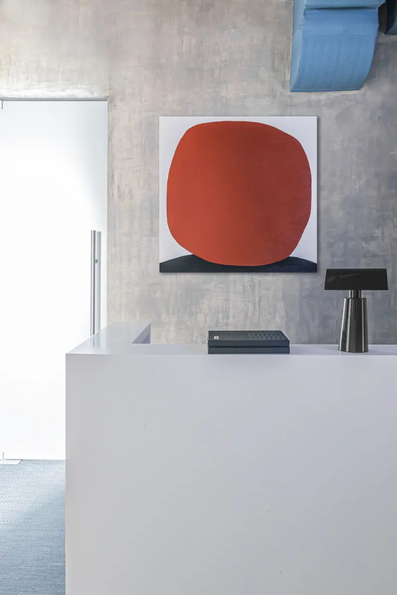 Наполнению переговорных было уделено особое внимание: в стены здесь интегрированы ниши с сидениями для отдыха, а мебель подбиралась мобильная. Абстрактная картина Олега Устинова сформировала легкую отсылку к ориентированной на детей сфере деятельности компании. Оживить строгую палитру помог контраст отделочных материалов – водостойкой краски, мягких звукопоглощающих панелей и декоративной штукатурки с имитацией бетона. Последняя также украсила входную зону с глянцевой стойкой ресепшн. Так, уже при входе в офис клиенты погружаются в деловую атмосферу и знакомятся с уникальным подходом «Лебер» к работе. Ощущение завершенности оформлению придают полотно художницы Кати Нечаевой и настольная лампа &Tradition.