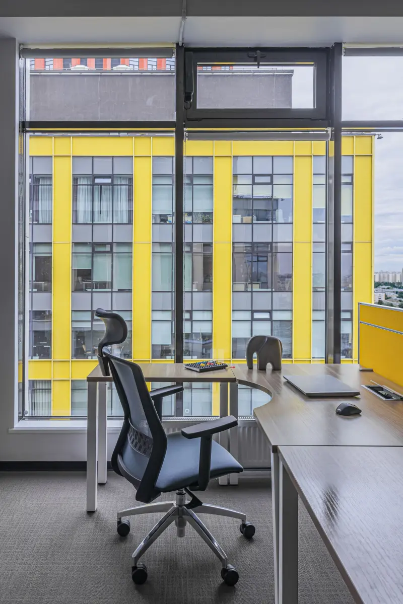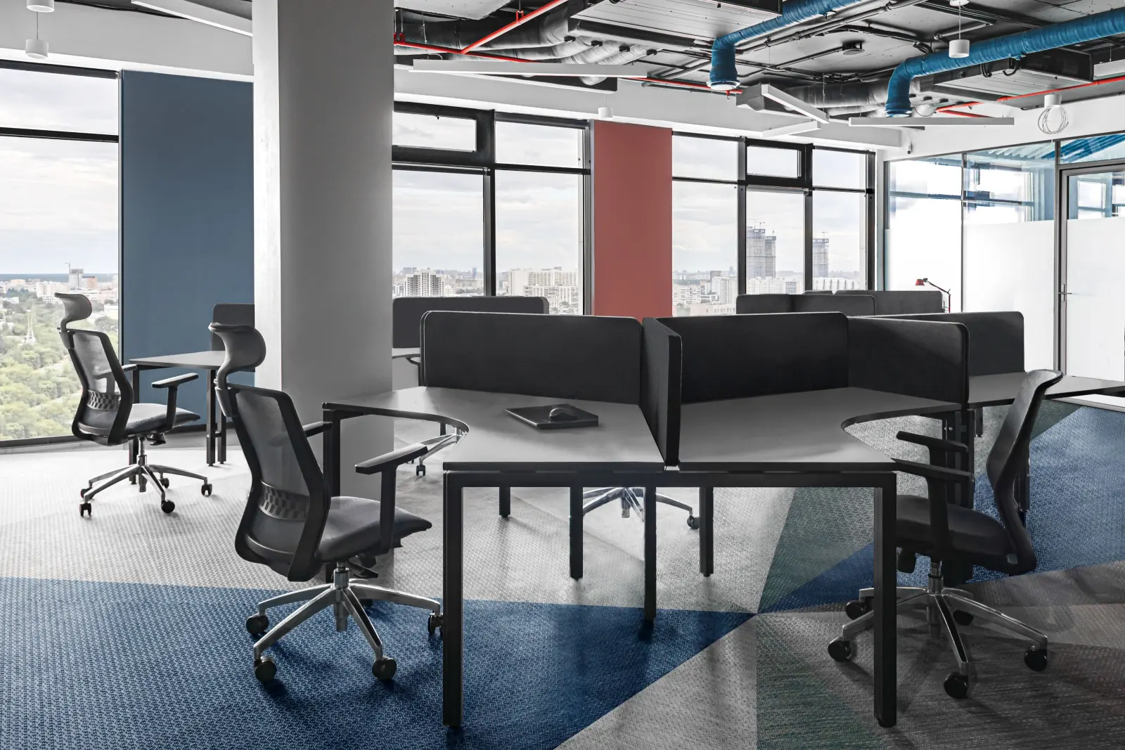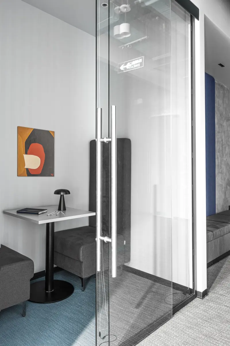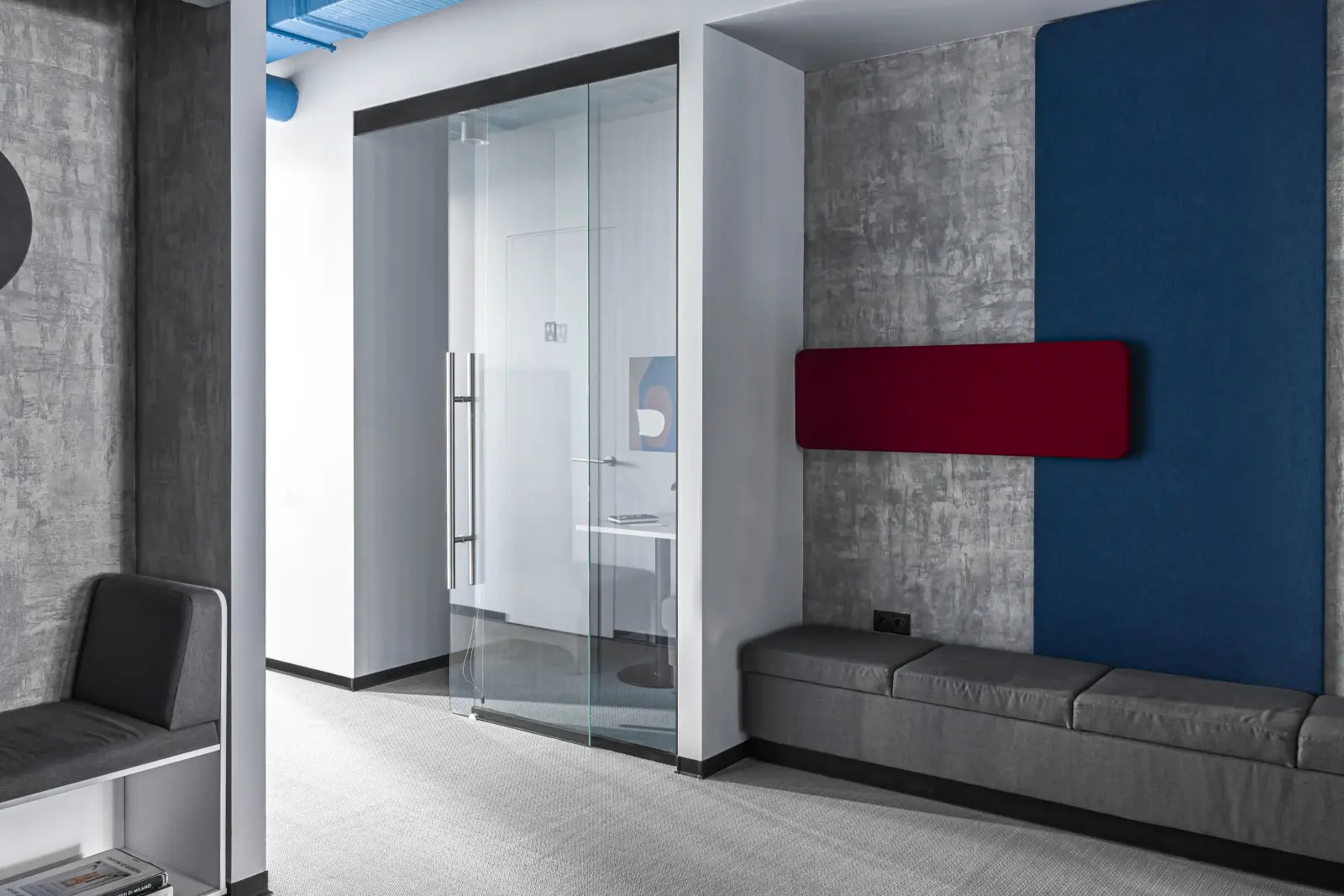 Команда студии «Точка дизайна» разработала красочный интерьер офиса для компании «Лебер» – российского поставщика и производителя детских игровых комплексов. Заказчики хотели получить нескучное оформление, которое будет комфортным для сотрудников и руководства, а также подчеркнет связь с ярким и функциональным дизайном для детей. Передать характер бренда помогли акцентные детали – строгие геометрические формы и насыщенные вкрапления глубоких синих и красных цветов. Фоном для них выступили располагающие к концентрации серые и графитовые оттенки. Главными составляющими дизайн-проекта стали продуманное зонирование, комбинированные рабочие места и разнообразные световые сценарии. Работа над проектом проходила легко и быстро. ««Точка дизайна» подготовила референсы, которые стали начальным этапом работы. Увидев их, мы внесли небольшие правки и сообщили команде студии о том, что нам нравится, а что не подходит. Также очень профессионально дизайн-студия подошла к определению вкуса заказчика, использовав для этого авторский опросник» — Артем Романович Сорокин, председатель совета директоров «Лебер».