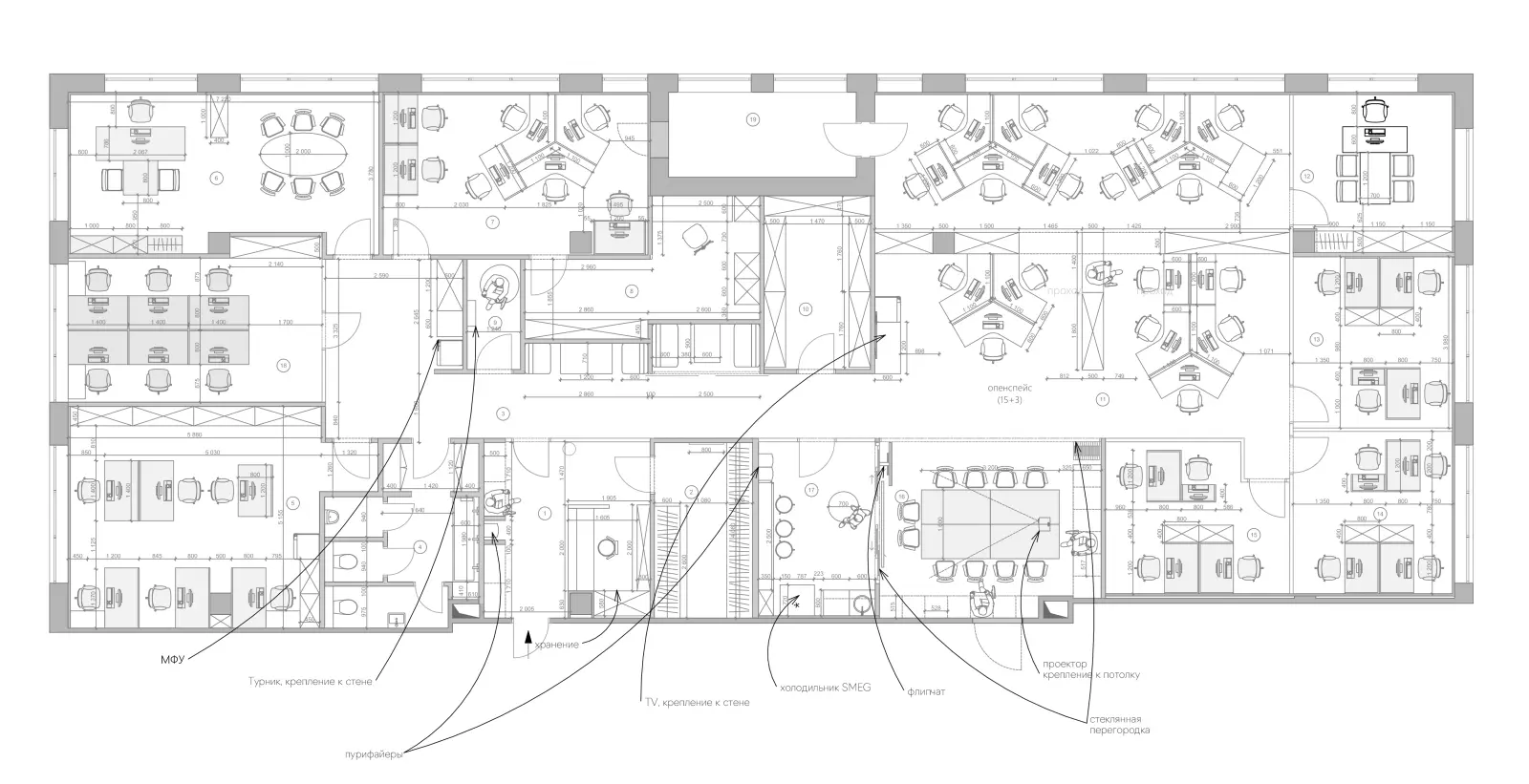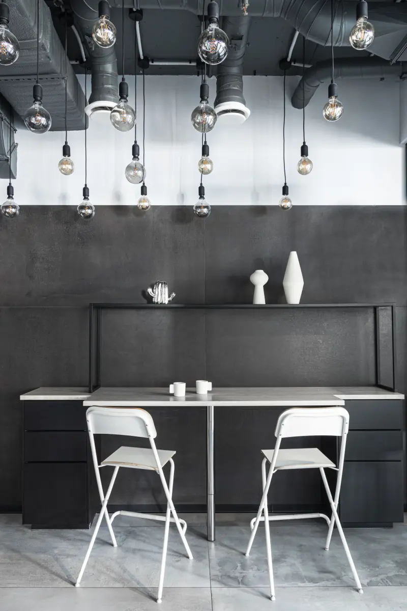 Самую освещенную часть помещения с высокими панорамными окнами занял большой опен-спейс с динамичными рабочими местами. Столы сложной формы были спроектированы на заказ и изготовлены на собственном производстве компании «Лебер»: благодаря их необычной конструкции у каждого сотрудника появилось личное пространство, в которое приятно возвращаться каждый день. Весь этот блок Марк Яворский предложил сделать трансформируемым за счет примыкающей переговорной комнаты и небольшой кухни. Их можно легко объединить с основным пространством благодаря стеклянным перегородкам в графичных рамах: при необходимости они разворачиваются и сдвигаются по одной линии, не нарушая целостности оформления. Контрастная кухня, по желанию клиента, решена в стиле лофт. Ее доминантой выступила система подвесных светильников, формирующих эффектную «волну». Обволакивающую атмосферу поддерживают покрытые черной краской Dulux стены и потолки, которые оказались безупречной базой для пары белых стульев IKEA. Компактный гарнитур с темными шкафами и необходимой бытовой техникой тоже был выполнен по авторским эскизам, а подбором декора брендов Ferm living, GK Concept и Chairo home занималась Дарья Ишкараева. В другой половине офиса расположилось крыло руководства, соседствующее с кабинетами бухгалтеров и юристов. В отличие от опен-спейса, потолки в них частично закрыты ГКЛ: так интерьер кажется более спокойным и привычным опытным работникам. Эта идея Варвары Чесноковой стала узнаваемой фишкой офиса, добавляя динамики даже самым сдержанным зонам.