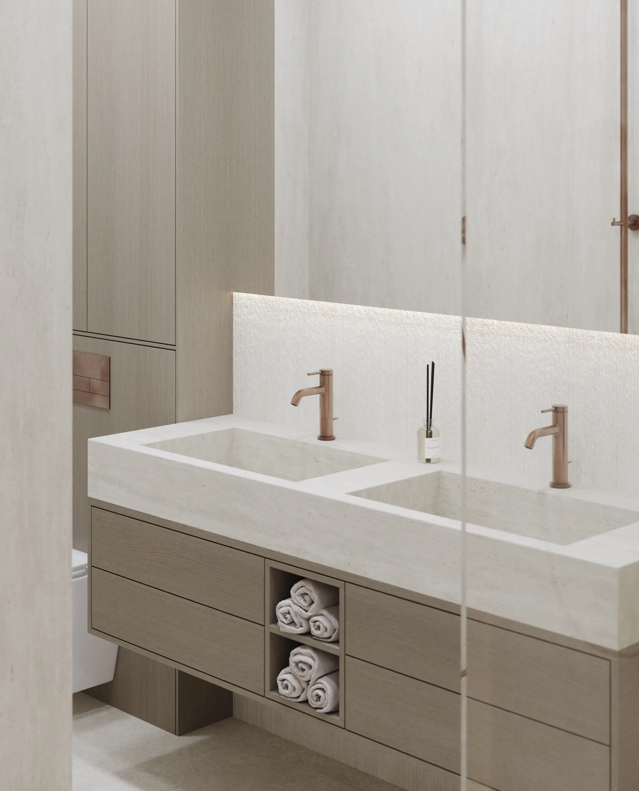 Одновременно преимуществом и вызовом стали многочисленные панорамные окна, которые клиент хотел сохранить открытыми, не загромождая мебелью. Из окон открывается впечатляющий вид на Москву и воду, и мы сделали его полноценной частью интерьера.